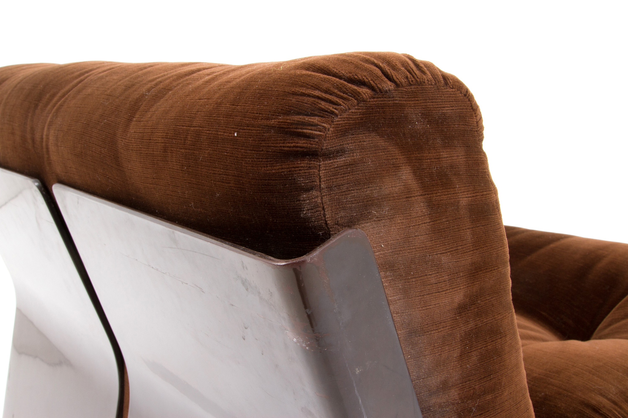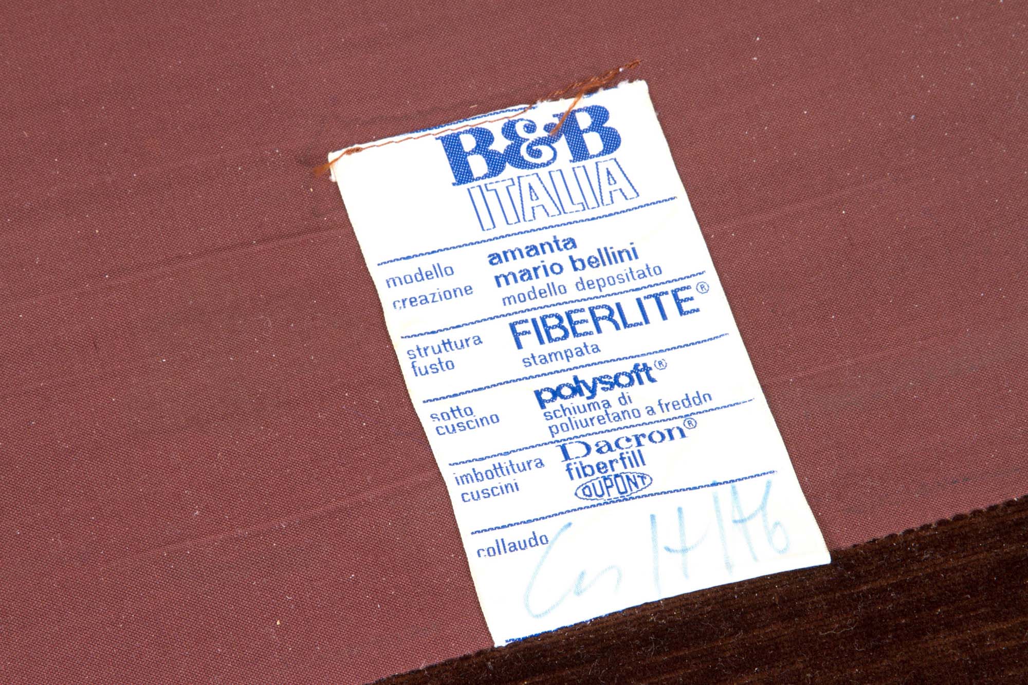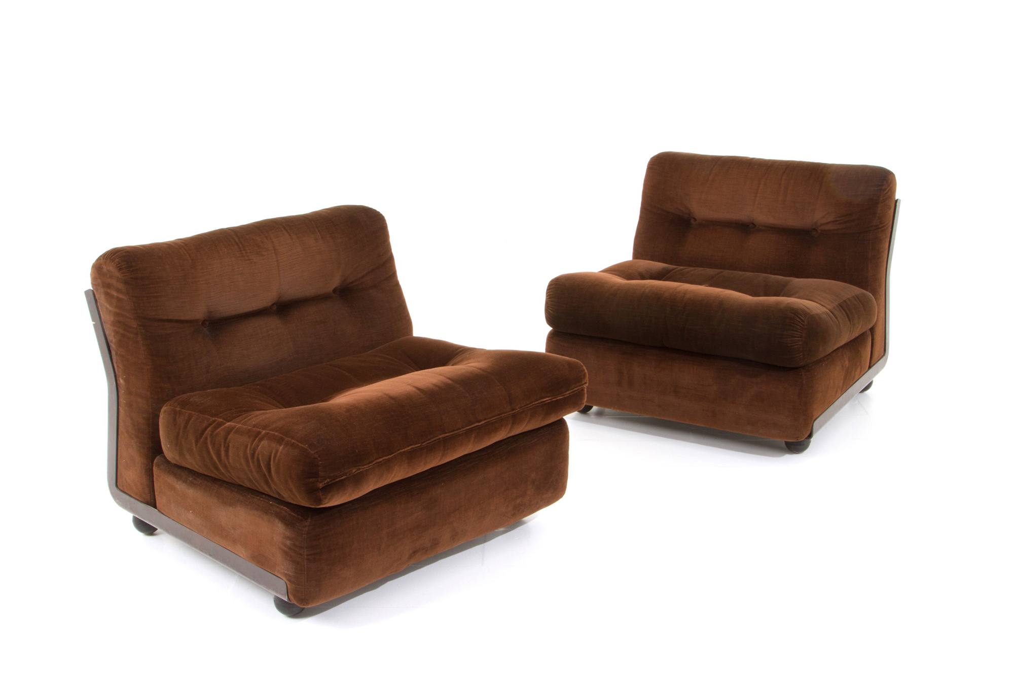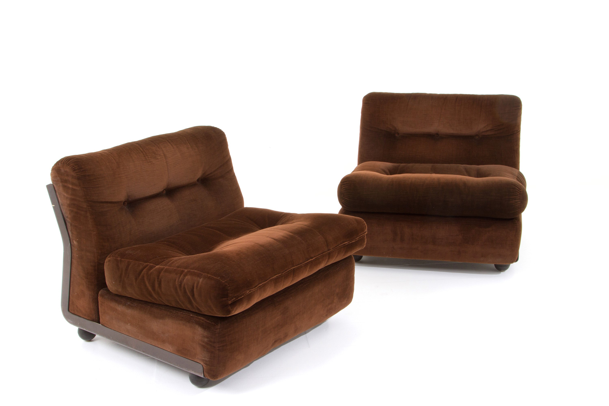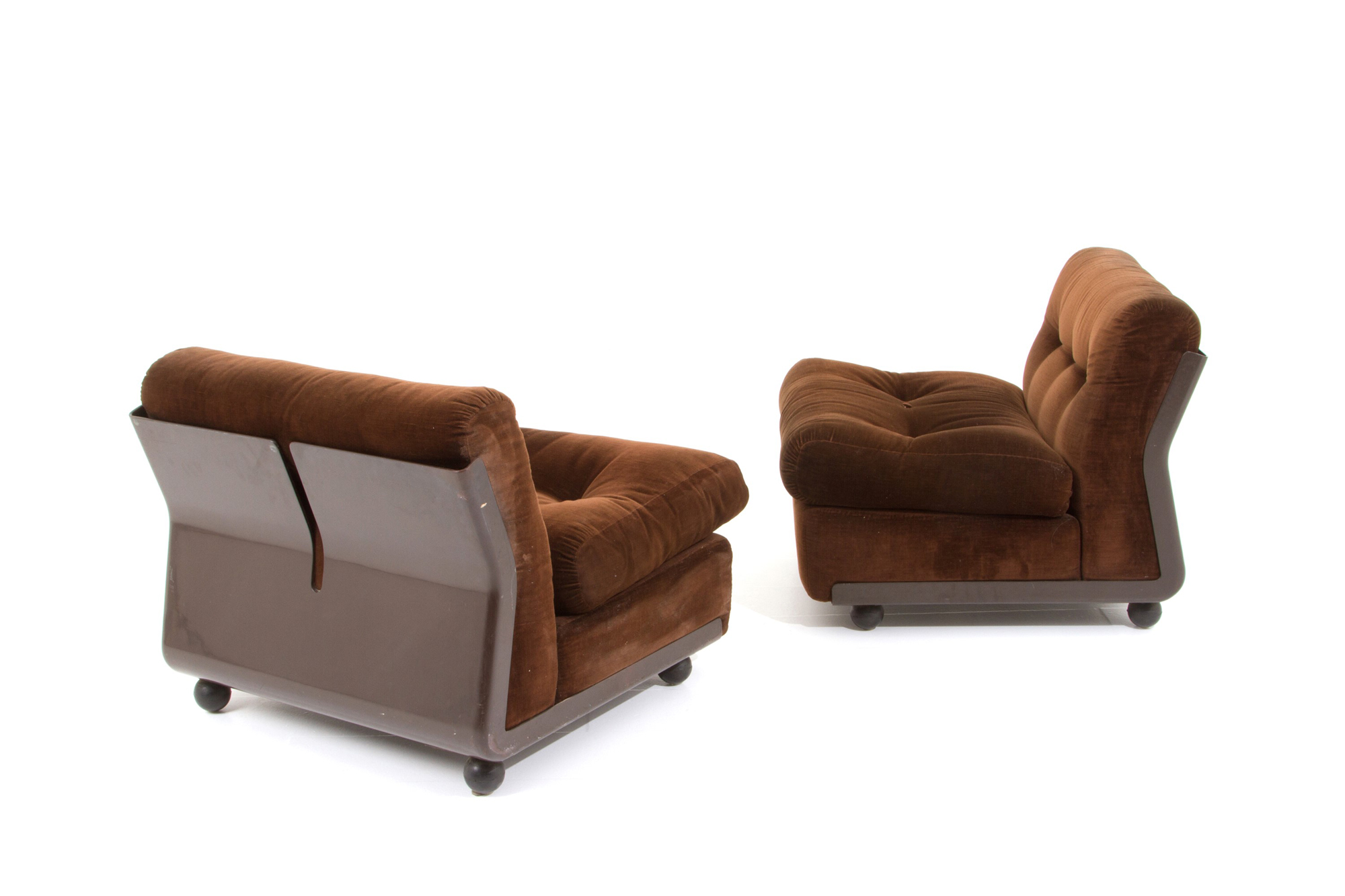 MARIO BELLINI (Milano 1935). Two Amanta armchairs in brown velvet. B&B ITALIA production. Marked on the bottom. 1976. Minor flaws. MARIO BELLINI (Milano 1935). Due poltrone Amanta in velluto marrone. Produzione B&B ITALIA. Marcate sul fondo. 1976. Lievi difetti.
