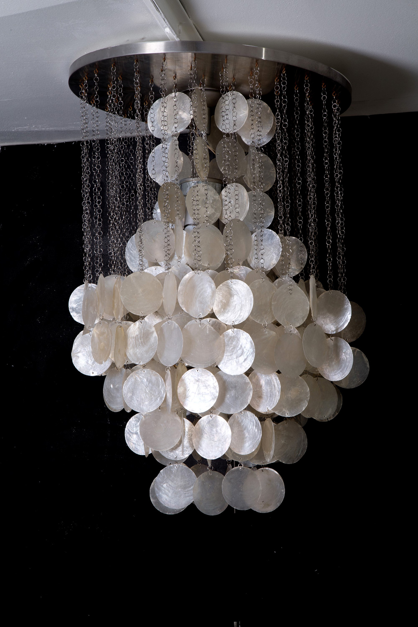 VERNER PANTON (Gamtofte Parish 1926-Copenhagen 1998). Suspension lamp in steel and mother of pearl. 60-70s. 80x50cm approx. VERNER PANTON (Gamtofte Parish 1926-Copenhagen 1998). Lampadario a sospensione in acciaio e madreperla. Anni '60-70. 80x50 cm ca.