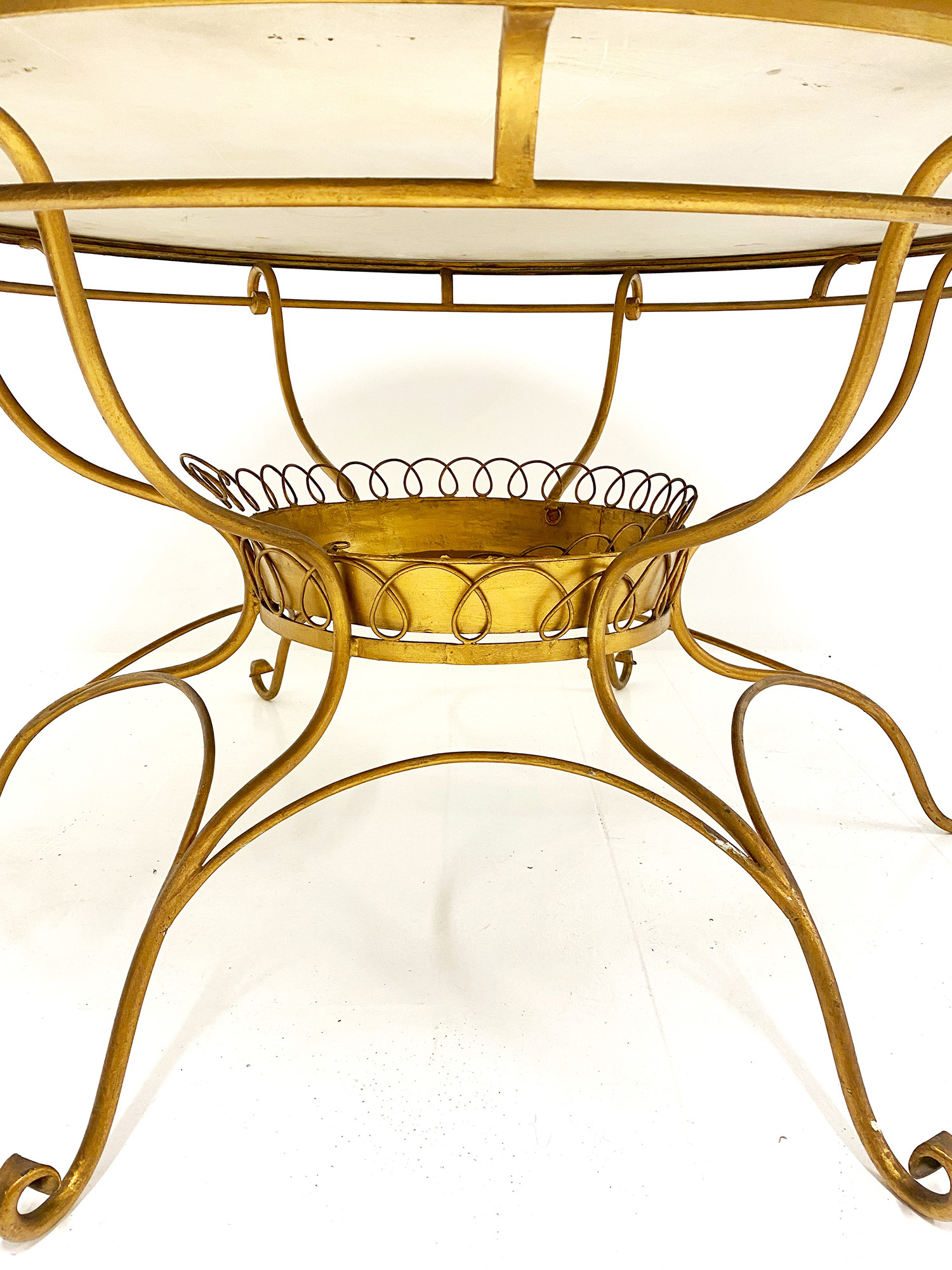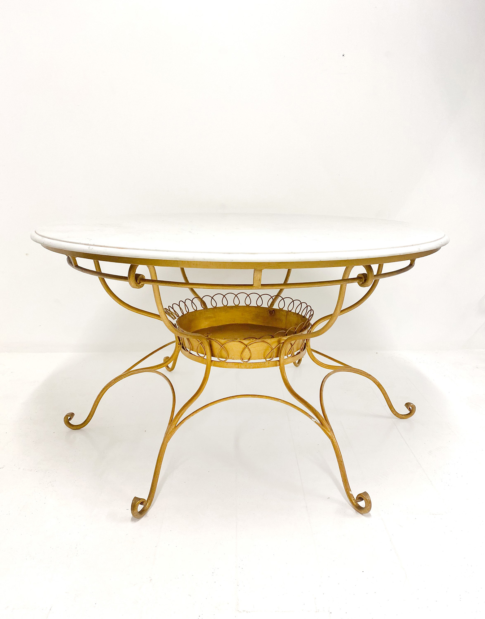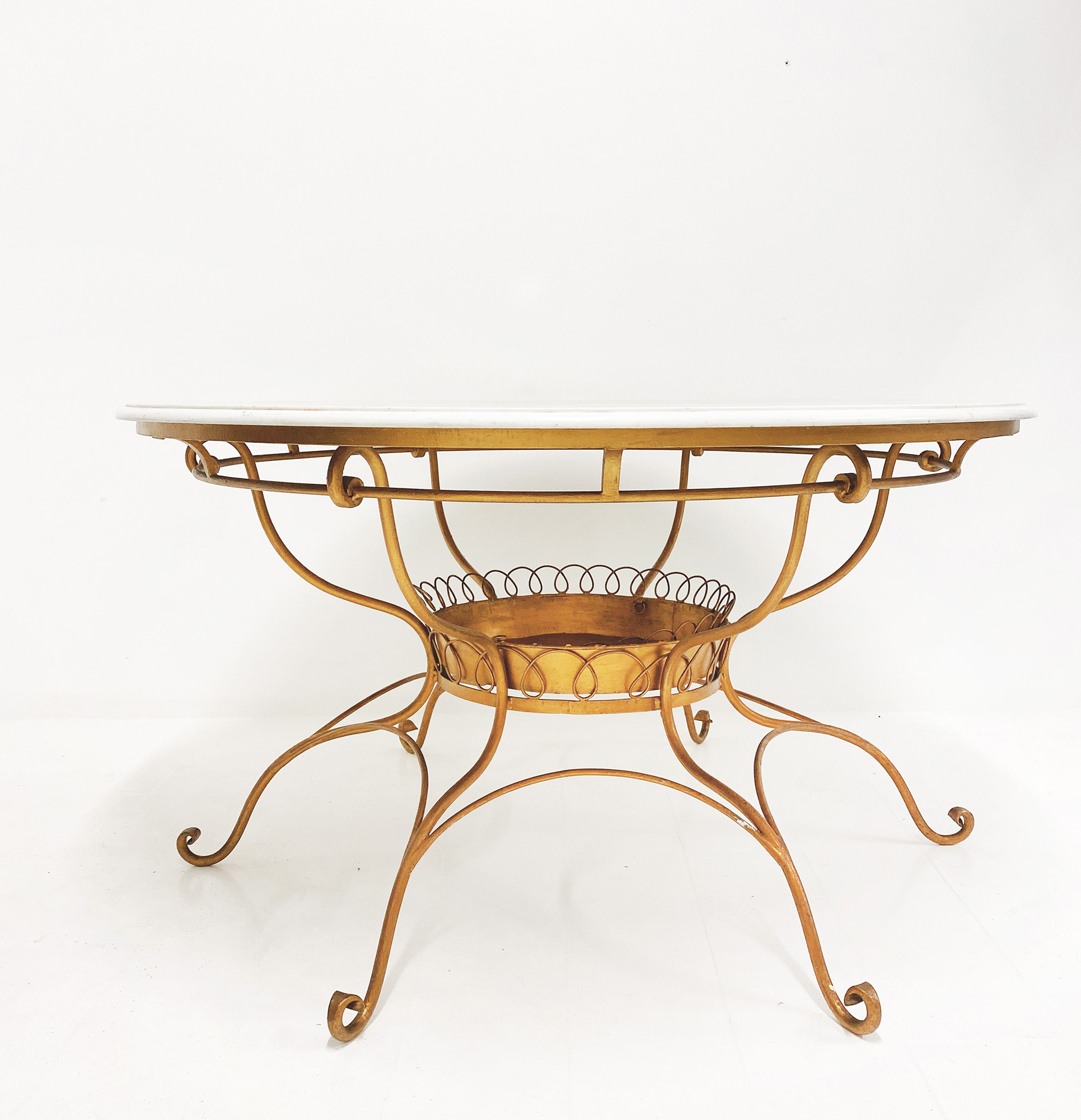 Round table with white marble top supported by wrought iron legs. 20th century. 73.5x132cm approx. Tavolo rotondo con piano in marmo bianco sostenuto da gambe in ferro battuto. XX secolo. 73,5x132 cm ca.