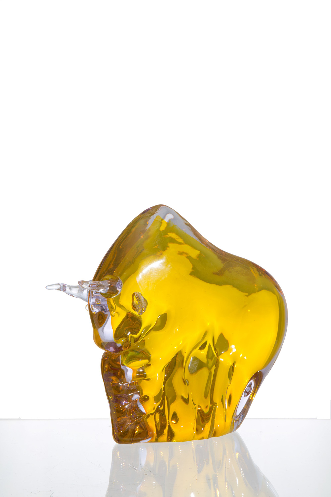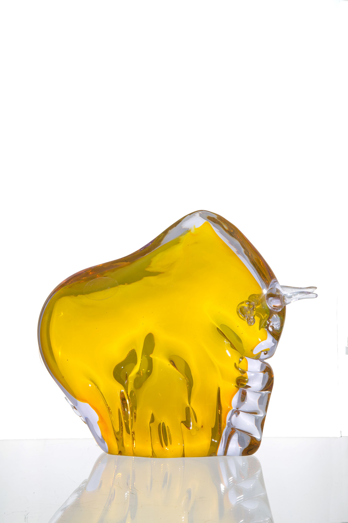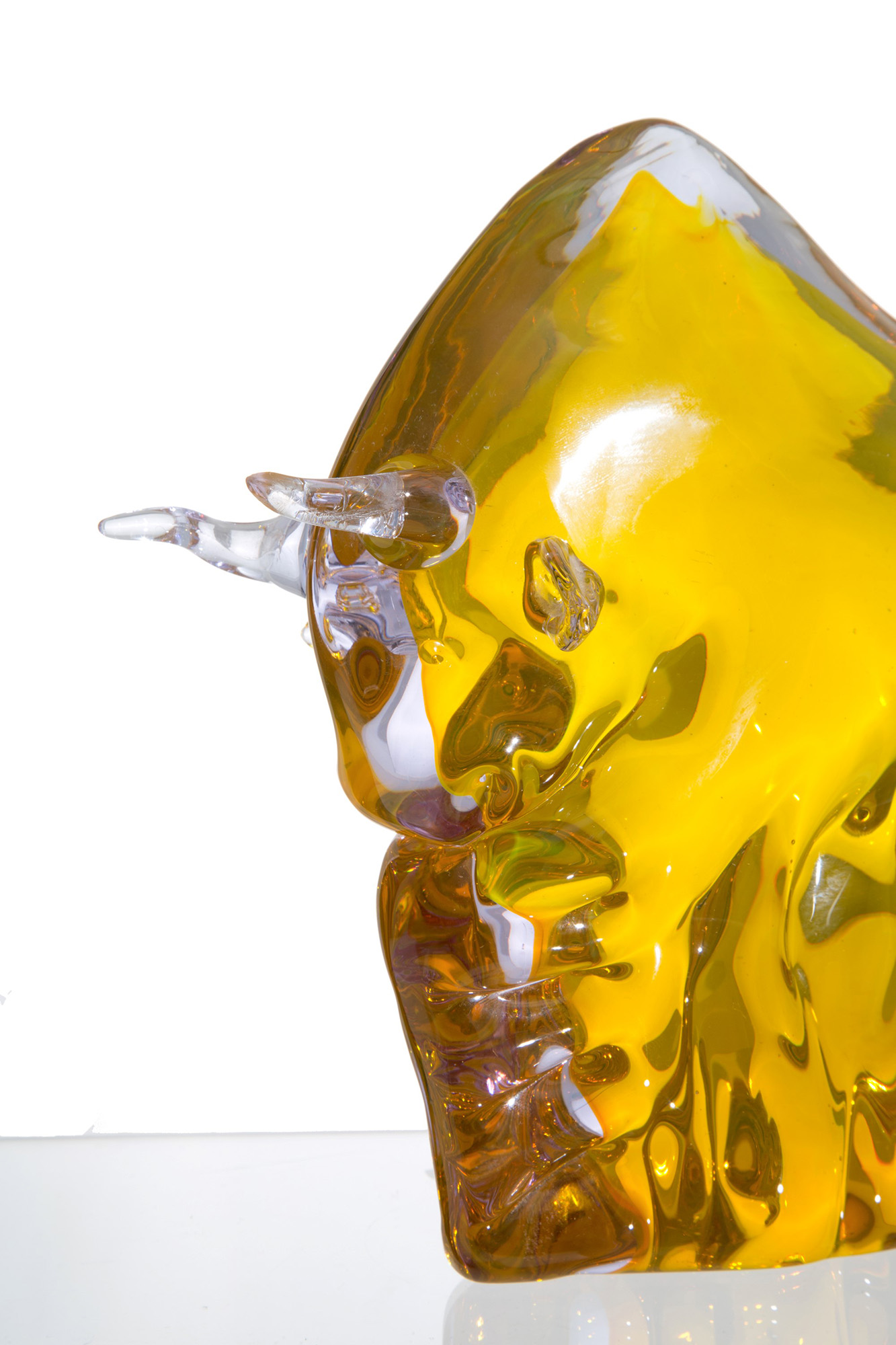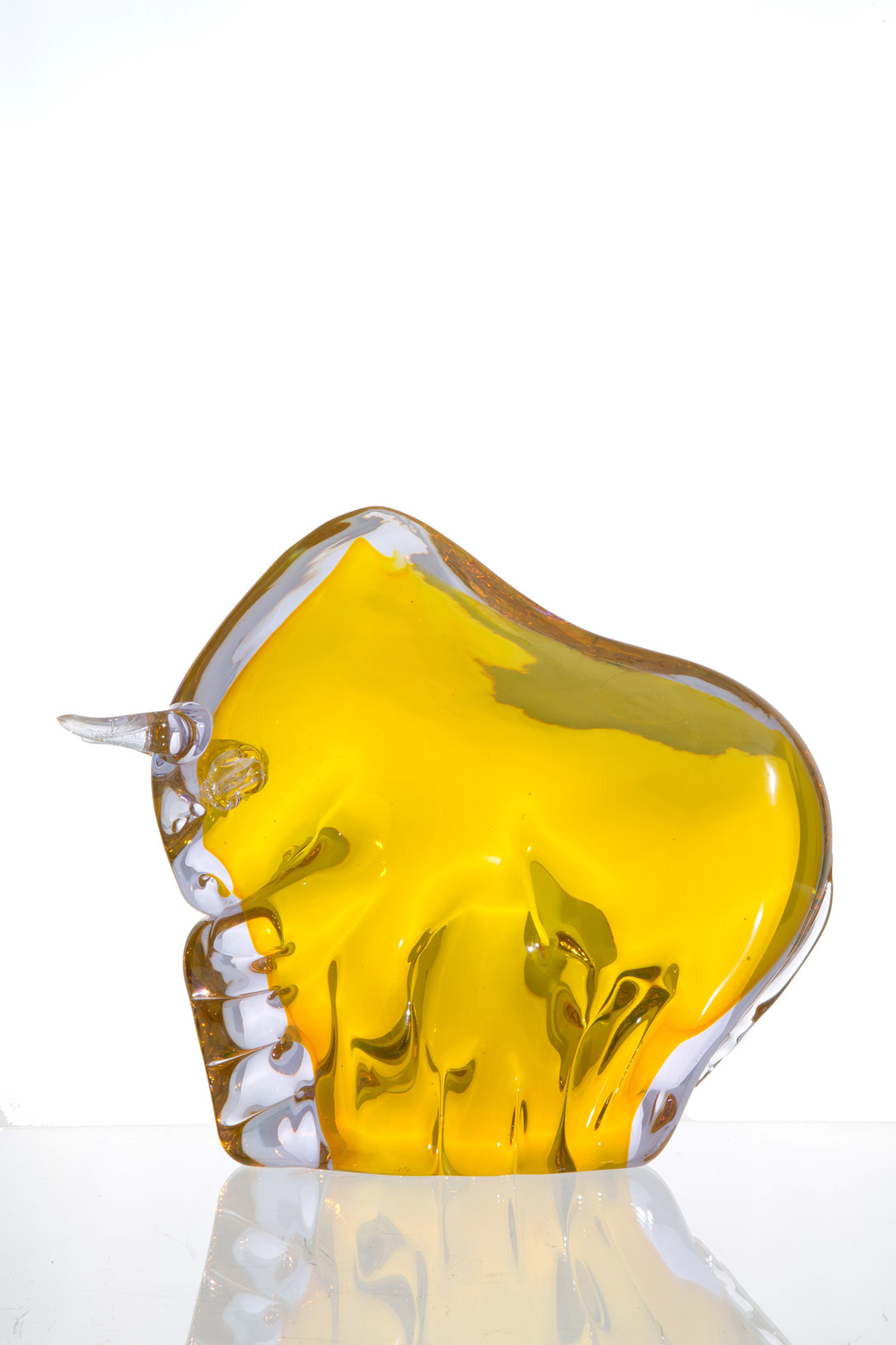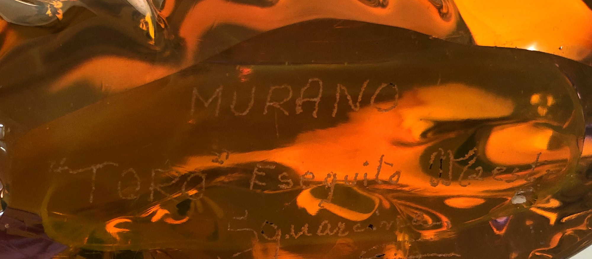 Murano glass sculpture entitled "BULL". With 'Murano "TORO" written by maestro SQUARCINA' on the bottom.