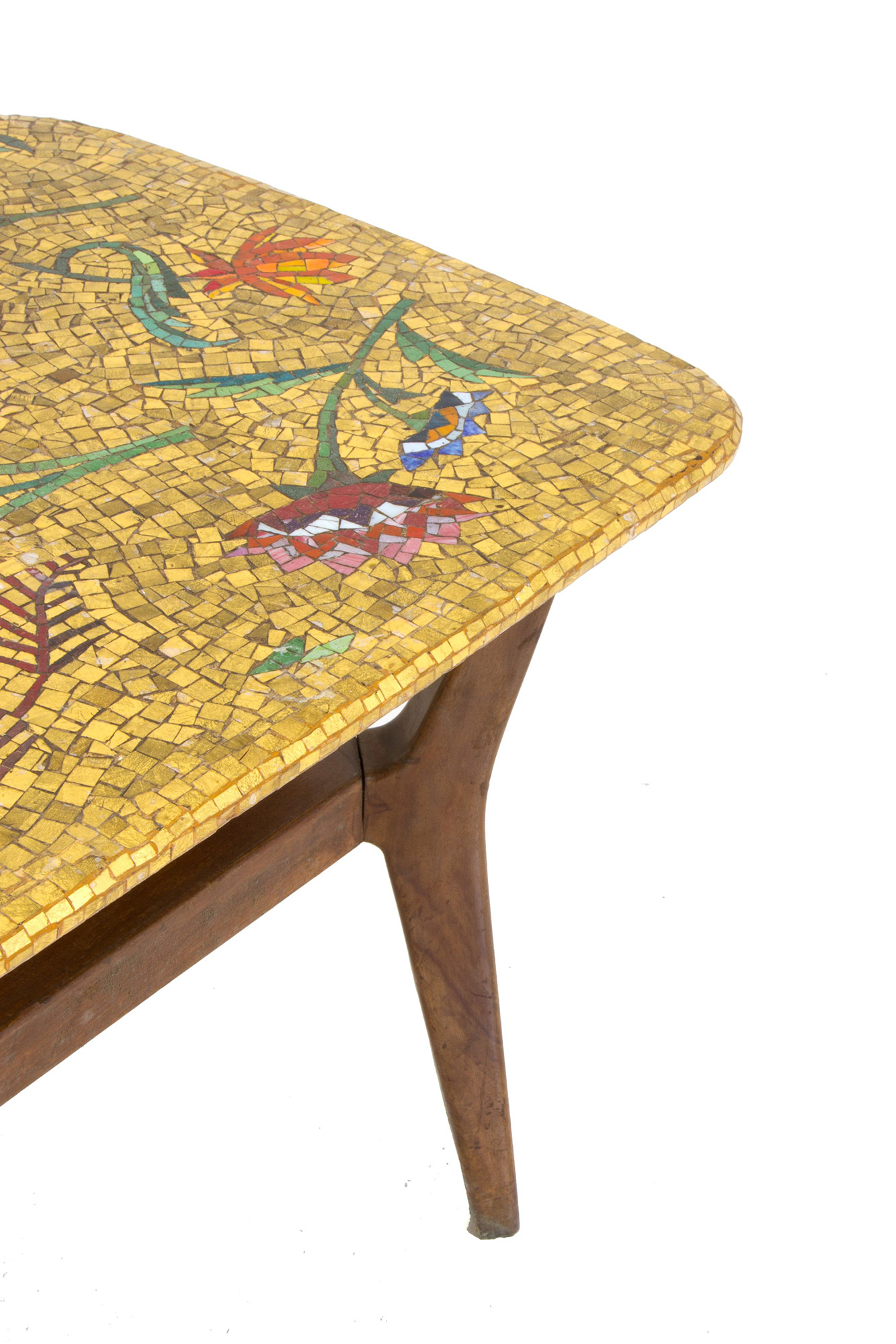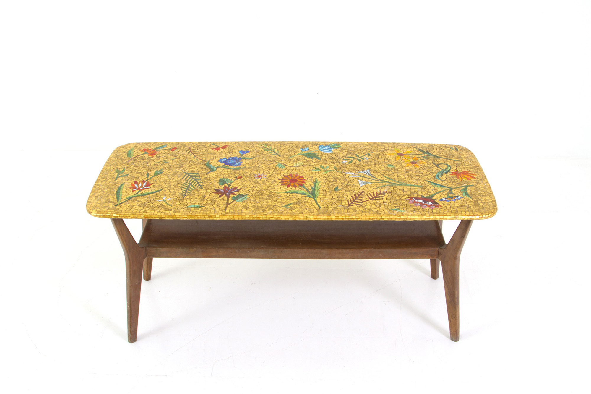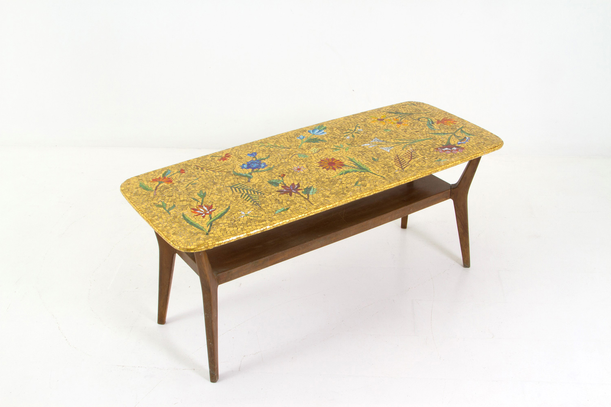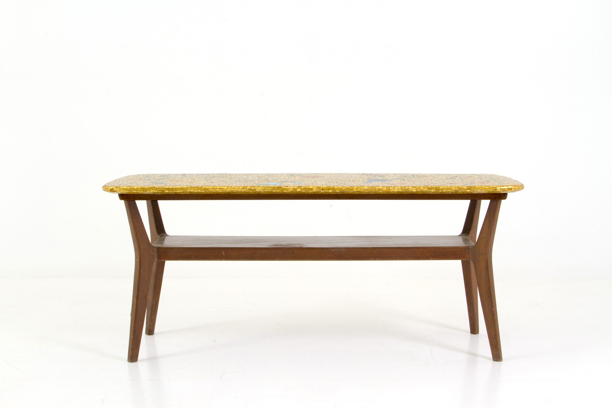 Wooden coffee table with mosaic top. 50s. 51x120x48cm approx. Tavolino in legno con piano in mosaico. Anni '50. 51x120x48 cm ca.