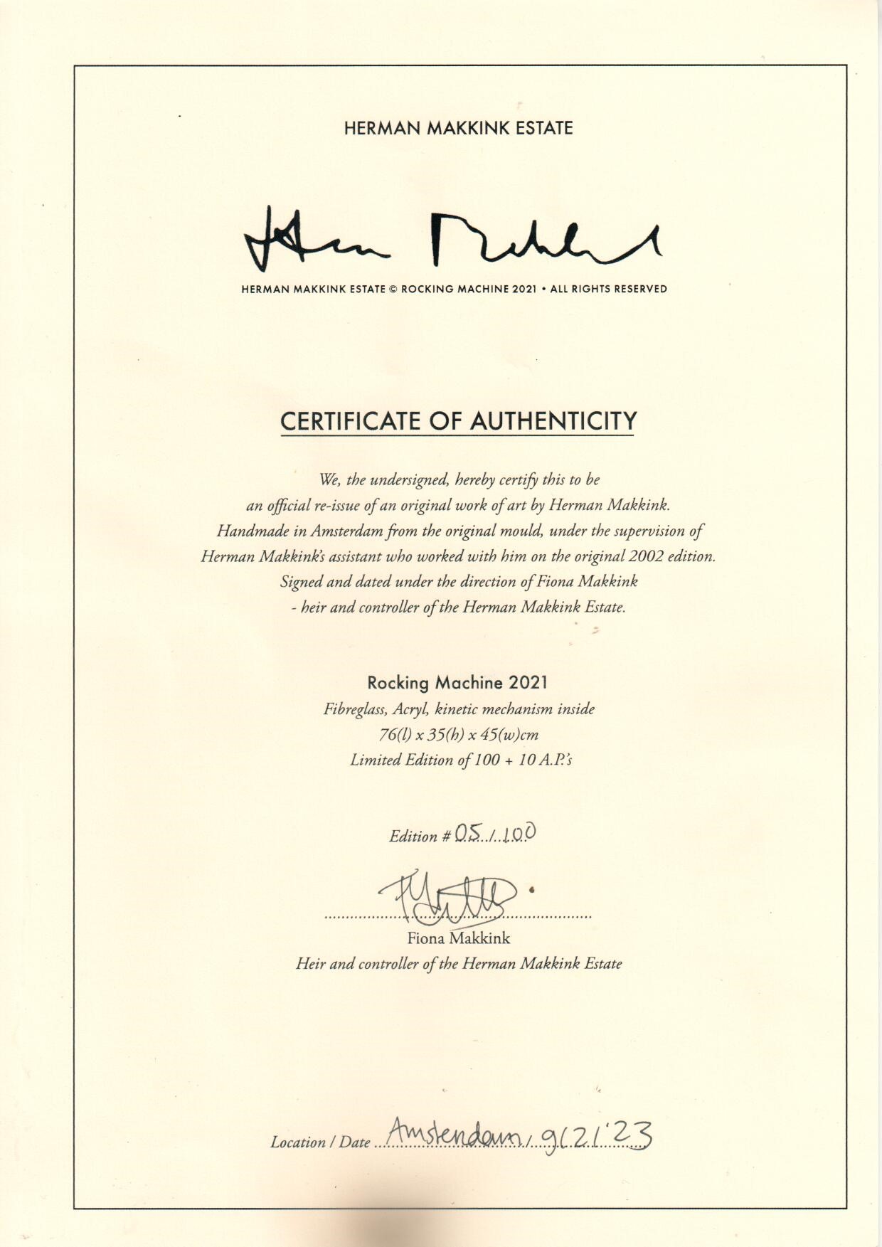 HERMAN MAKKINK (Winschoten 1937-Suffolk 2013). Rocking Machine 2021 fiberglass sculpture with kinetic mechanism inside. Signed and dated inside the flap. Reissue of the original that became famous for Stanley Kubrick's film A Clockwork Orange. Example 5/100. With certificate of authenticity from the Herman Makkink Estate. 35x76x45cm approx. HERMAN MAKKINK (Winschoten 1937-Suffolk 2013). Scultura in vetroresina Rocking Machine 2021 con meccanismo cinetico all'interno. Firmata e datata all'interno dello sportello. Riedizione dell'originale divenuto celebre per il film Arancia Meccanica di Stanley Kubrick. Esemplare 5/100. Con certificato di autenticità della Herman Makkink Estate. 35x76x45 cm ca.