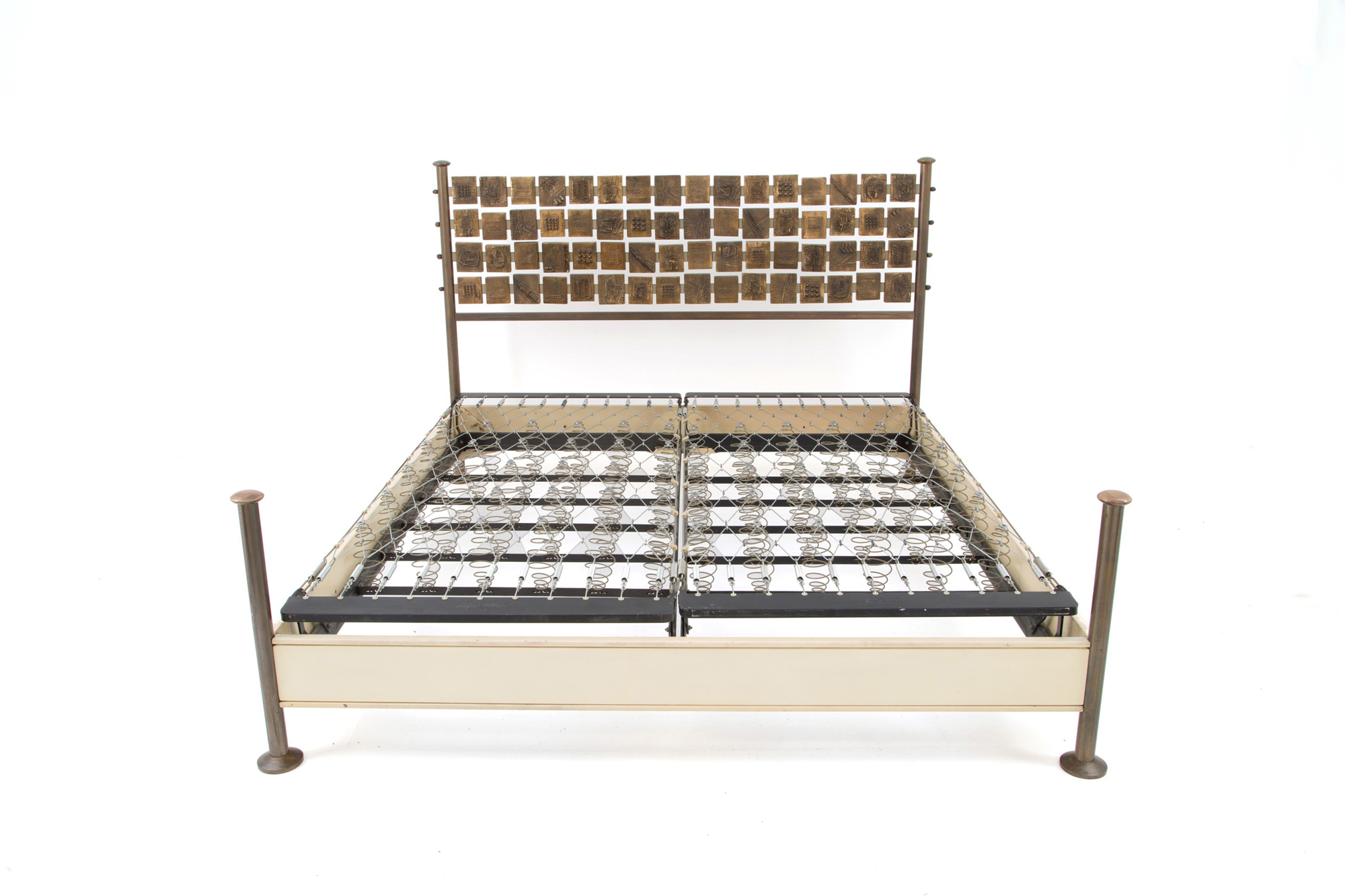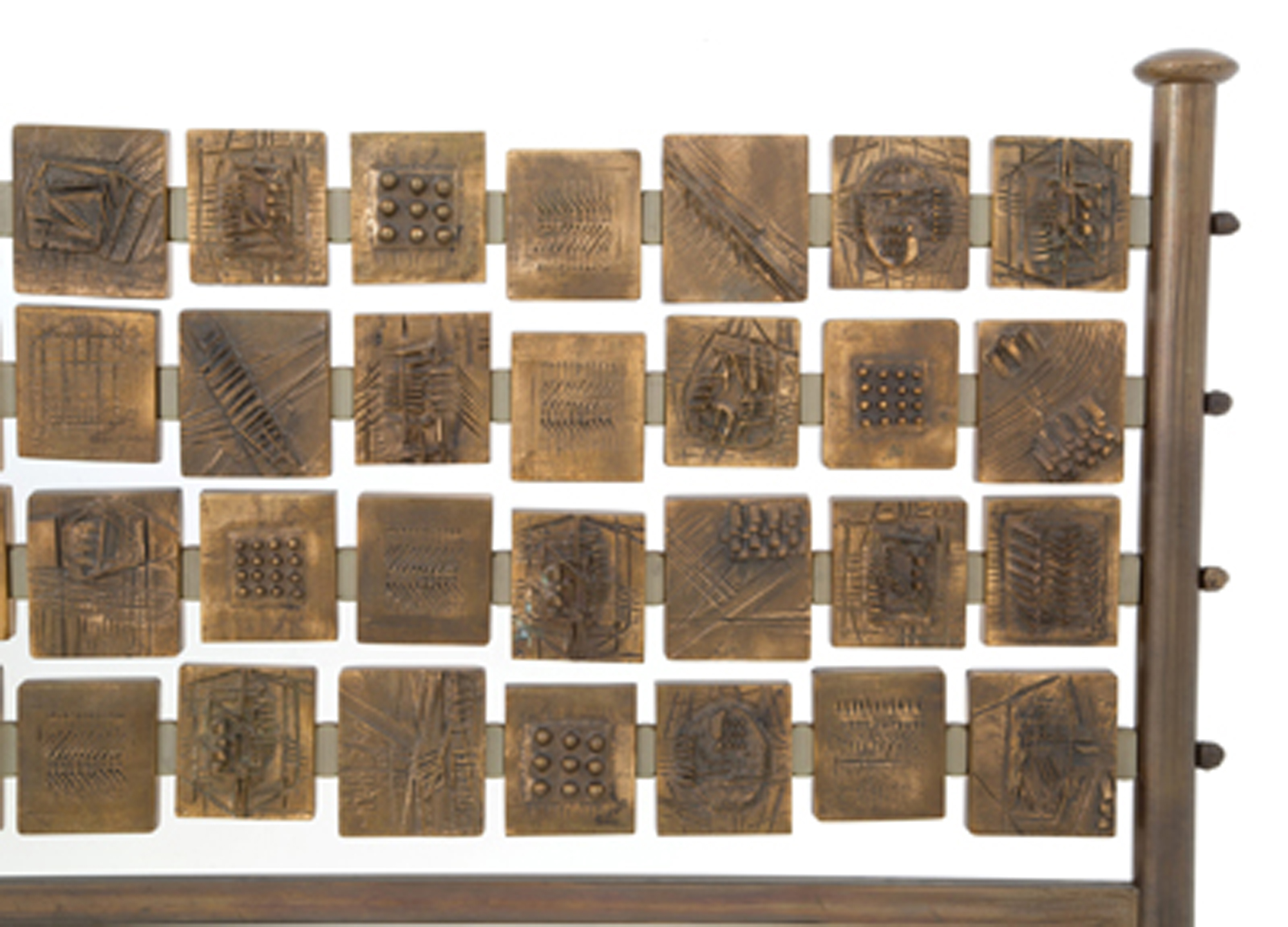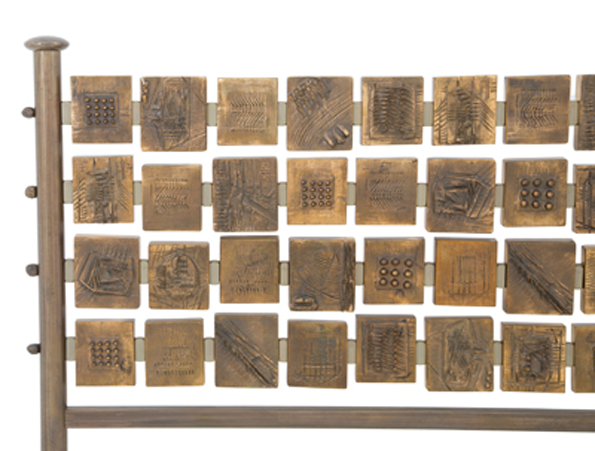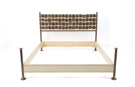 GIO' POMODORO (Orciano di Pesaro, 1930 - Milano, 2002), ARNALDO POMODORO (Morciano di Romagna, 1926) and OSVALDO BORSANI (Varedo,1911 - Milano, 1985). Bed with enamelled metal structure with headboard made up of sixty-four bas-relief tiles in bronze with different decorations. Production ARREDAMENTI BORSANI VAREDO. 1959. With original nets. With confirmation of authenticity from the Osvaldo Borsani Archive, the Arnaldo Pomodoro Foundation and the Gio' Pomodoro Archive. 124x187x210 cm approx. GIO' POMODORO (Orciano di Pesaro, 1930 - Milano, 2002), ARNALDO POMODORO (Morciano di Romagna, 1926) e OSVALDO BORSANI (Varedo,1911 - Milano, 1985). Letto con struttura in metallo smaltato con testiera composta da sessantaquattro formelle a bassorilievo in bronzo con decori differenti. Produzione ARREDAMENTI BORSANI VAREDO. 1959. Con reti originali. Con conferma di autenticità dell'Archivio Osvaldo Borsani, della Fondazione Arnaldo Pomodoro e dell'Archivio Gio' Pomodoro.124x187x210 cm ca.