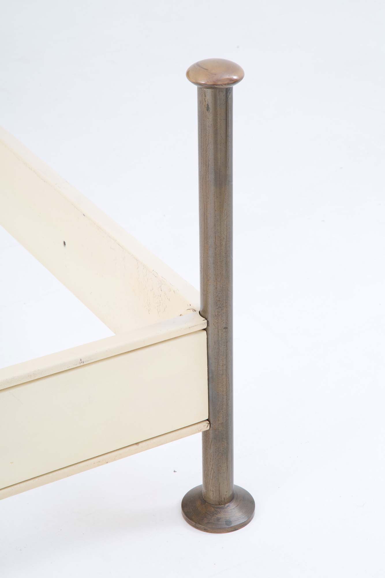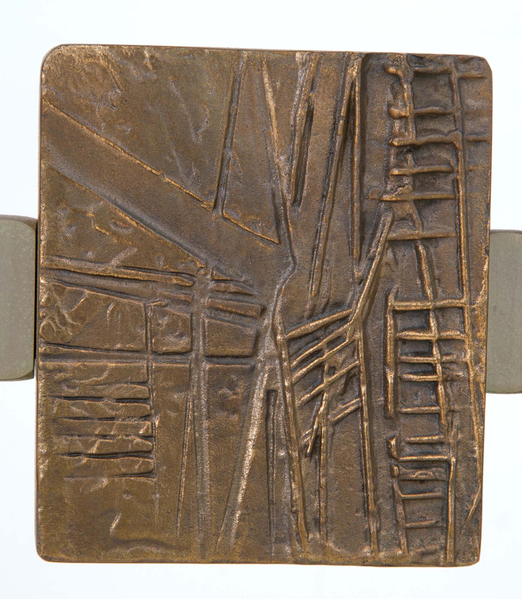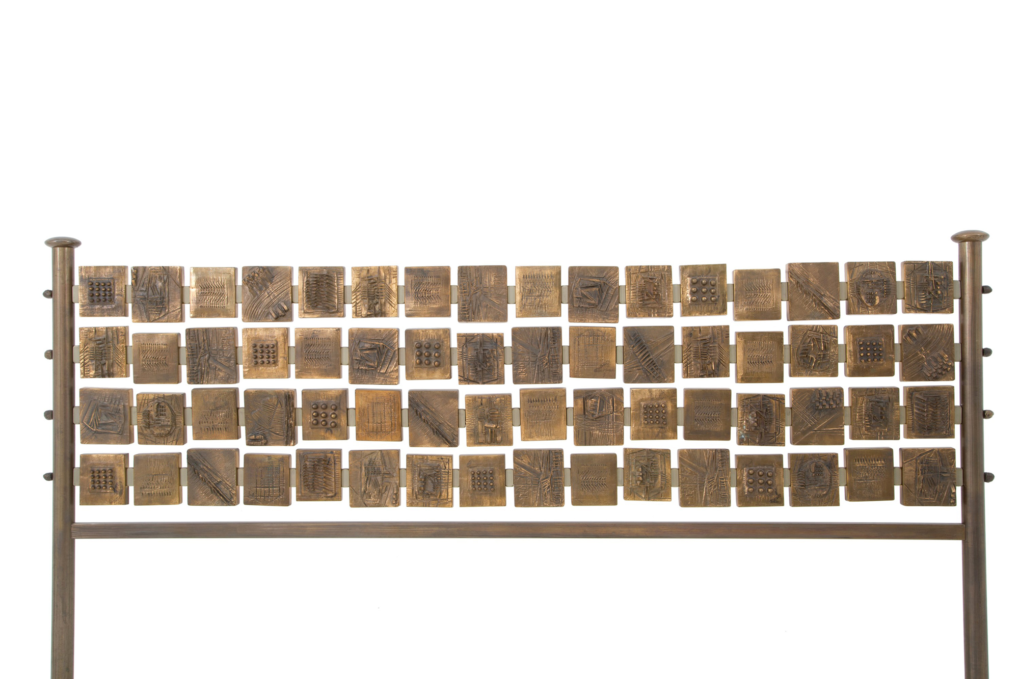 GIO' POMODORO (Orciano di Pesaro, 1930 - Milano, 2002), ARNALDO POMODORO (Morciano di Romagna, 1926) and OSVALDO BORSANI (Varedo,1911 - Milano, 1985). Bed with enamelled metal structure with headboard made up of sixty-four bas-relief tiles in bronze with different decorations. Production ARREDAMENTI BORSANI VAREDO. 1959. With original nets. With confirmation of authenticity from the Osvaldo Borsani Archive, the Arnaldo Pomodoro Foundation and the Gio' Pomodoro Archive. 124x187x210 cm approx. GIO' POMODORO (Orciano di Pesaro, 1930 - Milano, 2002), ARNALDO POMODORO (Morciano di Romagna, 1926) e OSVALDO BORSANI (Varedo,1911 - Milano, 1985). Letto con struttura in metallo smaltato con testiera composta da sessantaquattro formelle a bassorilievo in bronzo con decori differenti. Produzione ARREDAMENTI BORSANI VAREDO. 1959. Con reti originali. Con conferma di autenticità dell'Archivio Osvaldo Borsani, della Fondazione Arnaldo Pomodoro e dell'Archivio Gio' Pomodoro.124x187x210 cm ca.