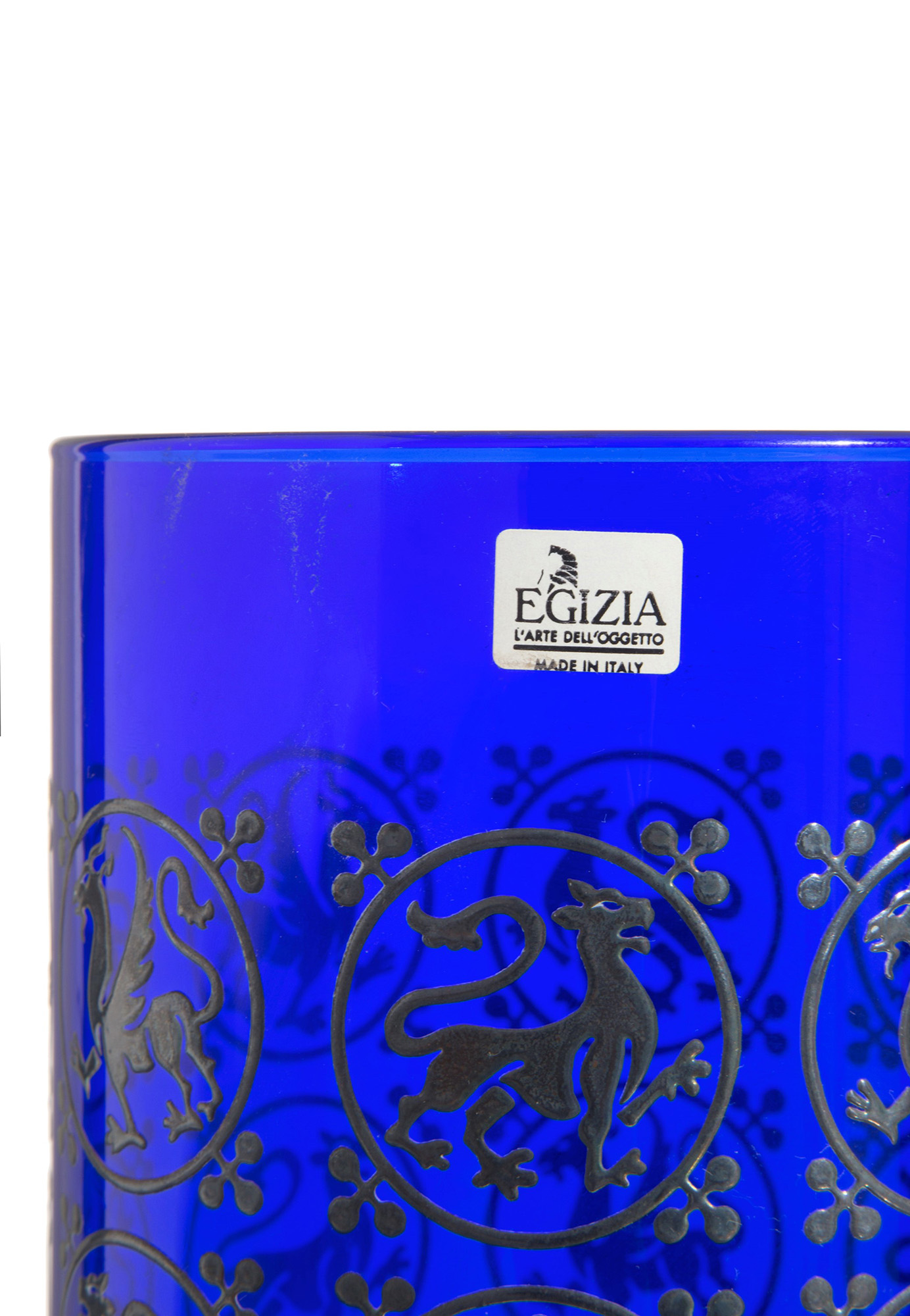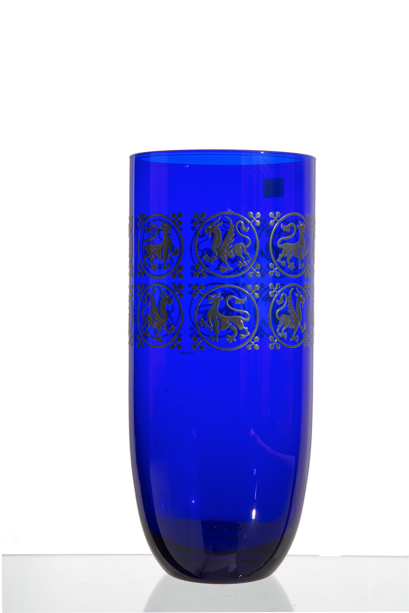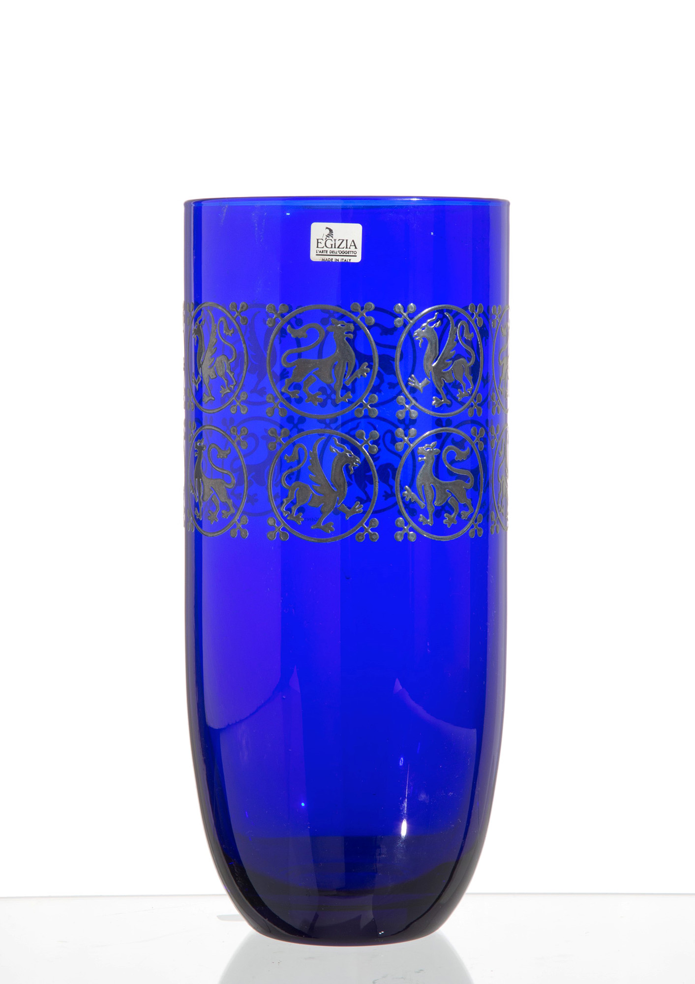 ETTORE SOTTSASS (Innsbruck 1917-Milano 2007). Cobalt blue glass vase with silver reliefs depicting "FANTASTIC ANIMALS". With manufacturer's label. Height 31cm approx ETTORE SOTTSASS (Innsbruck 1917-Milano 2007). Vaso in vetro blu cobalto con rilievi in argento raffiguranti "ANIMALI FANTASTICI". Con etichetta del produttore. Alt. 31 cm ca