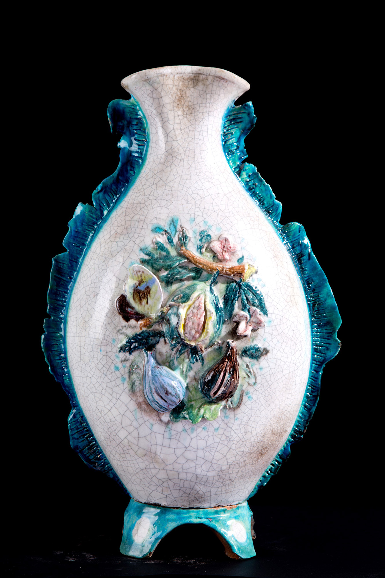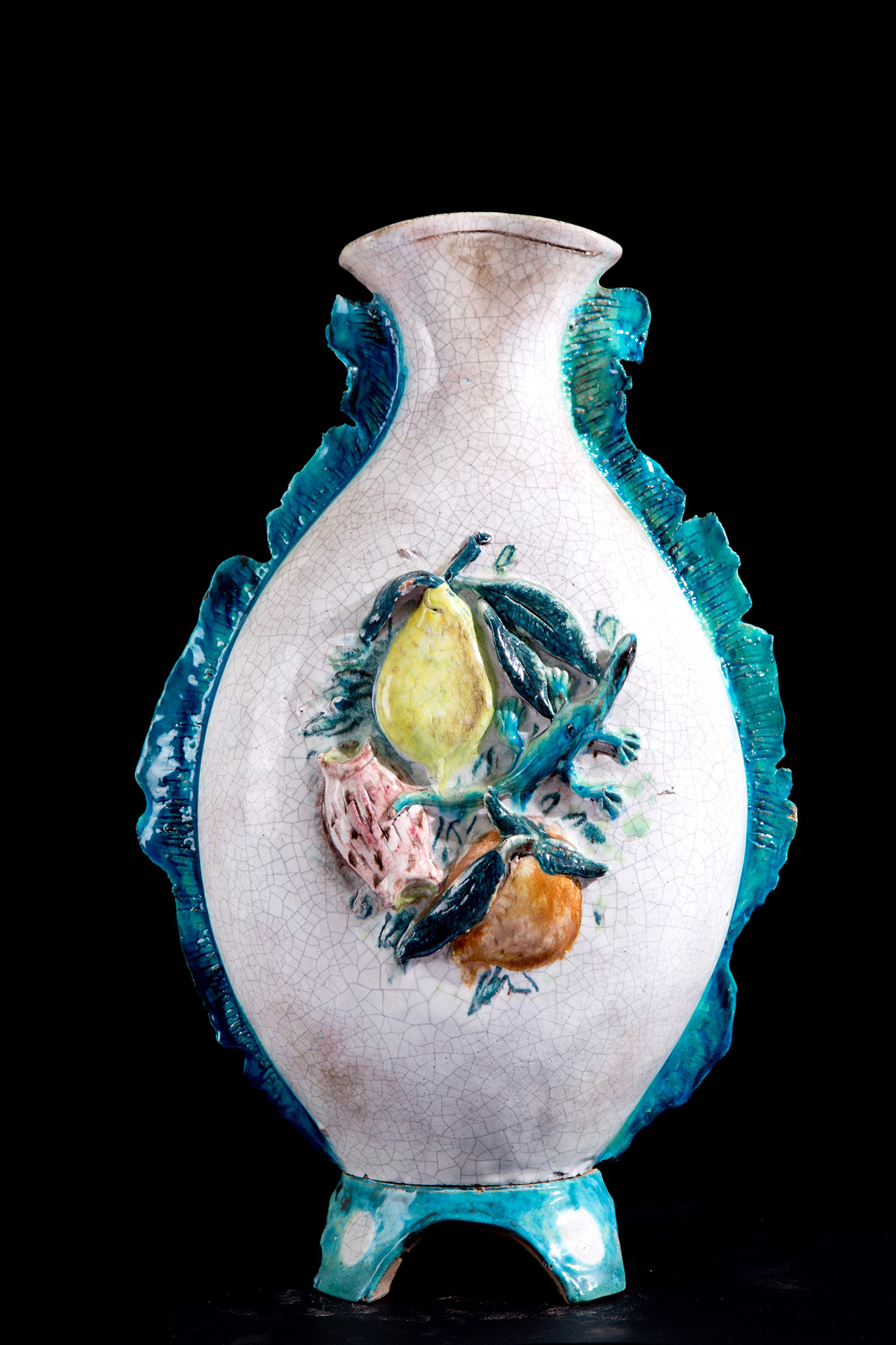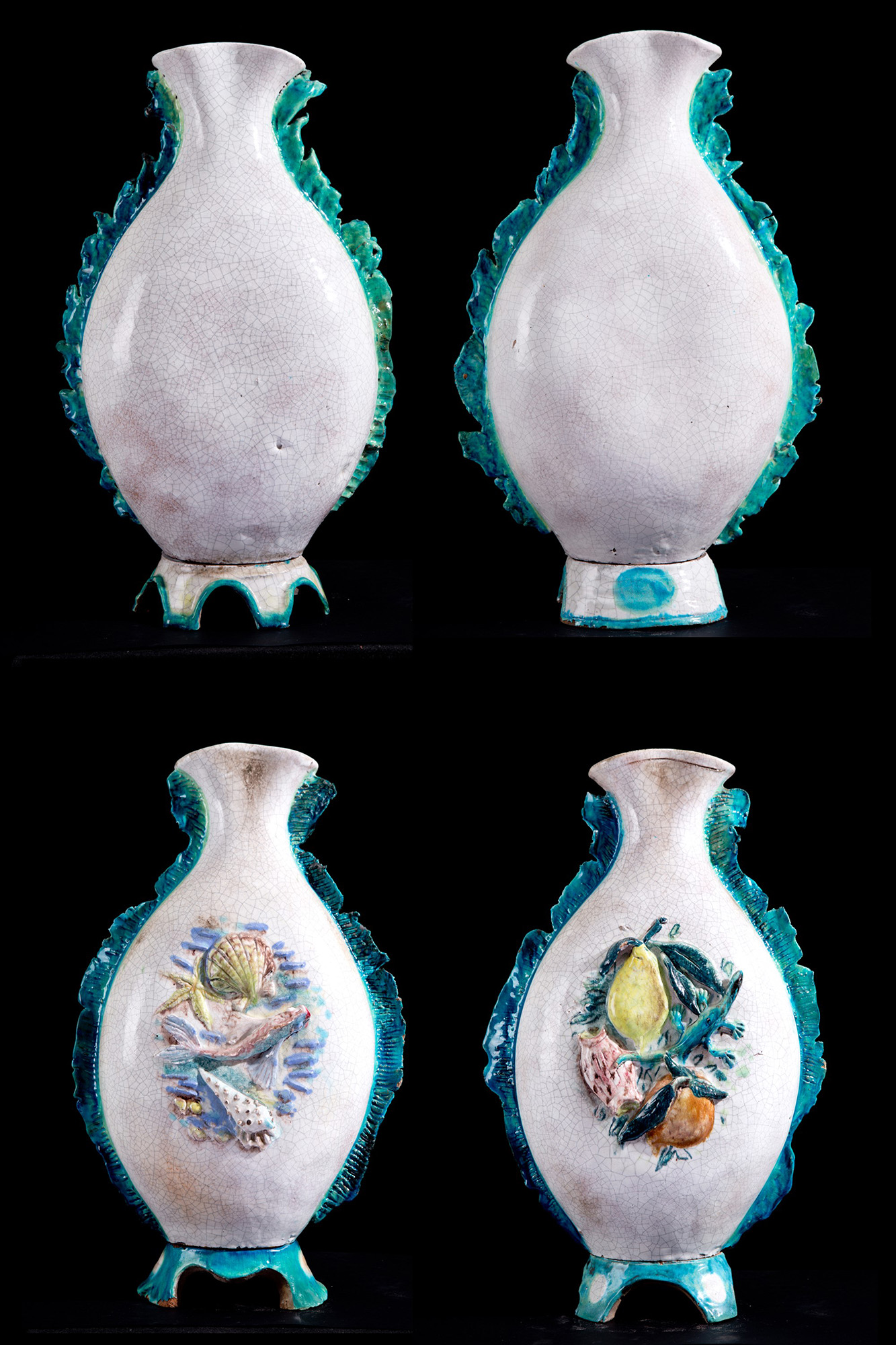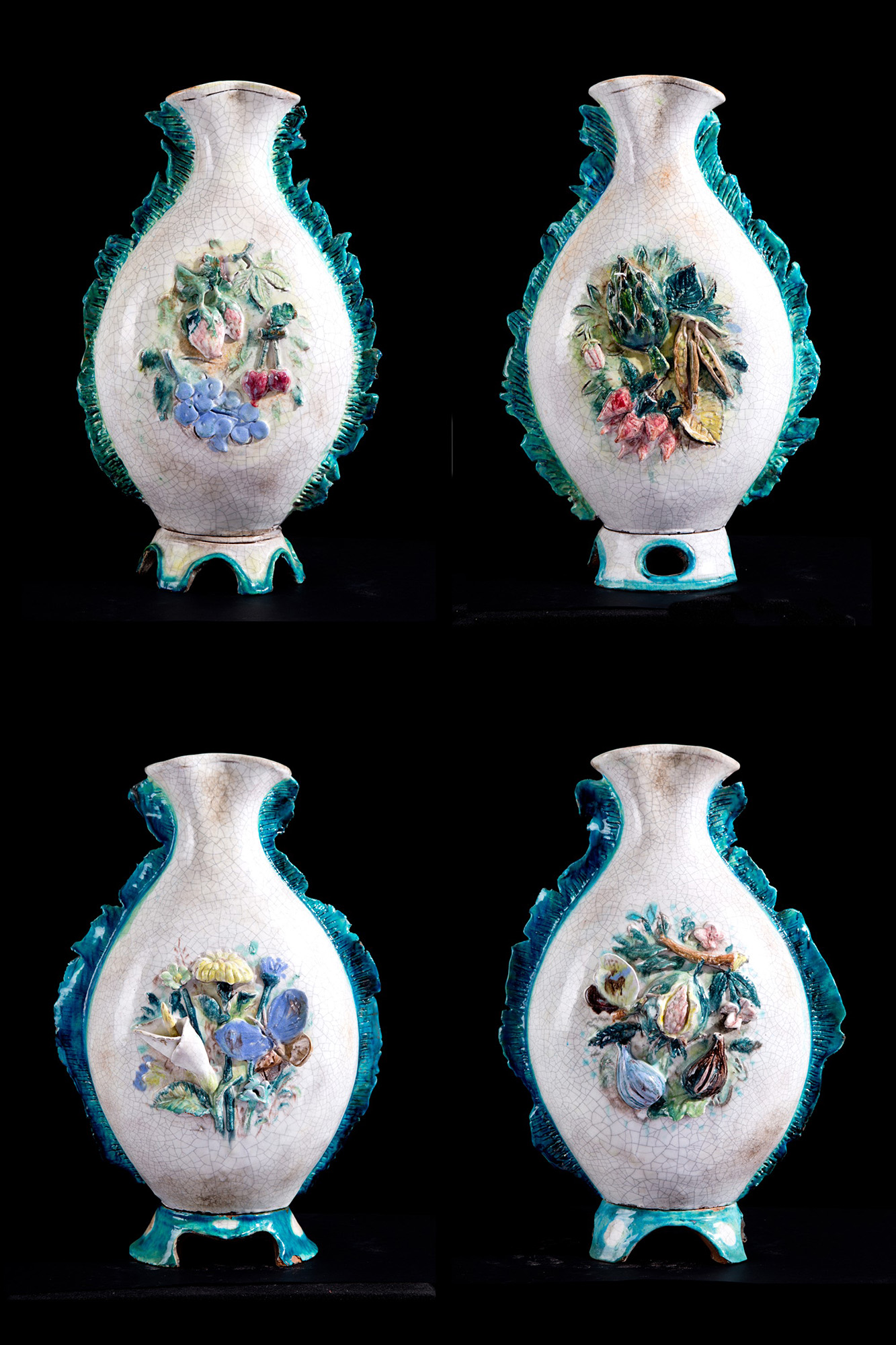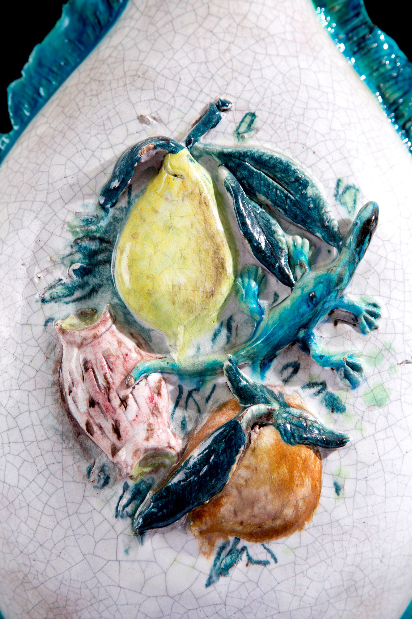 WALTER POSERN (Graz 1944). Four ceramic vases with fruits and animals in relief. Two decorated on both sides. Defects. 63x42x20cm approx. each WALTER POSERN (Graz 1944). Quattro vasi in ceramica con frutti e animali a rilievo. Due decorati su entrambi i lati. Difetti. 63x42x20 cm ca. cad.