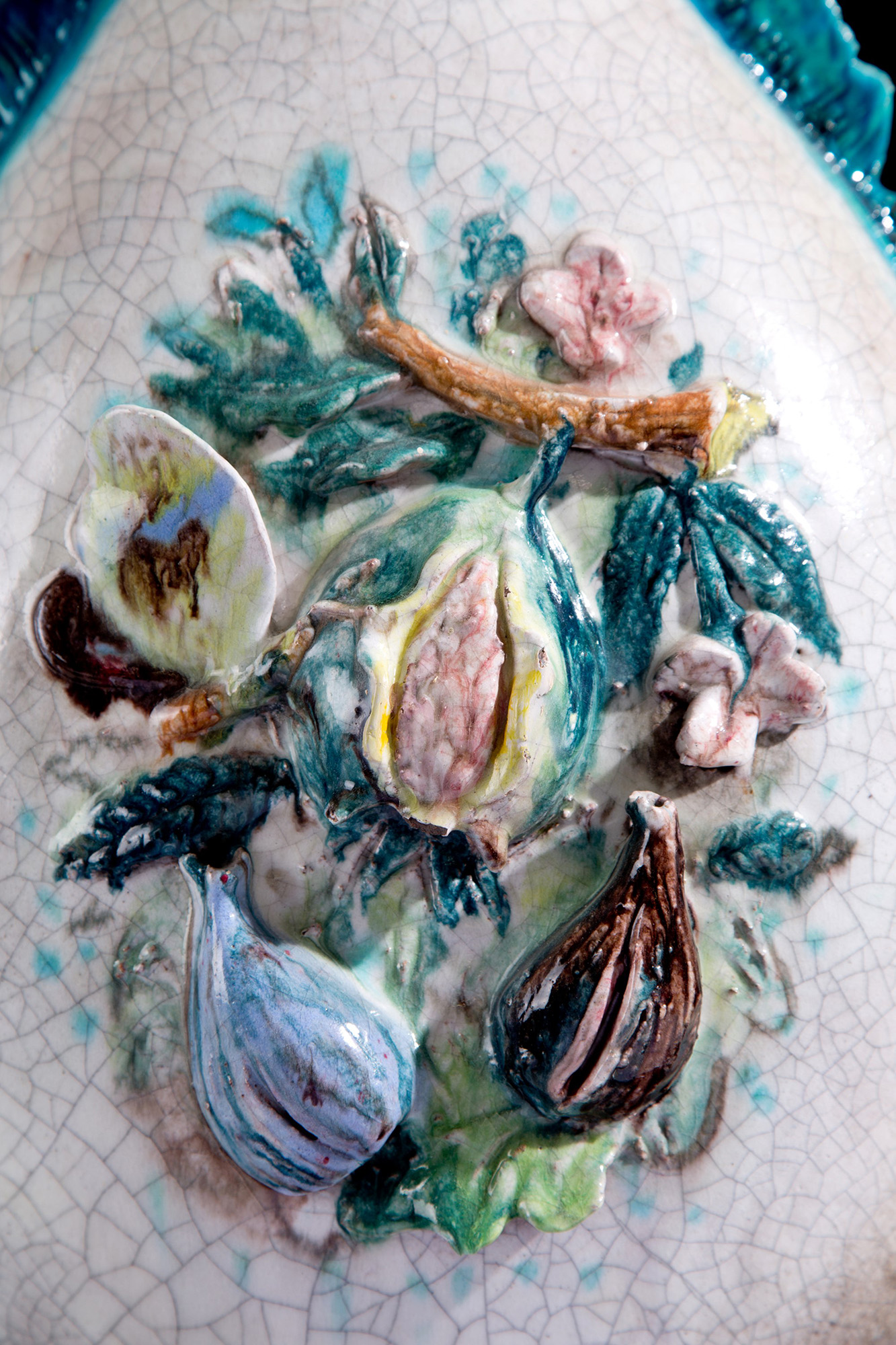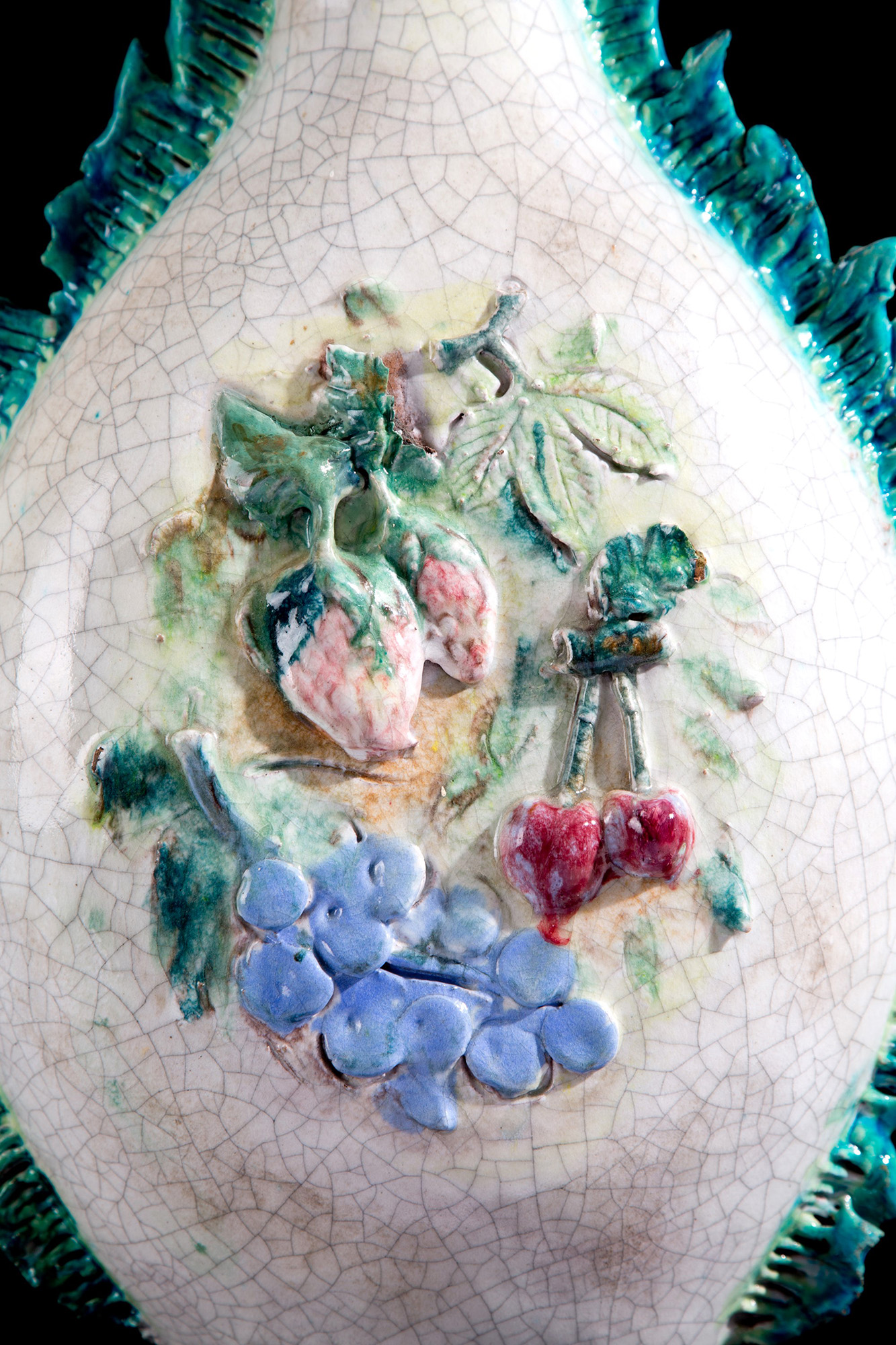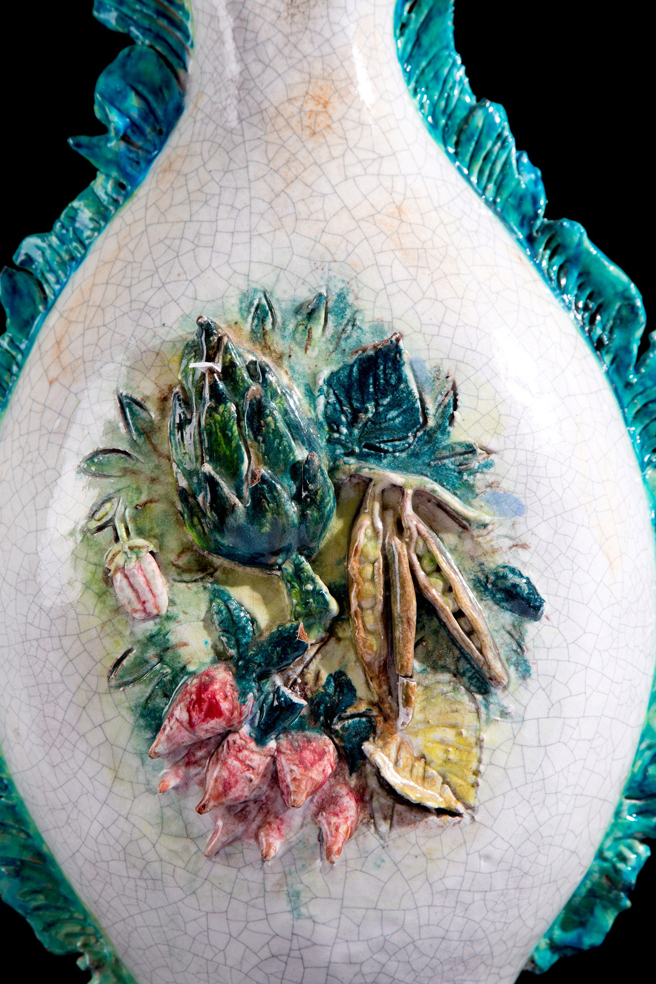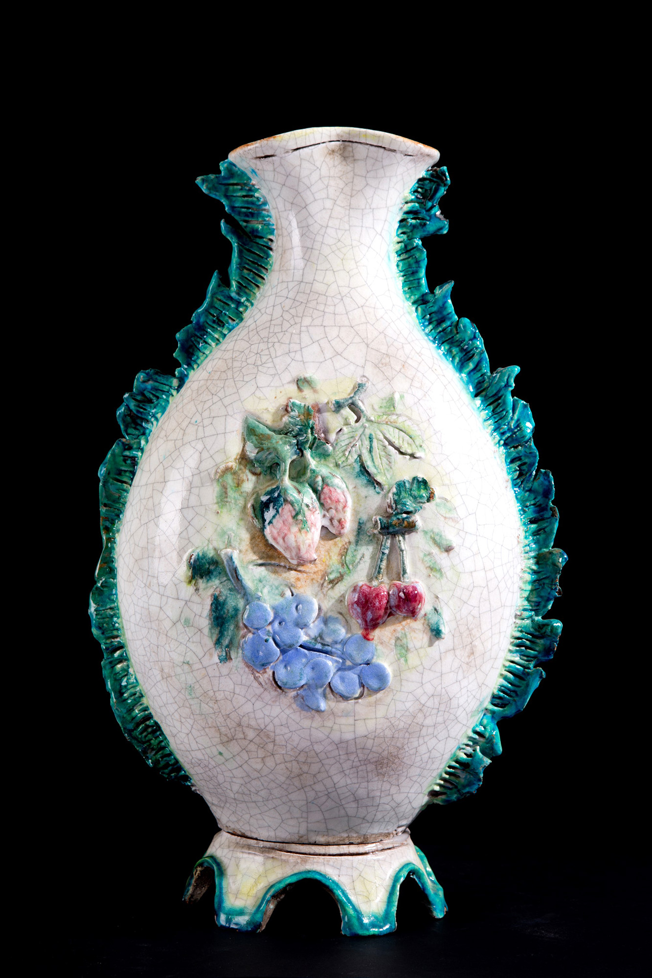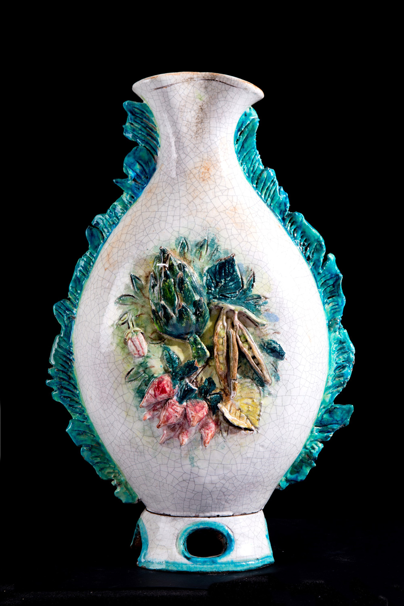 WALTER POSERN (Graz 1944). Four ceramic vases with fruits and animals in relief. Two decorated on both sides. Defects. 63x42x20cm approx. each WALTER POSERN (Graz 1944). Quattro vasi in ceramica con frutti e animali a rilievo. Due decorati su entrambi i lati. Difetti. 63x42x20 cm ca. cad.