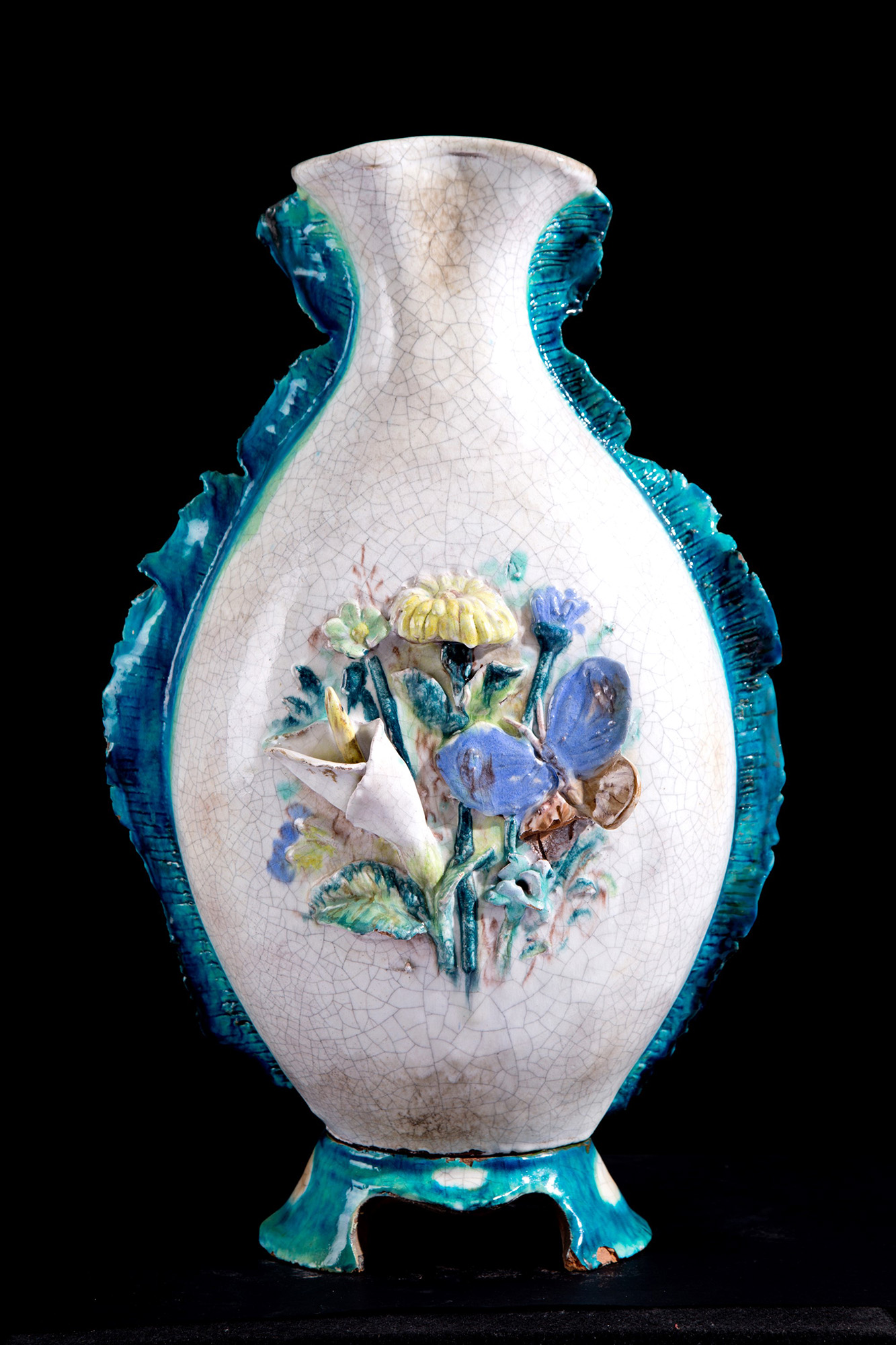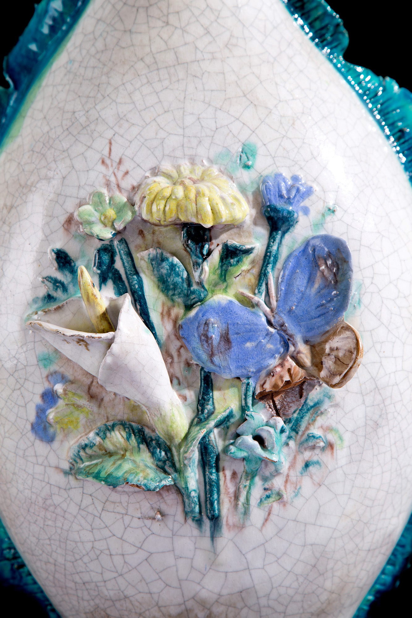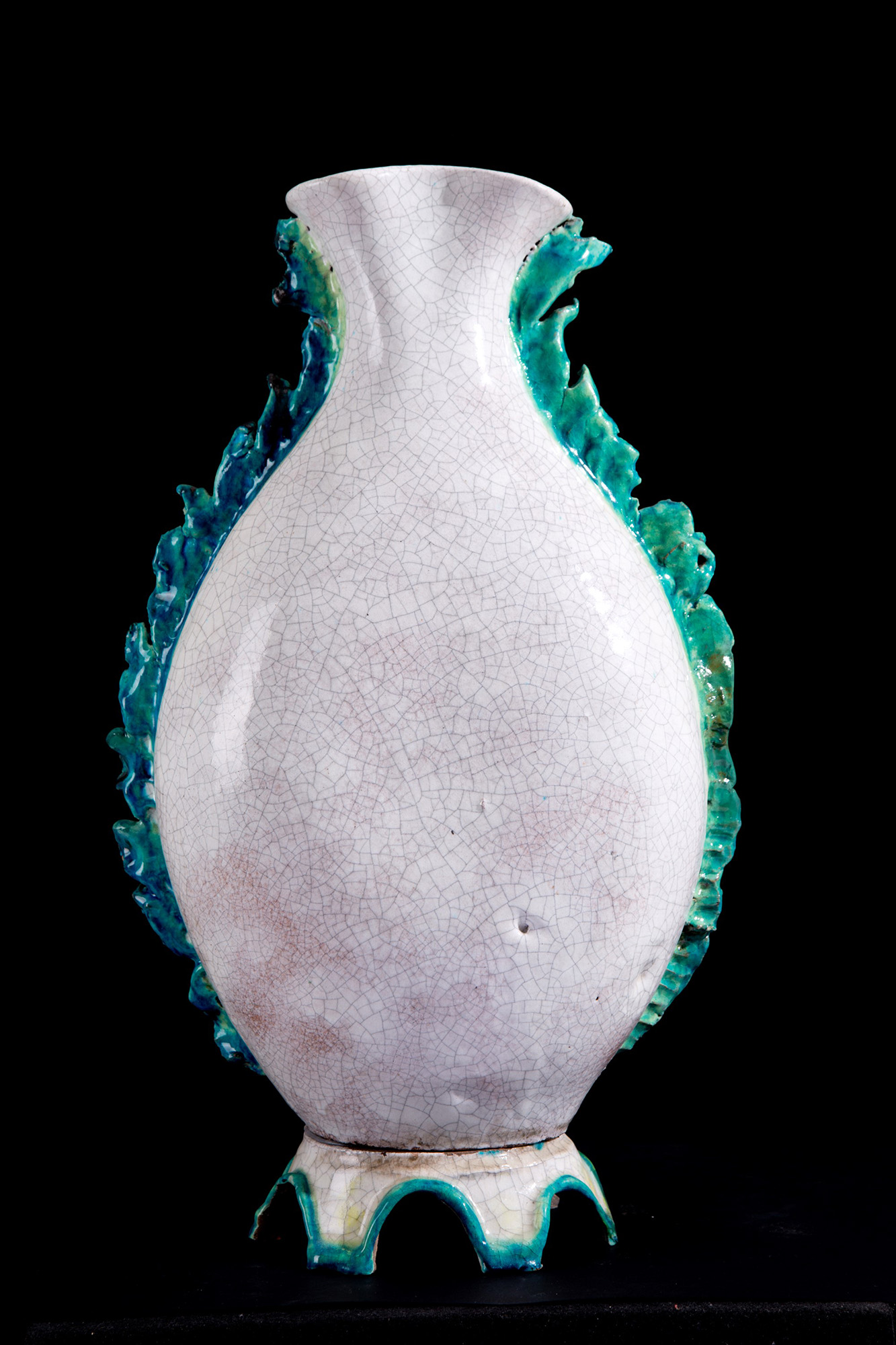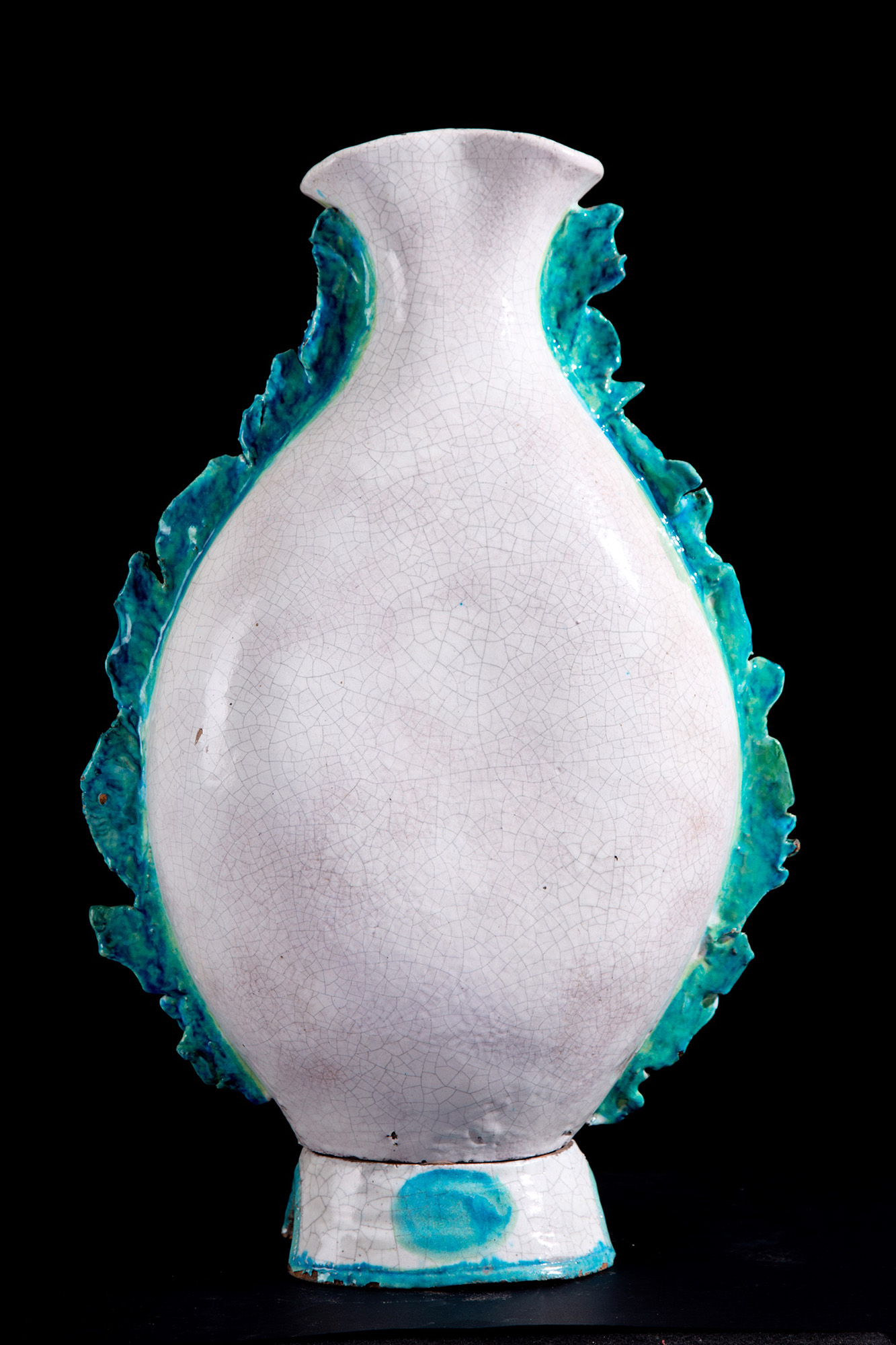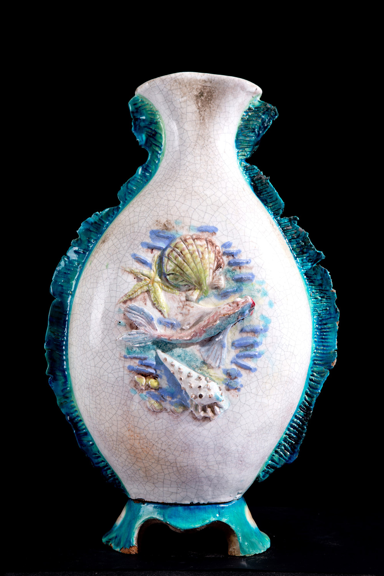 WALTER POSERN (Graz 1944). Four ceramic vases with fruits and animals in relief. Two decorated on both sides. Defects. 63x42x20cm approx. each WALTER POSERN (Graz 1944). Quattro vasi in ceramica con frutti e animali a rilievo. Due decorati su entrambi i lati. Difetti. 63x42x20 cm ca. cad.