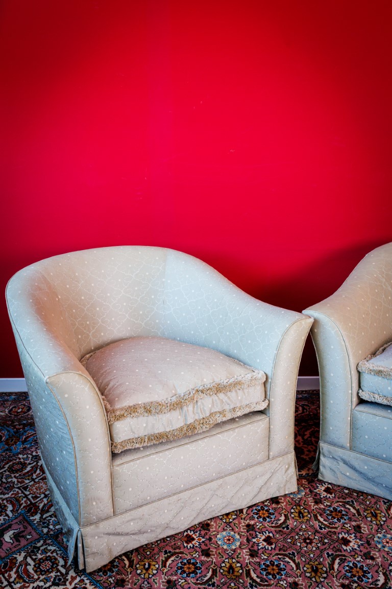 rivestite in tessuto verde chiaro di San Leucio Caserta, piedini in legno troncopiramidali