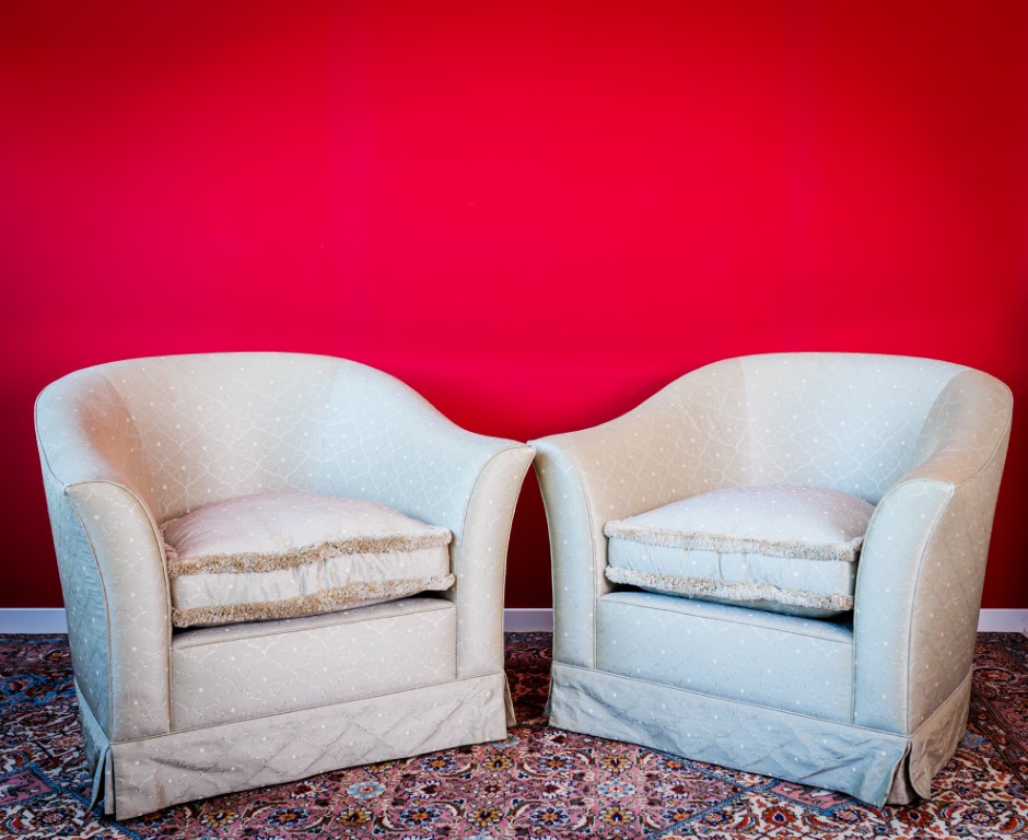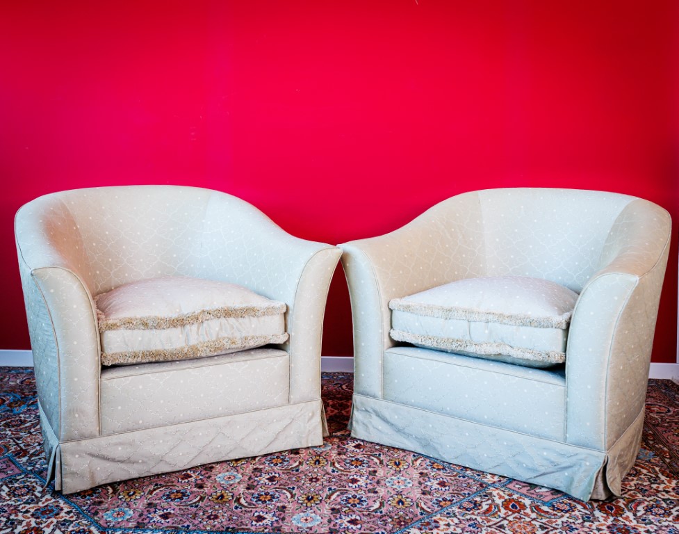 rivestite in tessuto verde chiaro di San Leucio Caserta, piedini legno troncopiramidali