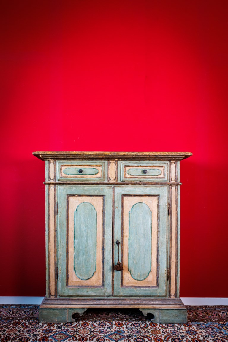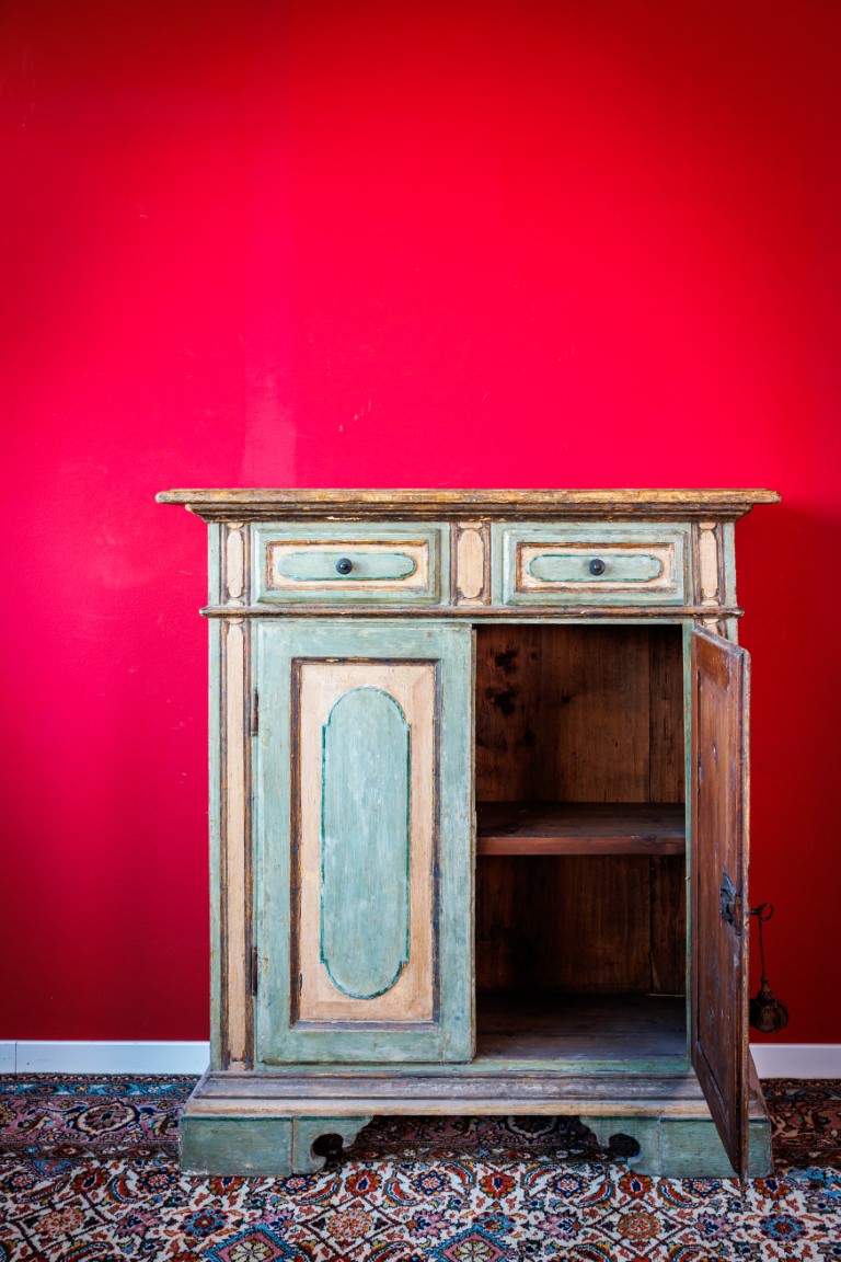 Piccola credenza in legno intagliato e laccato nei toni del celeste e dell'avorio