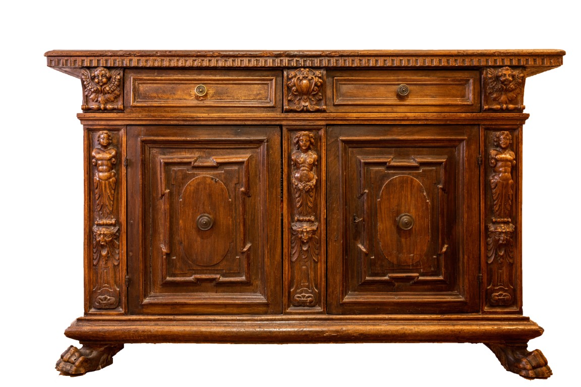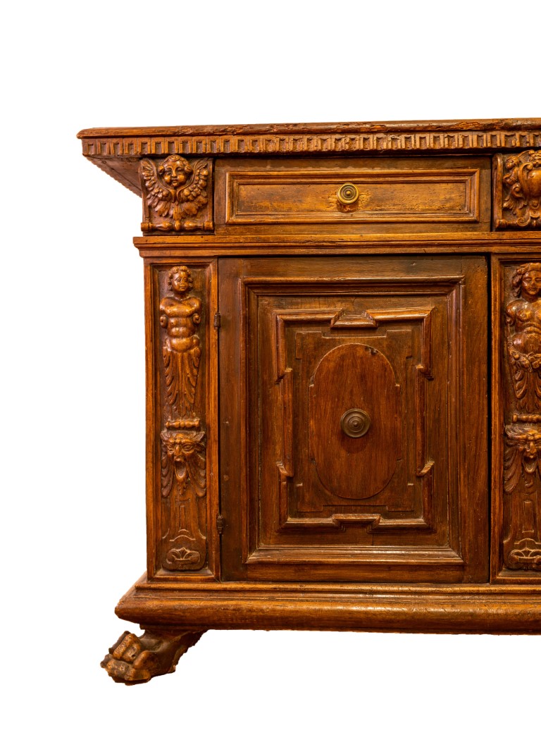 piano rettangolare con gocciolatoio a dentelli, due cassetti nella fascia intercalati da teste di cherubini, due sportelli sformellati sottostanti, lesene laterali scolpite a telamoni, base modanata, piedi a zampa ferina, costruita con materiali antichi