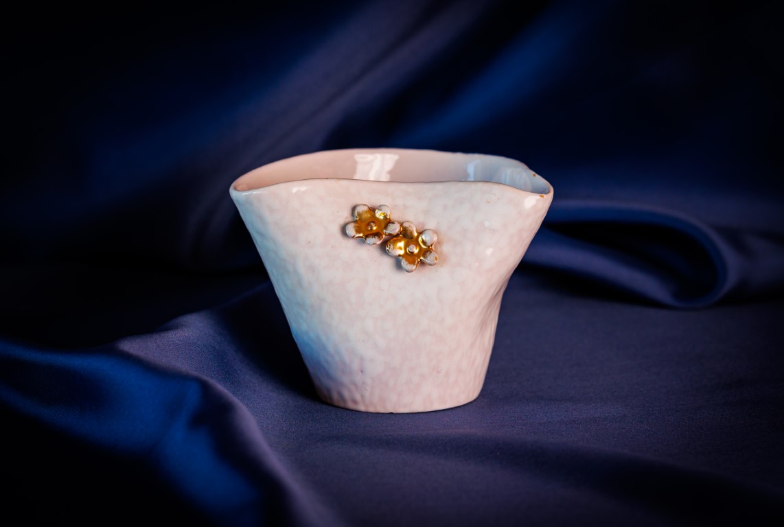 dipinta nei colori del rosa, con applicazioni di fiori lumeggiati in orodipinta di colore rosa