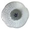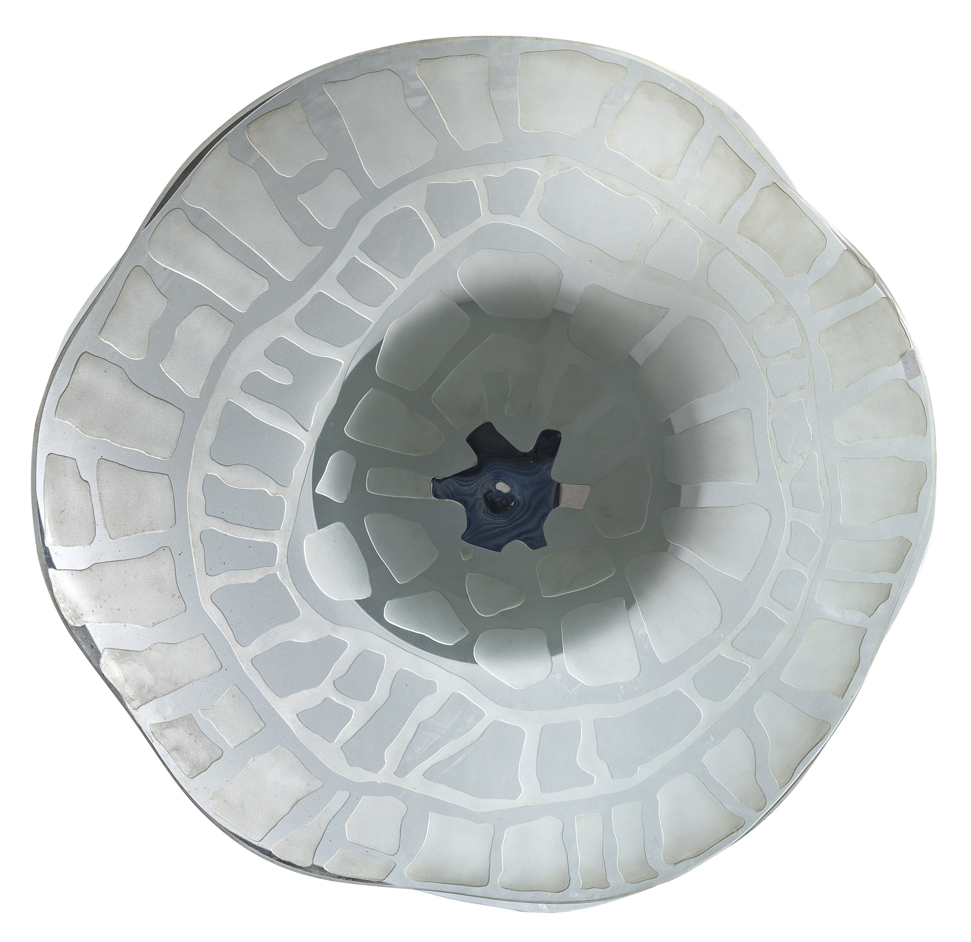 a doppio disco con il superiore decorato a mattonelle a motivi satinati. Disco inferiore anch'esso a motivi satinati e incisi, bordi mossi irregolari. Supporto, finiture e boccagli in metallo cromato.