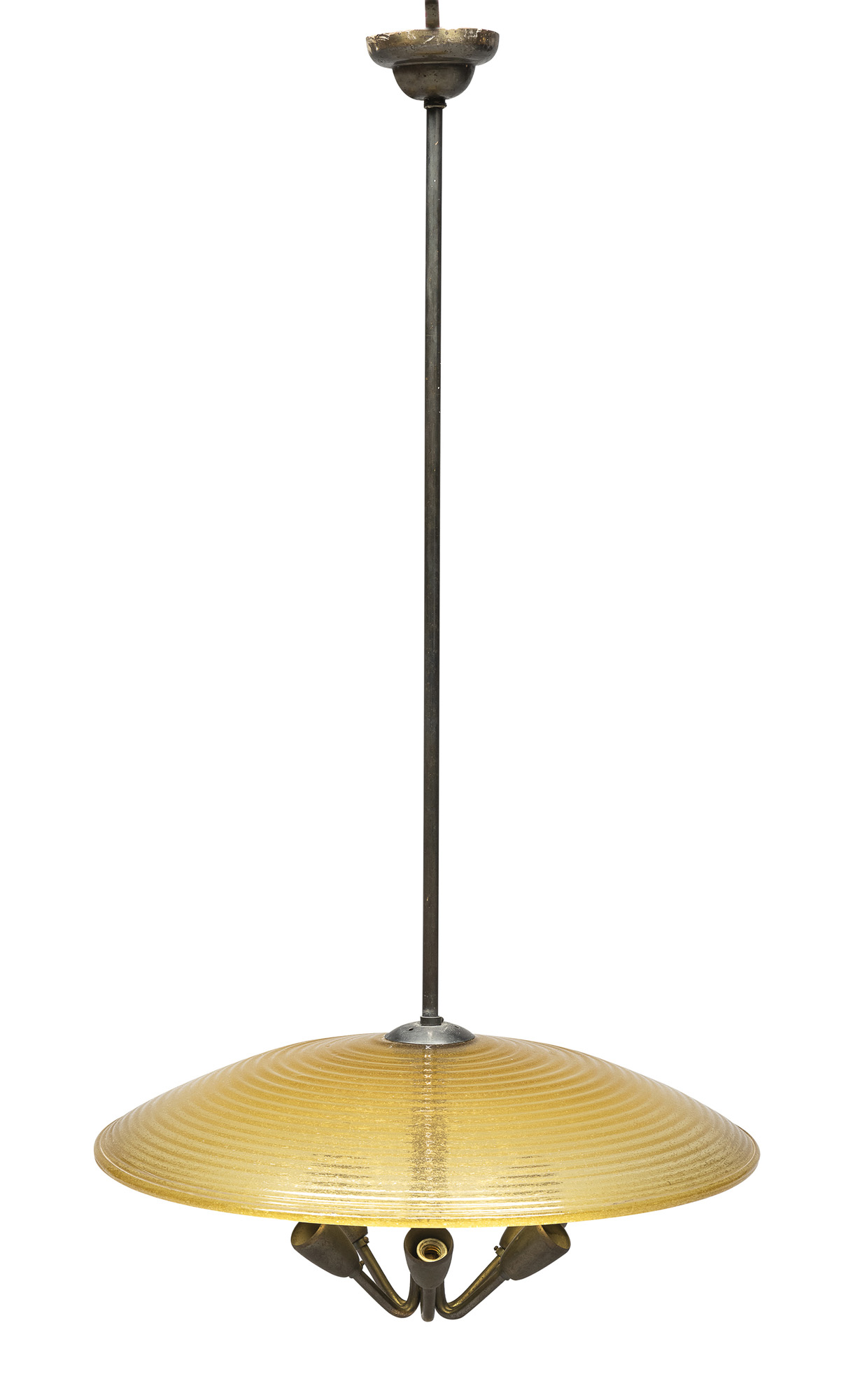 a sei luci, con paralume in vetro giallo trasparente e stelo rigido in ottone