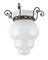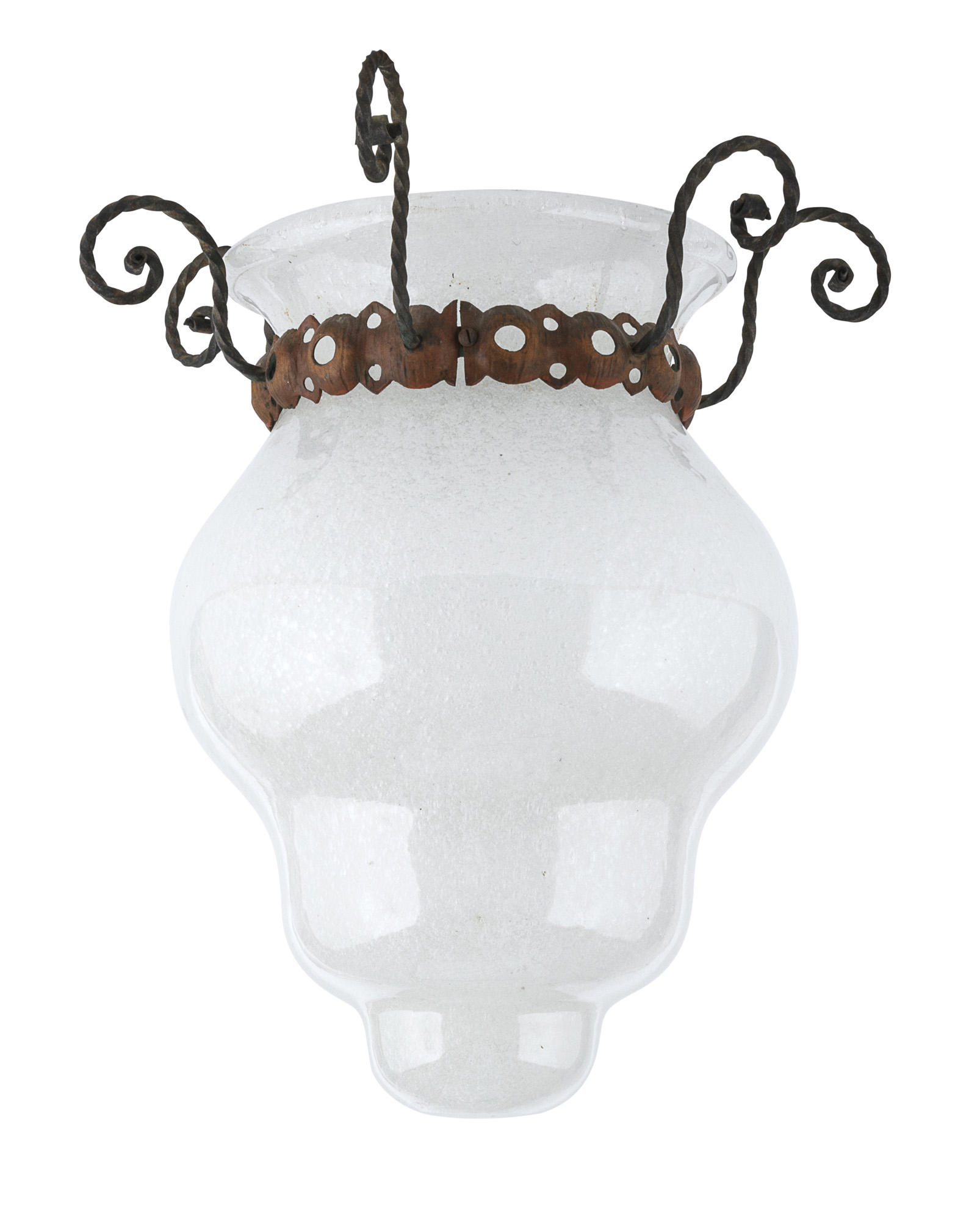 in vetro opaline bianco-latte, con supporto in ferro battuto.