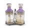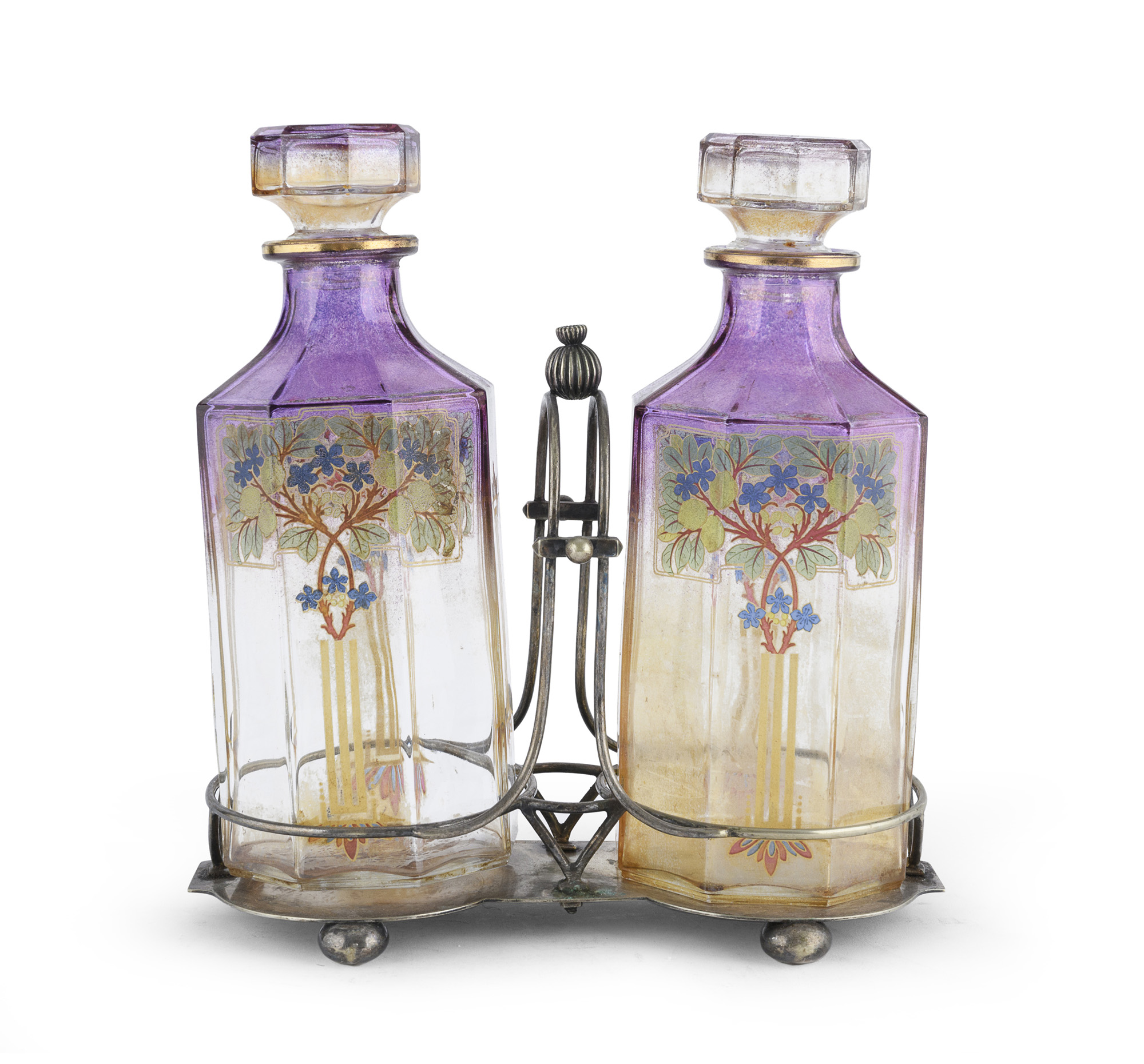 in vetro trasparente arancio e viola dipinti a motivi vegetali. Supporto in metallo argentato.