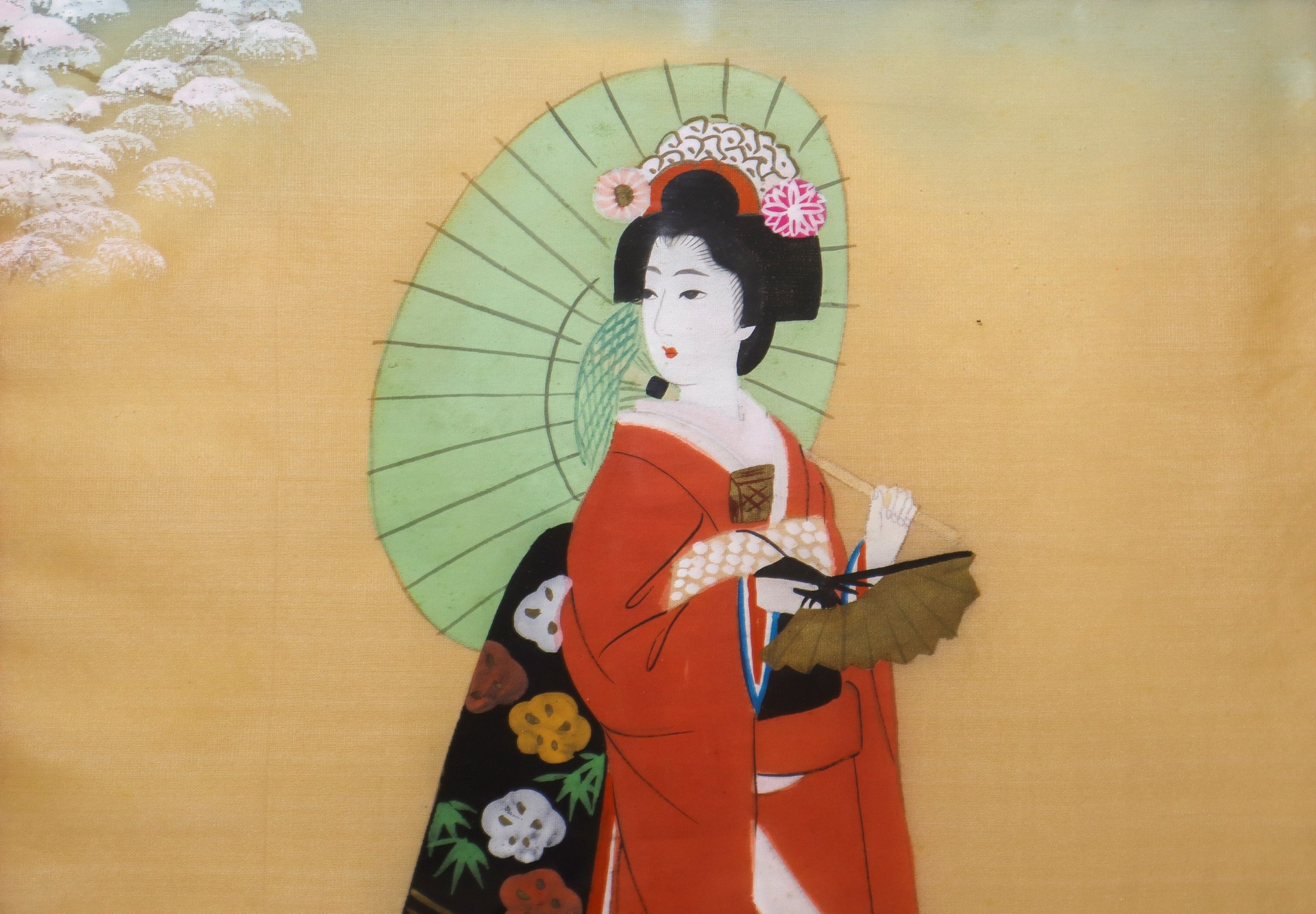 Geisha in abito tradizionale, Primi XX secolo cm 40 x cm 35, in cornice cm 59 x cm 51 tempera su seta Pittore giapponese firmato su lato sinistro