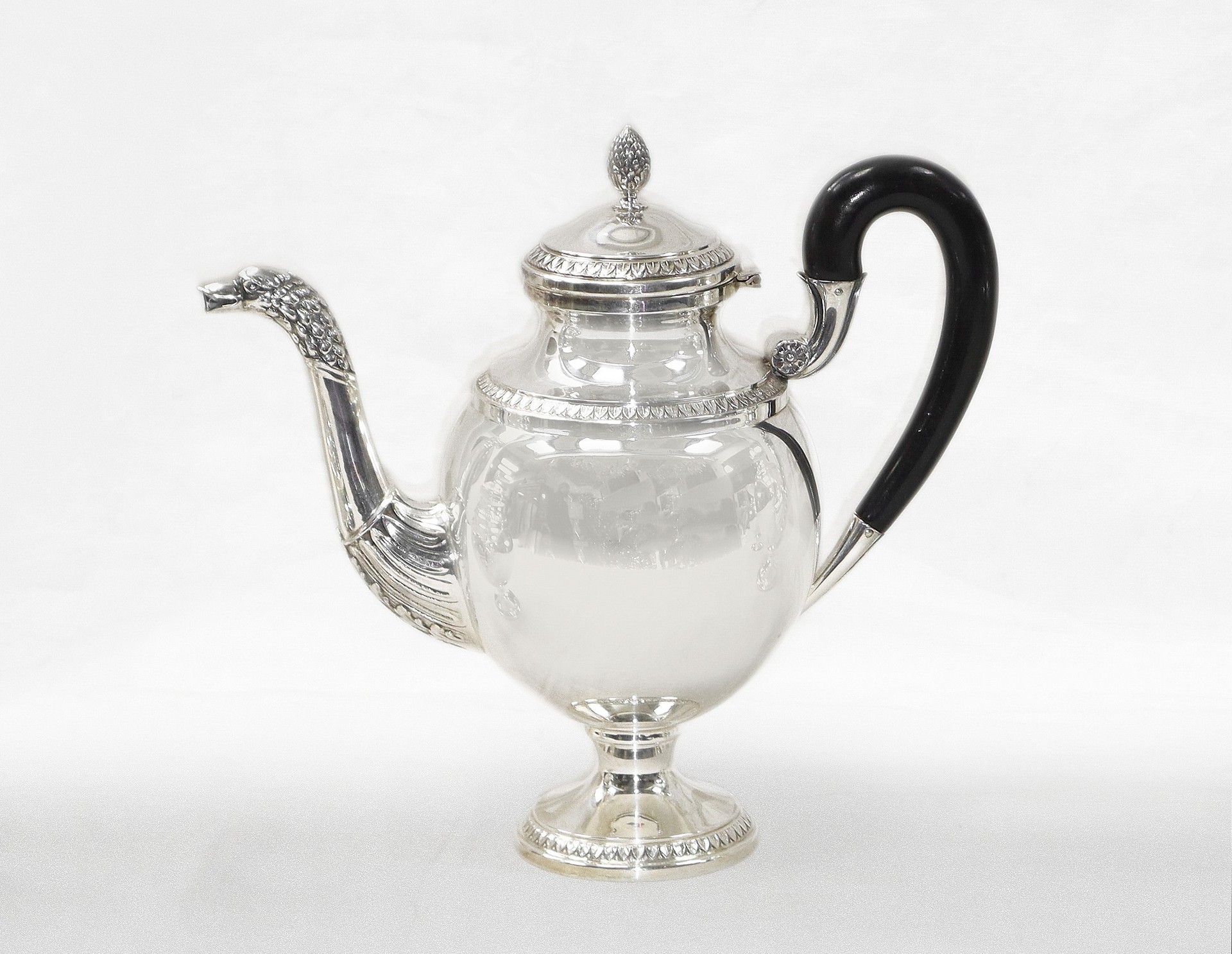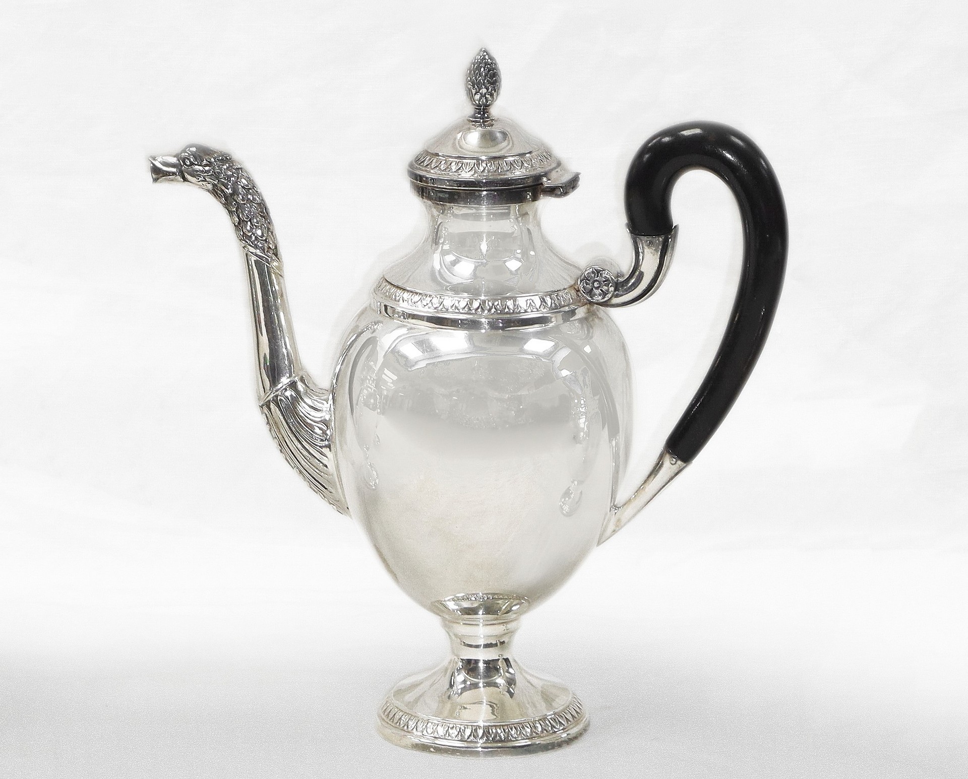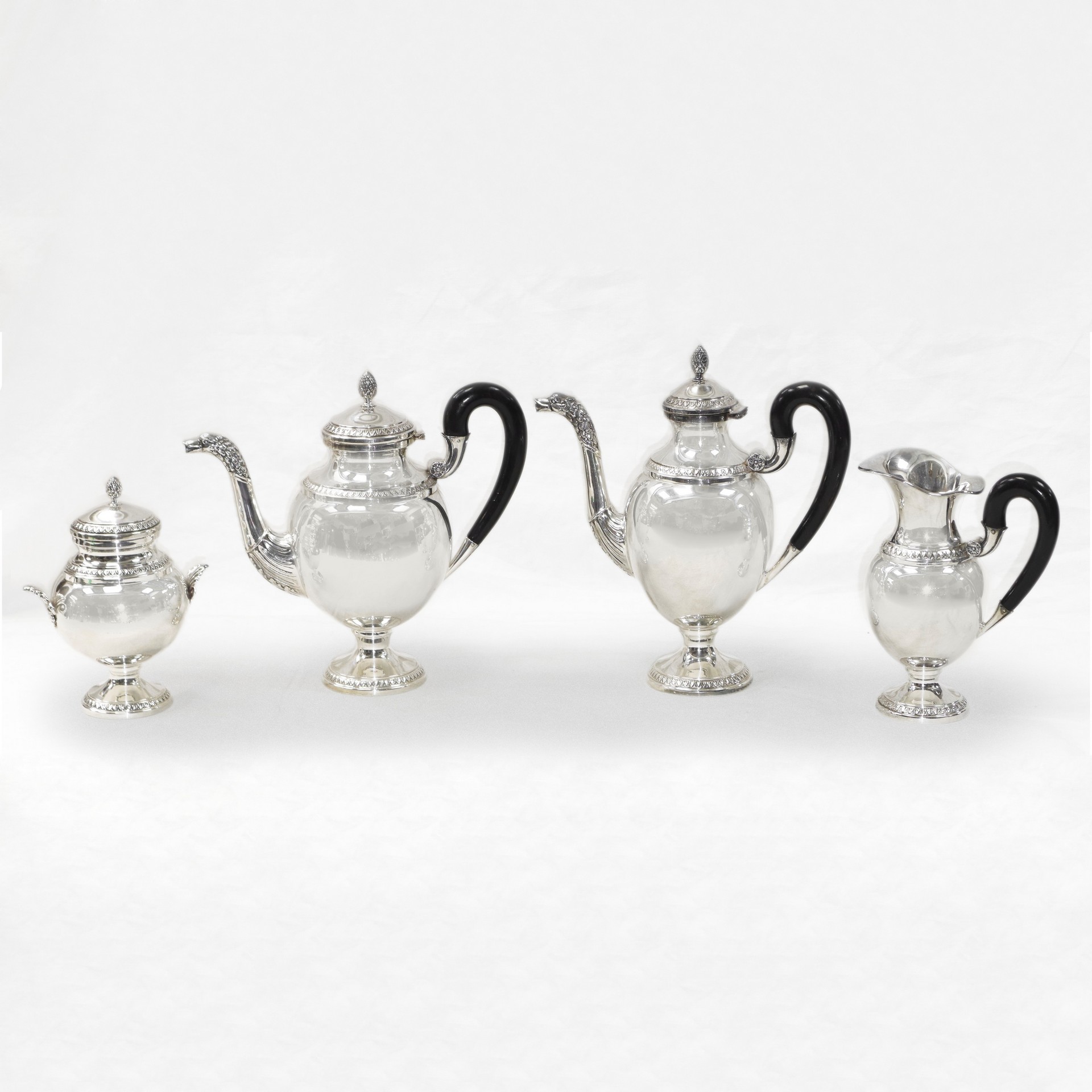 Servizio da te in argento stile impero., XX secolo Caffettiera, teiera, lattiera e zuccheriera. Manici in legno in stile impero. g 1860Caffettiera, teiera, lattiera e zuccheriera. Manici in legno in stile impero. g 1860