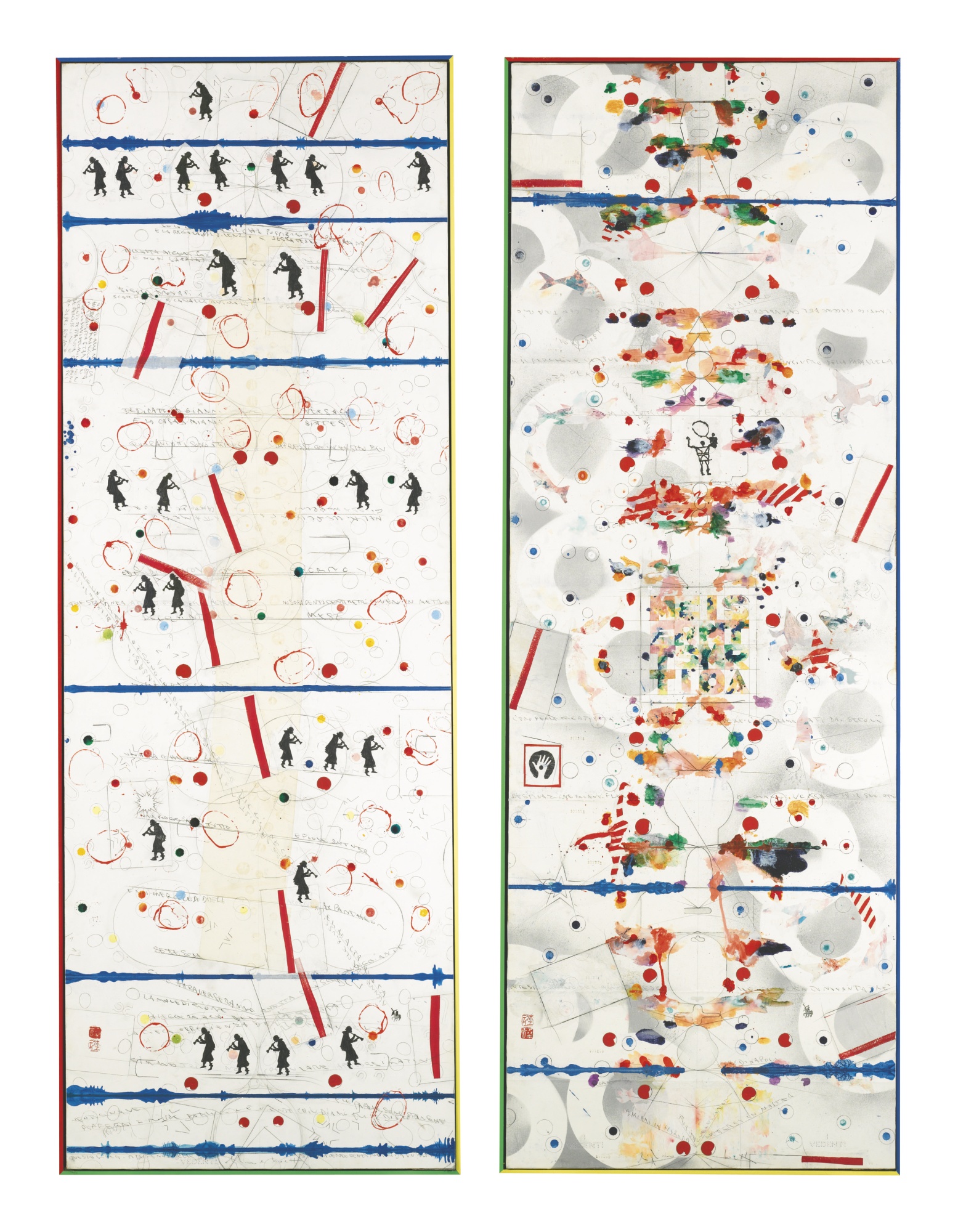 ALIGHIERO BOETTI 1940 - 1994 METTERSI IN MOSTRA signed, titled, stamped I vedenti, inscribed and dedicated to Gianni Versace, gouache, watercolour, pencil and ink on paper laid on canvas and painted fram (two elements) firmati, intitolati e timbrati I Vedenti, iscritti e dedicati a Gianni Versace tempera, acquerello, matita e inchiostro su carta applicata su tela e cornice dipinta (in due parti) cm 199,4x71 (ciascuno) Eseguito nel 1993 PROVENANCE Collezione Gianni Versace, Miami (Commissionati direttamente all'artista) Collezione Santo Versace, Milano