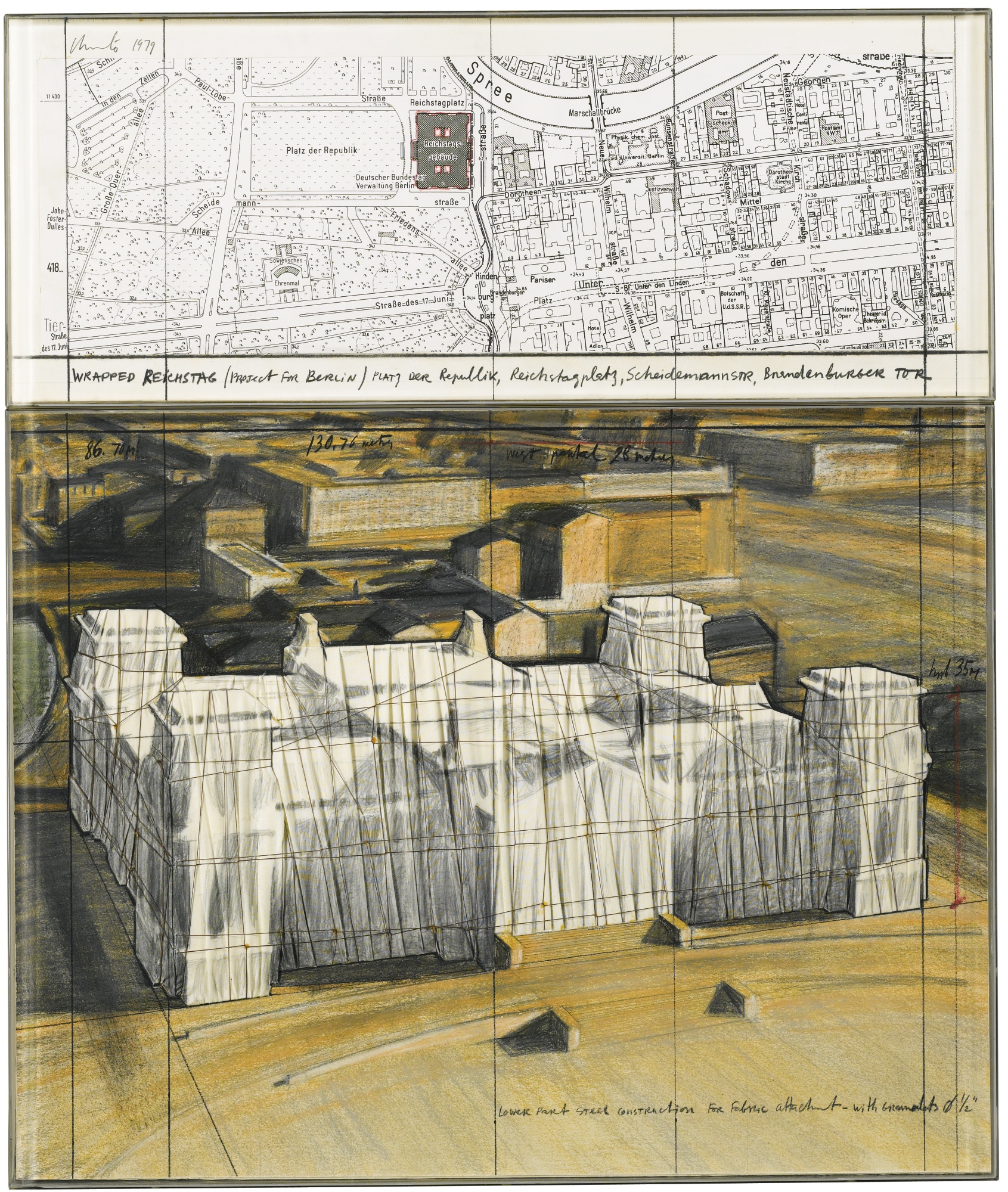 CHRISTO E JEANNE-CLAUDE N. 1935 E 1935-2009 WRAPPED REICHSTAG (PROJECT FOR BERLIN) signed, titled, inscribed and dated 1979; inscribed on the reverse, printed map on canvas,pastels fabric, string and collage on board, in two parts firmato, intitolato, iscritto e datato 1979; iscritto sul retro cartina topografica stampata su tela, pastello, tessuto, corda e collage su tavola (in due parti) cm 27,5x71; cm 55,5x71 L'opera è accompagnata da certificato su fotografia rilasciato dall'artista PROVENANCE Acquistato dall'attuale proprietario nel 2005 circa