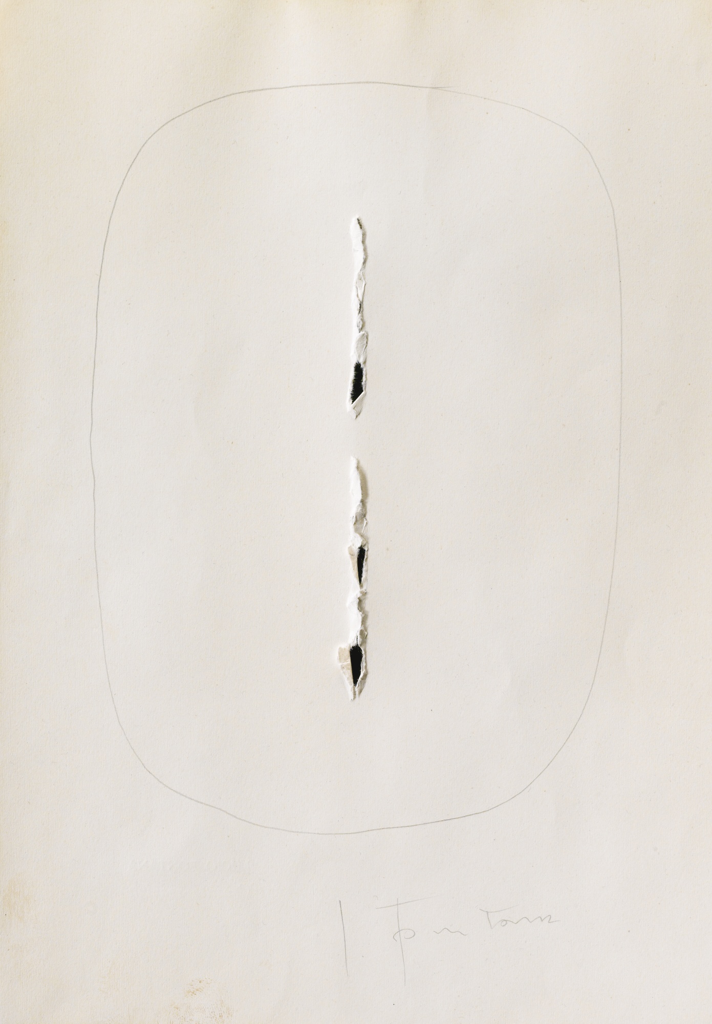 LUCIO FONTANA 1899 - 1968 CONCETTO SPAZIALE firmato matita e strappo su carta cm 35,1x25 Eseguito nel 1965 Opera registrata presso la Fondazione Lucio Fontana, Milano, con il numero 1327/3 Opera accompagnata da certificato su fotografia rilasciato dalla Fondazione Lucio Fontana, Milano CATALOGUE NOTE signed, pencil and tear on paper. Executed in 1965