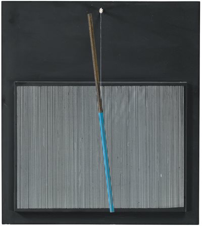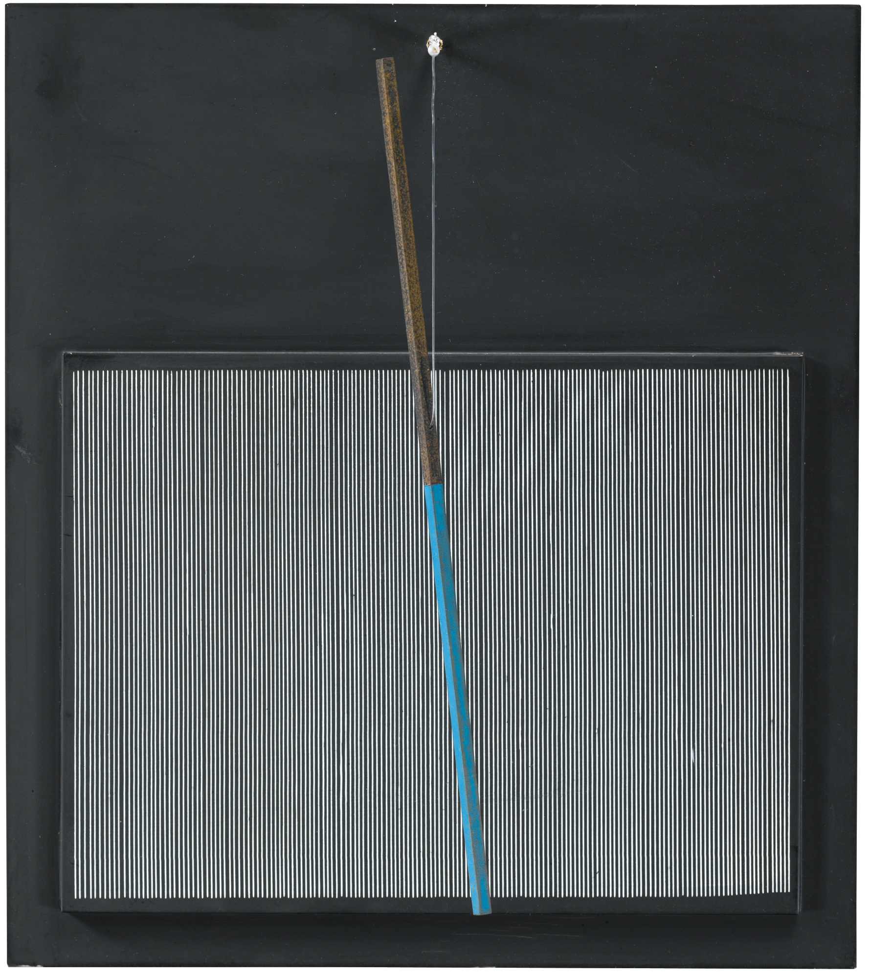 JESUS RAFAEL SOTO 1923-2005 INCLINÉ BLEU ET NOIR signed and numbered 1; PA, painted wood, aluminum and nylon strings. Executed in 1966 in edition of 100 firmato e numerato 1; prova d'artista legno dipinto, alluminio e nylon cm 38x43 Eseguito nel 1966 in 100 esemplari; Edizione Galleria del Deposito, Genova Boccadasse PROVENANCE Galleria Beniamino, Sanremo Ivi acquisito dalla famiglia dell'attuale propietario nel 1971 EXHIBITED Sanremo, Galleria Beniamino, Arte Moltiplicata, 1971