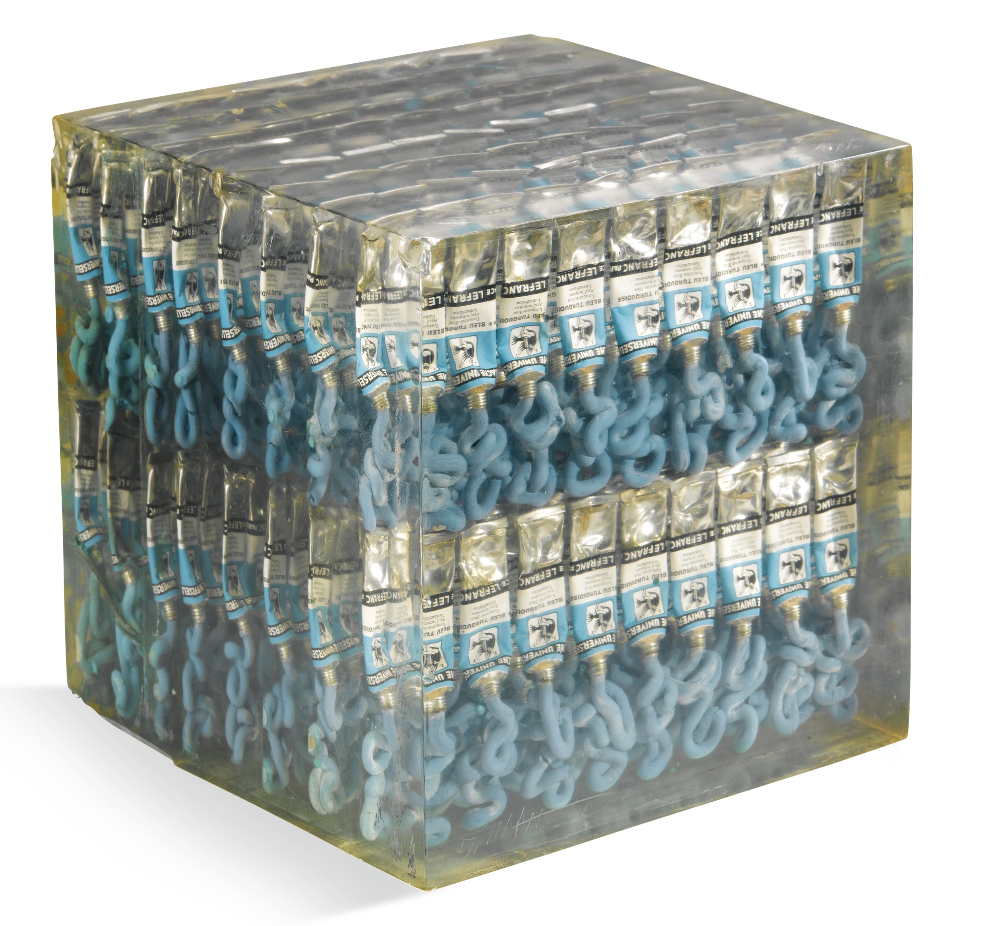 ARMAN 1928 - 2005 CUBO AZZURRO (BLEU TORQUOISE) signed and dated 68, two rows of tubes placed horizontally across throughhout a polyester cube firmato e datato 68 due file di tubetti orizzontali in cubo di poliestere cm 24x24x23,5 Opera registrata presso gli Archives Denyse Durand-Ruel, Parigi, con il n. 1523, in collaborazione con gli Arman Studio Archives, New York, a cura di Corice Canton Arman, con il n. APA# 801.68.083 L'opera è accompagnata da certificato su fotografia rilasciato da Archives Denyse Durand-Ruel, Parigi PROVENANCE Galleria d'Arte Il Chiostro, Saronno Ivi acquistato dall'attuale proprietario nel 2008