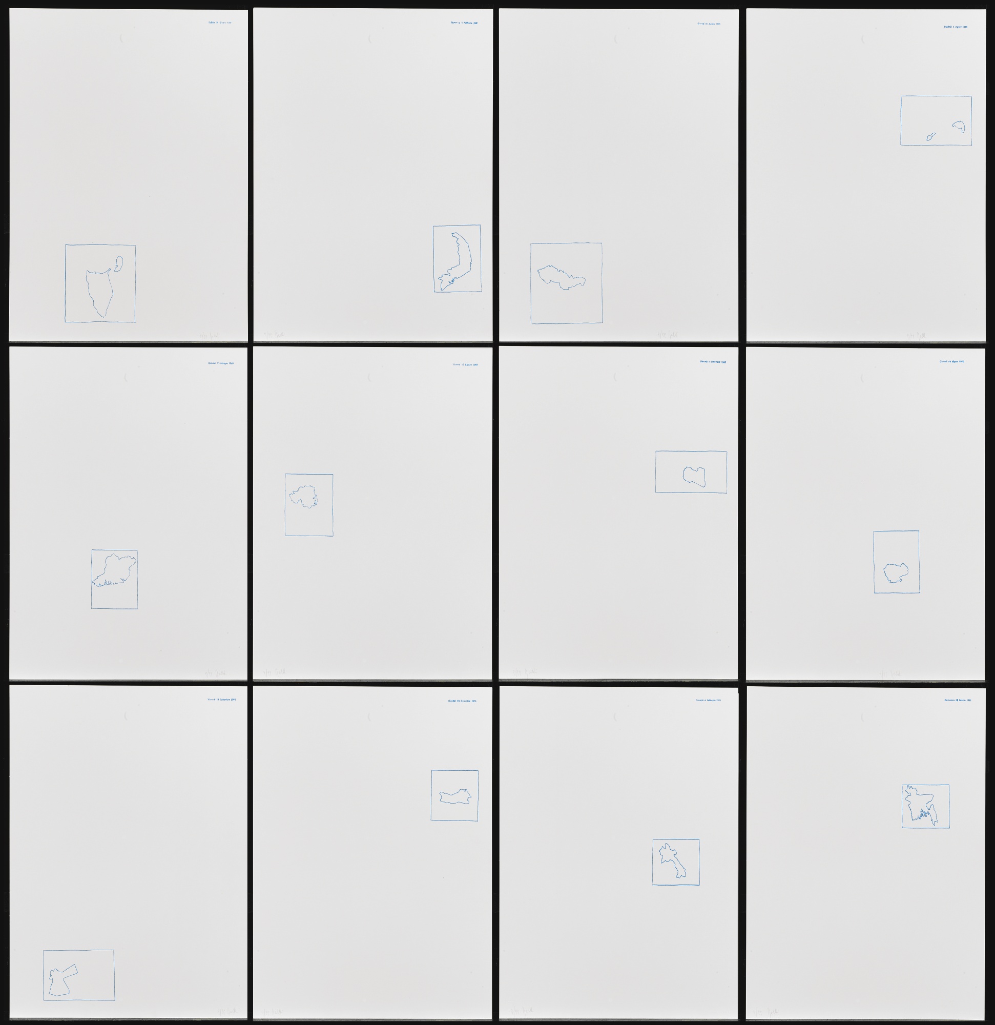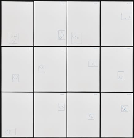 ALIGHIERO BOETTI 1940 - 1994 DODICI FORME DAL 10 GIUGNO 1967 signed and numbered 9/99 each silkscreen,13 silkscreens printed on cardboard usomano white (1 colophon+12 boards). Executed in July 1971 by Edizioni Grafiche Artestudio Macerata firmato e numerato 9/99, ciascun foglio tredici serigrafie stampate su cartoncino usomano bianco (1 colophon+12 tavole) contenute in una scatola di plastica bianca cm 42,5x59 ciascun foglio; cm 64x44x2,8 scatola bianca Eseguito nel Luglio 1971 da Edizioni Grafiche Artestudio Macerata Opera registrata presso l'Archivio Alighiero Boetti, Roma con il n. 7328 L'opera è accompagnata da certificato su fotografia rilasciato dall'Archivio Boetti, Roma PROVENANCE Collezione Cattelani, Modena Galerie A, Amsterdam Ivi acquistato dall'attuale proprietario LITERATURE F. Gualdoni, Arte Italiana, Torino 1992, pp. 33-35, illustrato un altro esemplare s.a., Dodici forme dal 10 giugno 1967, in "temporale", Lugano 1996, pp. 2-3, illustrato un altro esemplare J.C. Ammann, Alighiero Boetti. Catalogo generale. Tomo primo, Milano 2009, pag. 279, n. 351, illustrato un altro esemplare CATALOGUE NOTE I dati si riferiscono agli eventi geopolitici selezionati da AB, a partire dal 1967, dalle pagine de "La Stampa".