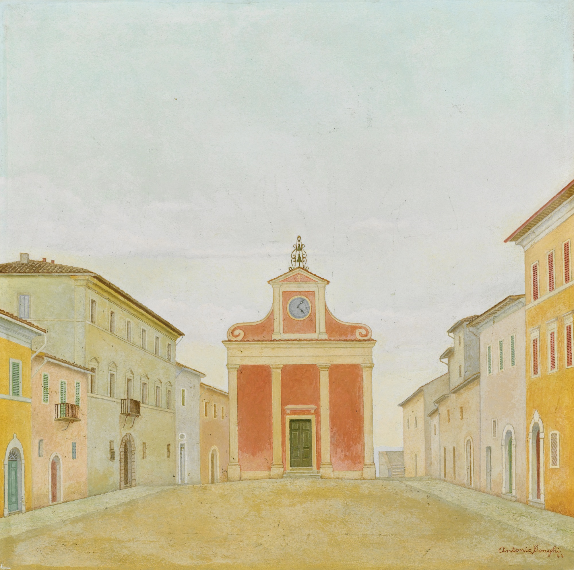 ANTONIO DONGHI 1897 - 1963 PIAZZA DI PAESE signed and dated 44, oil on board firmato e datato 44 olio su tavola cm 44,5x44,5 L'opera è accompagnata da certificato rilasciato da Valerio Rivosecchi, Roma PROVENANCE Collezione privata, Montecarlo Ivi acquisito dalla famiglia dell'attuale proprietario negli anni Cinquanta