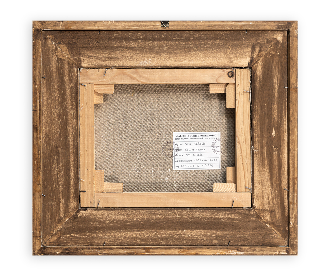 Etichetta e timbri della Galleria Ponte Rosso (MI), con relativo numero di inventario, al retro