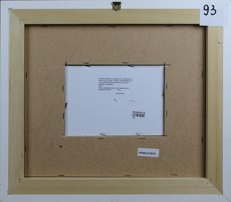 Mario Schifano, Il predatore, 1990-97, Foto ritoccata a smalto, Esemplare unico, Dim. 10x15, Opera archiviata presso la Fondazione Mario Schifano " Archivio Generale dell' Opere di Mario Schifano " con n° archivio: F90-97/6479, il 19 settembre 2007, Opera pubblicata sul catalogo " Mario Schifano fotografie ritoccate " a pag.36, volume I, Al verso: firma "Schifano", Opera con cornice