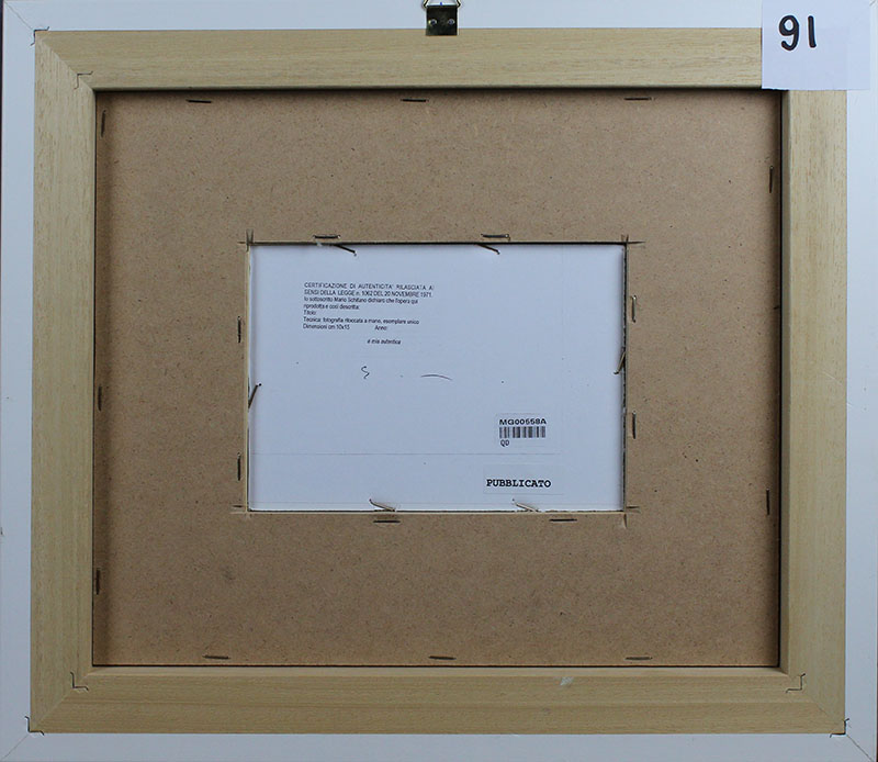 Mario Schifano, Monitor, 1990-97, Foto ritoccata a smalto, Esemplare unico, Dim. 10x15, Opera archiviata presso la Fondazione Mario Schifano " Archivio Generale dell' Opere di Mario Schifano " con n° archivio: F90-97/6001, il 2 agosto 2007, Opera pubblicata sul catalogo " Mario Schifano fotografie ritoccate " a pag.17, volume I, Al verso: firma "Schifano", Opera con cornice