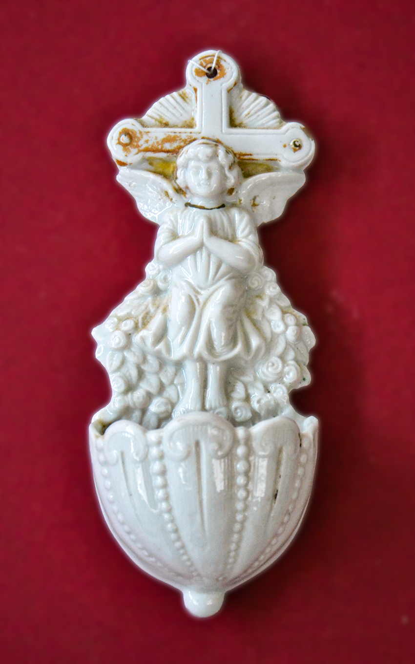 Acquasantiera in porcellana cona angelo e croce