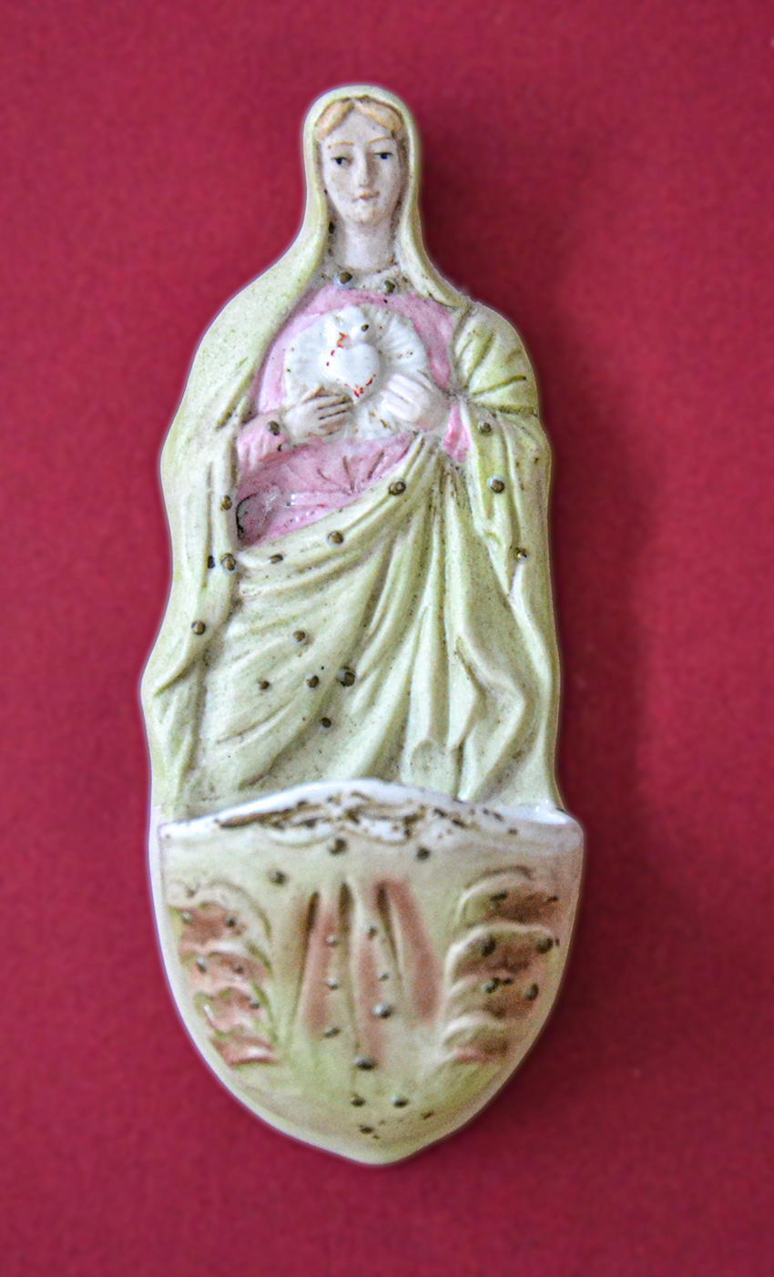 Acquasantiera in porcellana biscuit con Madonna col sacro cuore