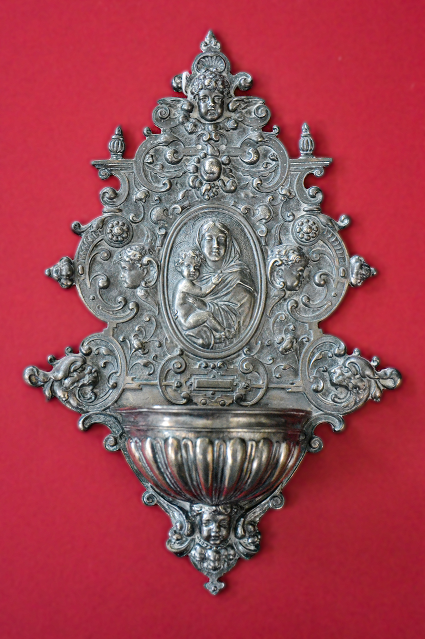 Acquasantiera in lega e argento con Madonna, bambino e putti