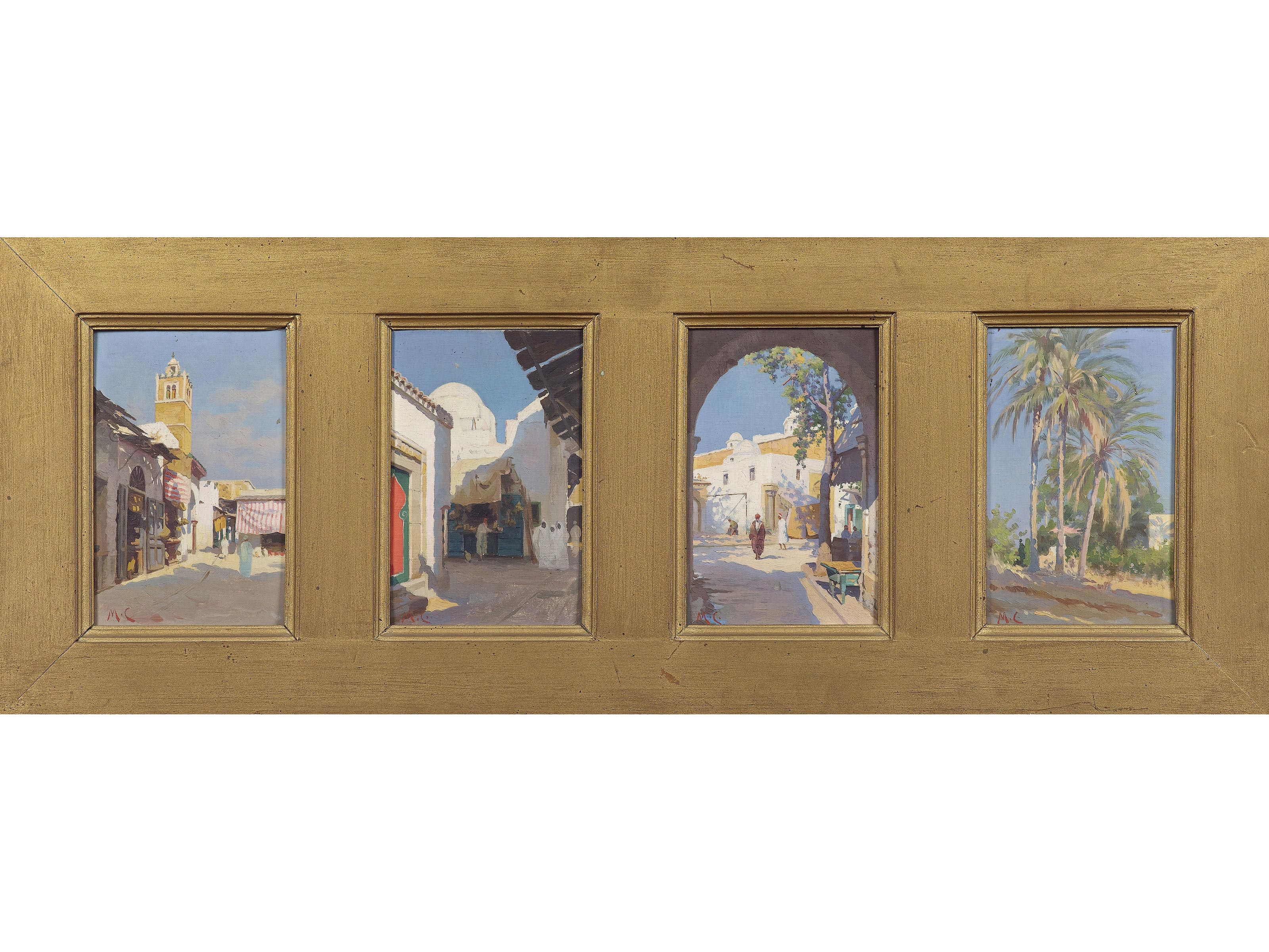 Michele Cortegiani (Napoli 1857-Tunisi 1919) Quattro scene orientaliste Olio su cartoncino telato Tutti e quattro siglati M.C. Misure 20x13 cm