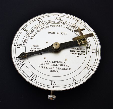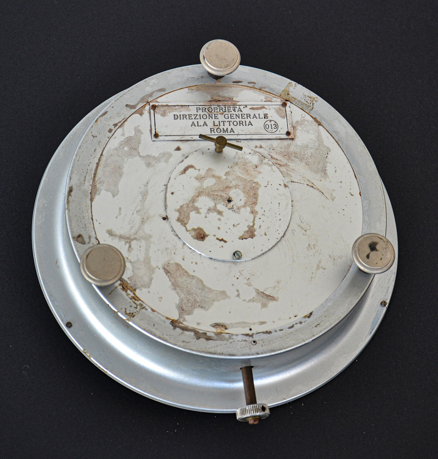 Nel pieno campo è indicata la composizione della flotta aerea della compagnia oltre all’anno di produzione 1938 (XVI° anno dell’era fascista). Sempre nel quadrante la dicitura: Ala Littoria Linee dell’Impero Direzione Generale Roma, mentre sul retro una piccola etichetta in alluminio reca la proprietà della Compagnia Aerea e un probabile numero seriale.