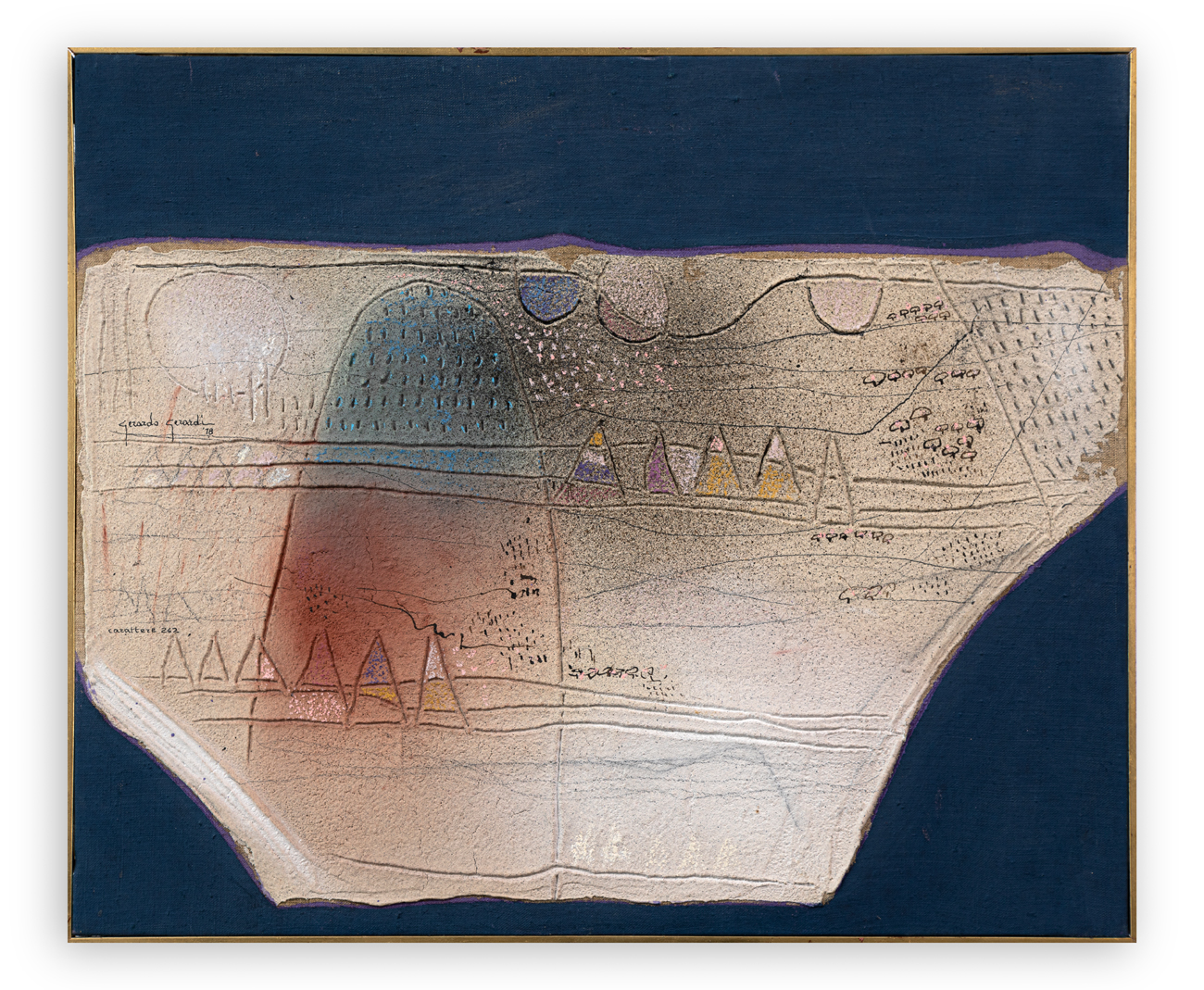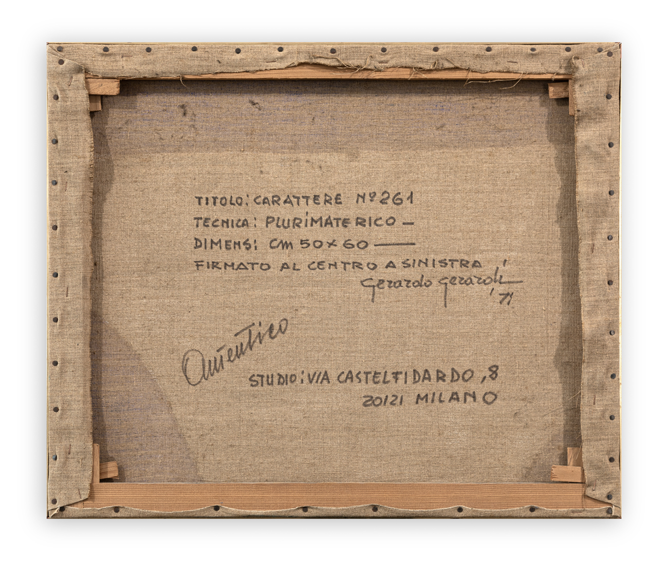 Firma, titolo, tecnica, misure, località (Milano) e dichiarazione di autenticità dell'Artista al retro