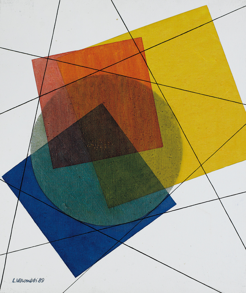 LUIGI VERONESI Milano 28/05/1908 - Milano 25/02/1998 Costruzione SCIN 2, 1989 olio su tela cm. 60x50, firma e anno in basso a sinistra, titolo, firma e anno al retro, dichiarazione d'autenticità dell'artista su foto, opera registrata presso l'Archivio del Comitato Luigi Veronesi come da dichiarazione su foto.