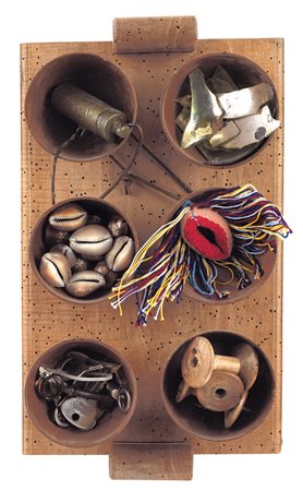 DANIEL SPOERRI Galati 1930 Les jeux de toujours, 2005 assemblaggio di legni, metallo e materiali vari cm. 37x20x12, firma, titolo e anno al retro, dichiarazione d'autenticità dell'artista e timbro della Fondazione Il Giardino di Daniel Spoerri (Seggiano-GR) su foto, entro teca in plexiglass.