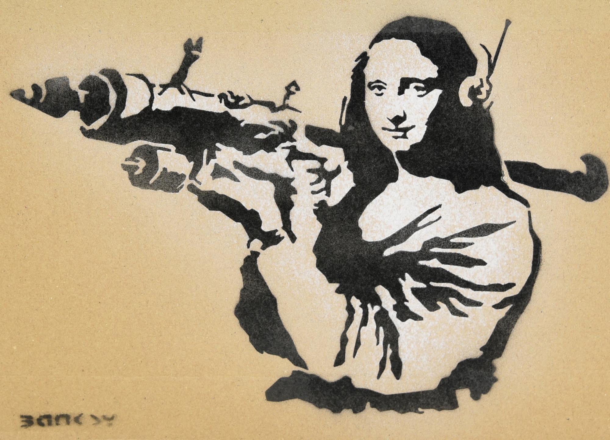 Banksy MONA LISA BAZOOKA sprayed stencil graffiti su cartone, cm 20x28,5; es....