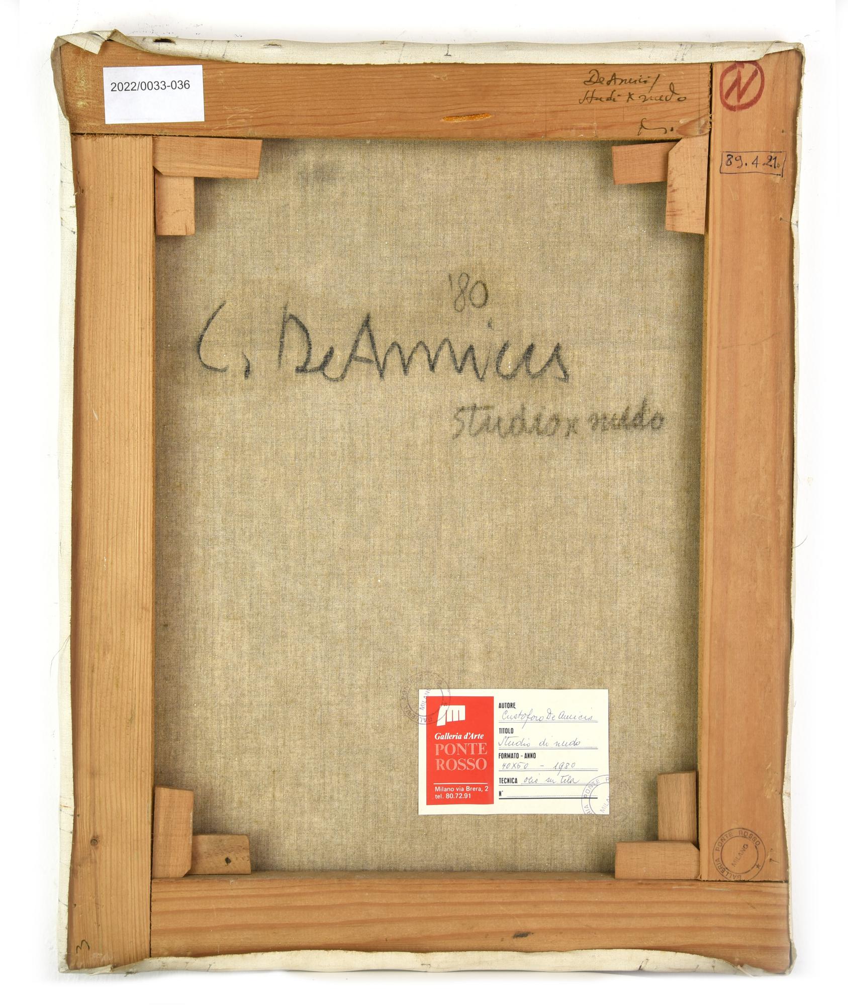 Cristoforo De Amicis STUDIO DI NUDO olio su tela, cm 50x40 firma sul retro:...