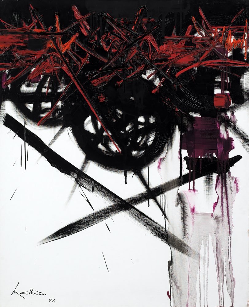 GEORGES MATHIEU Boulogne sur Mer 1921 - Boulogne-Bilancourt 12/06/2012 Senza titolo, 1986 olio su tela cm. 100x80, firma e anno in basso a sinistra, certificato di provenienza ed autenticità della Galleria Allegrini Arte Contemporanea (BS) allegato.