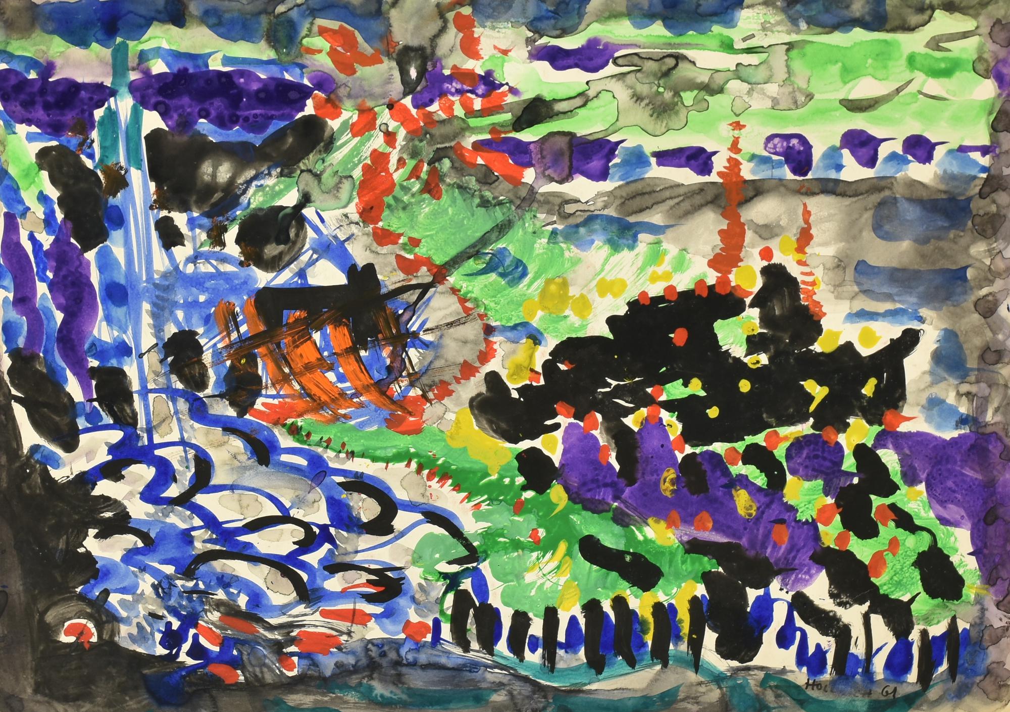 Carlo Hollesch COMPOSIZIONE tecnica mista su carta, cm 36x48 firma e data...