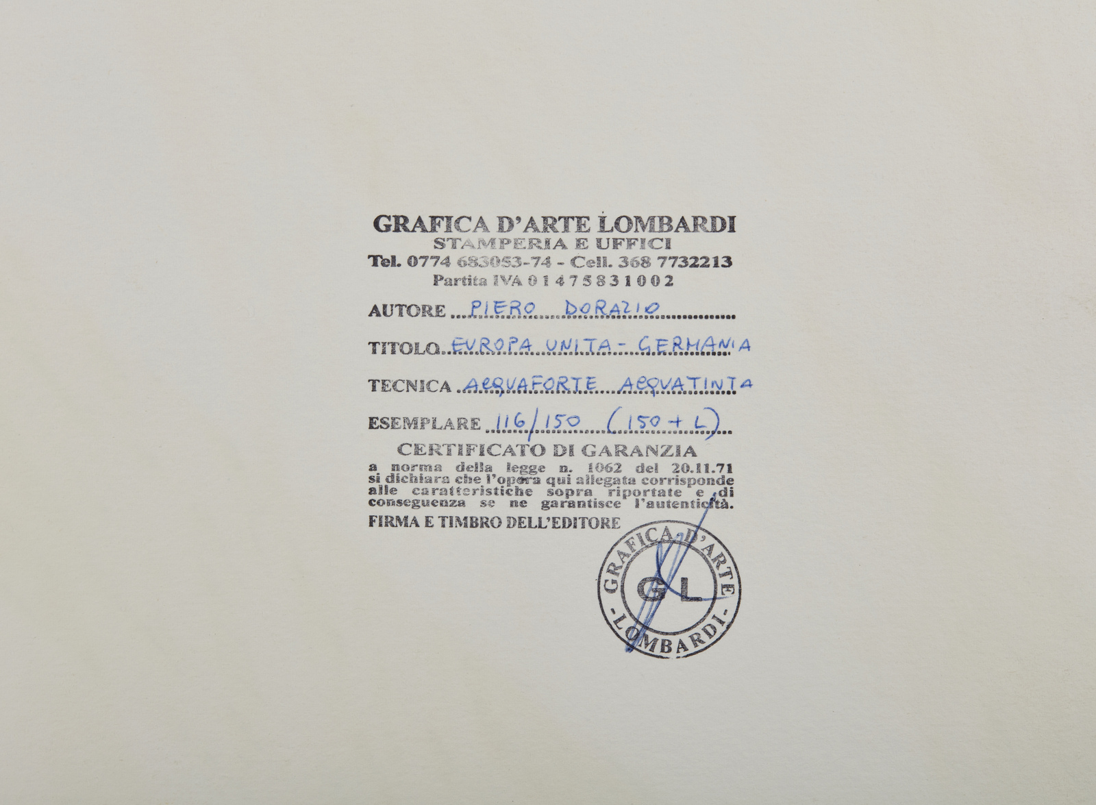 DORAZIO PIERO (1927 - 2005) Europa Unita, Germania. 1992. Acquaforte e acquatinta. Cm 76,00 x 58,00. 116/150. Tiratura, firma e anno in basso a matita. Timbro a secco Grafica d'Arte Lombardi, Roma, in basso a sinistra. Edizione totale: 150+L esemplari. Dimensione lastra: 58x76 cm. Stampatore: Grafica d'Arte Lombardi, Roma. Pubblicazioni: Piero Dorazio. L'opera incisa (1962-1993), a cura di Gabriele Simongini, Edizioni Pananti, Firenze, 1997.