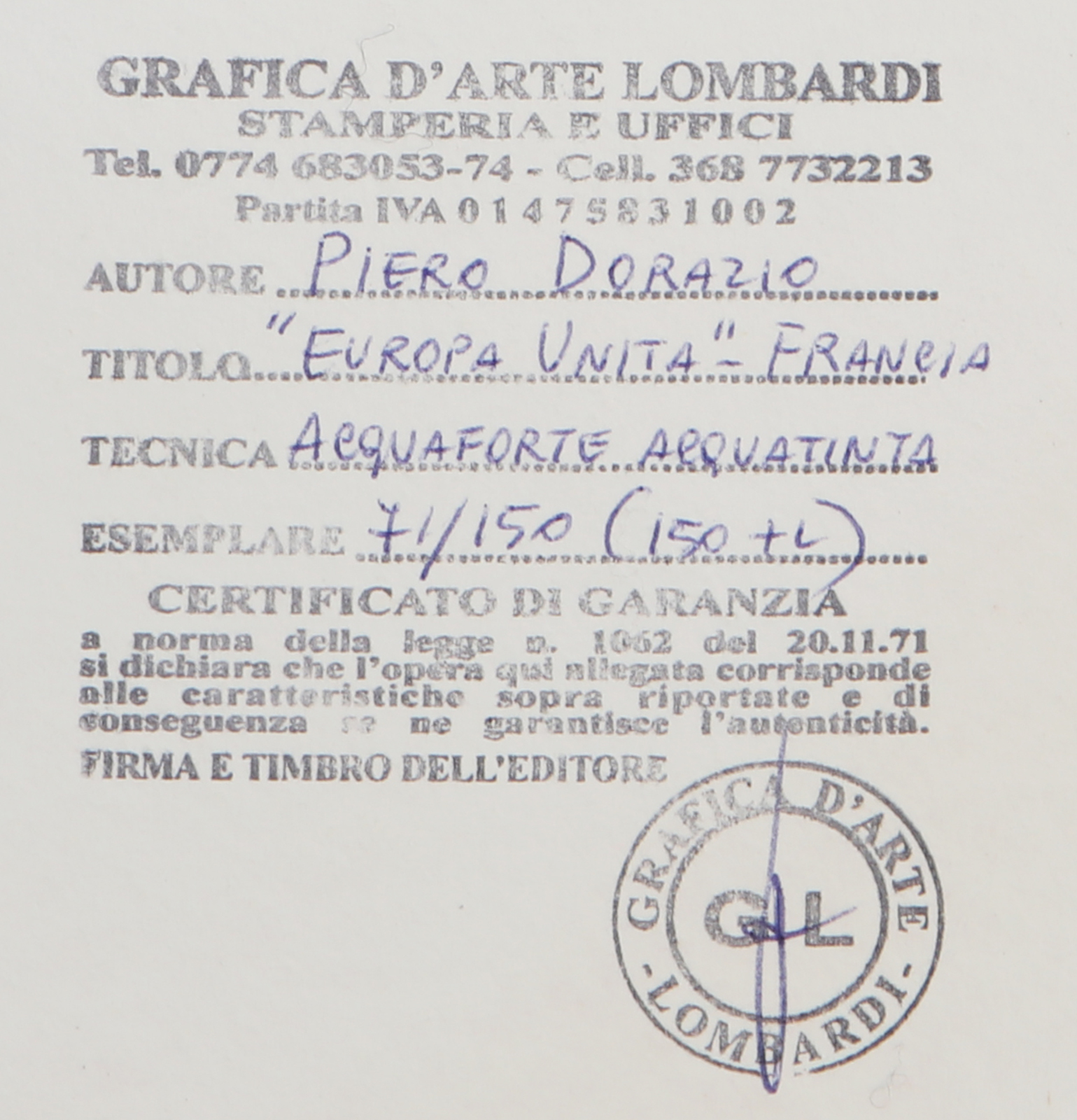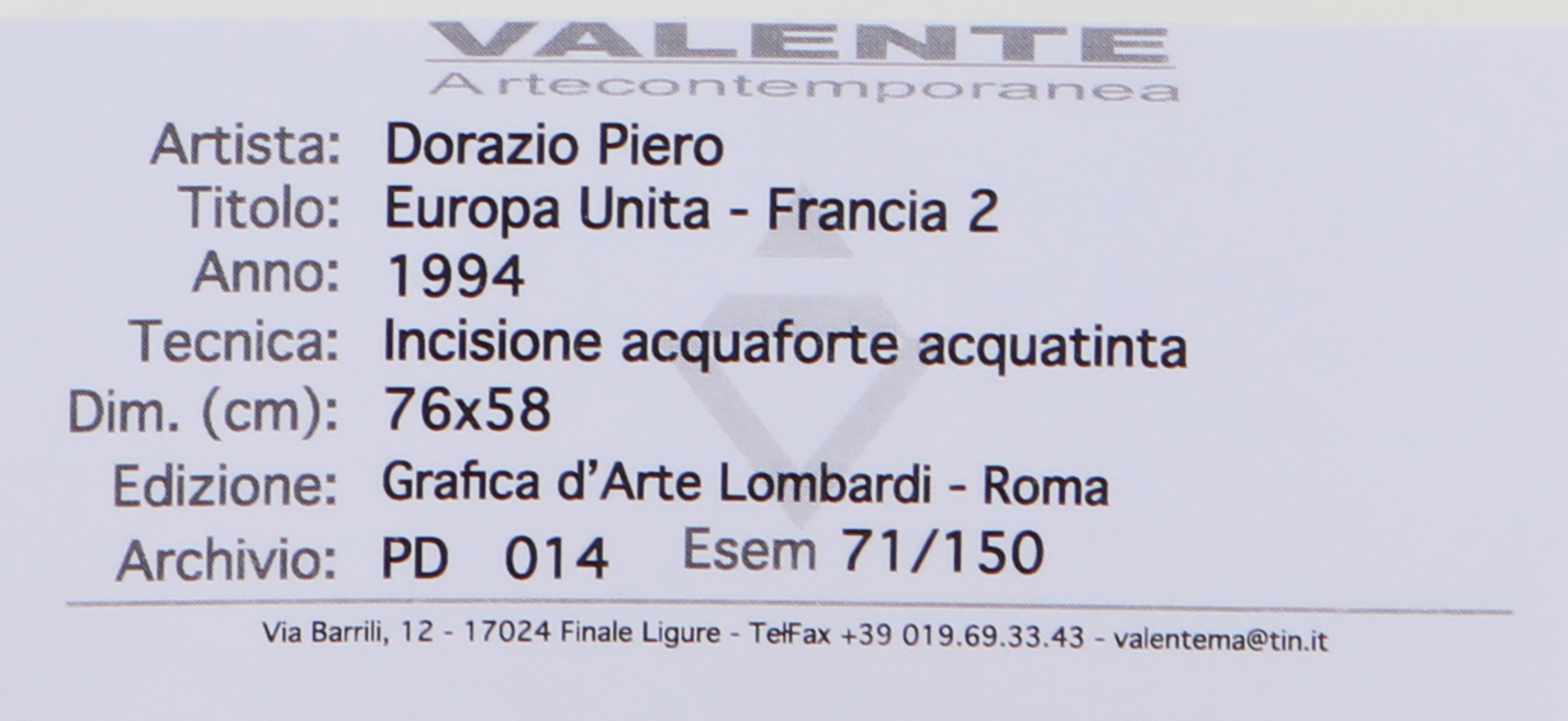 DORAZIO PIERO (1927 - 2005) Europa Unita - Francia 2. 1994. Acquaforte. Cm 58,00 x 76,00. 71/150. Tiratura, firma e anno in basso a matita. Timbro a secco - Grafica D'Arte Lombardi, Roma - in basso a sinistra. Al retro timbro - Grafica D'Arte Lombardi, Roma e cartiglio descrittivo Valente Arte Contemporanea, Finale Ligure.