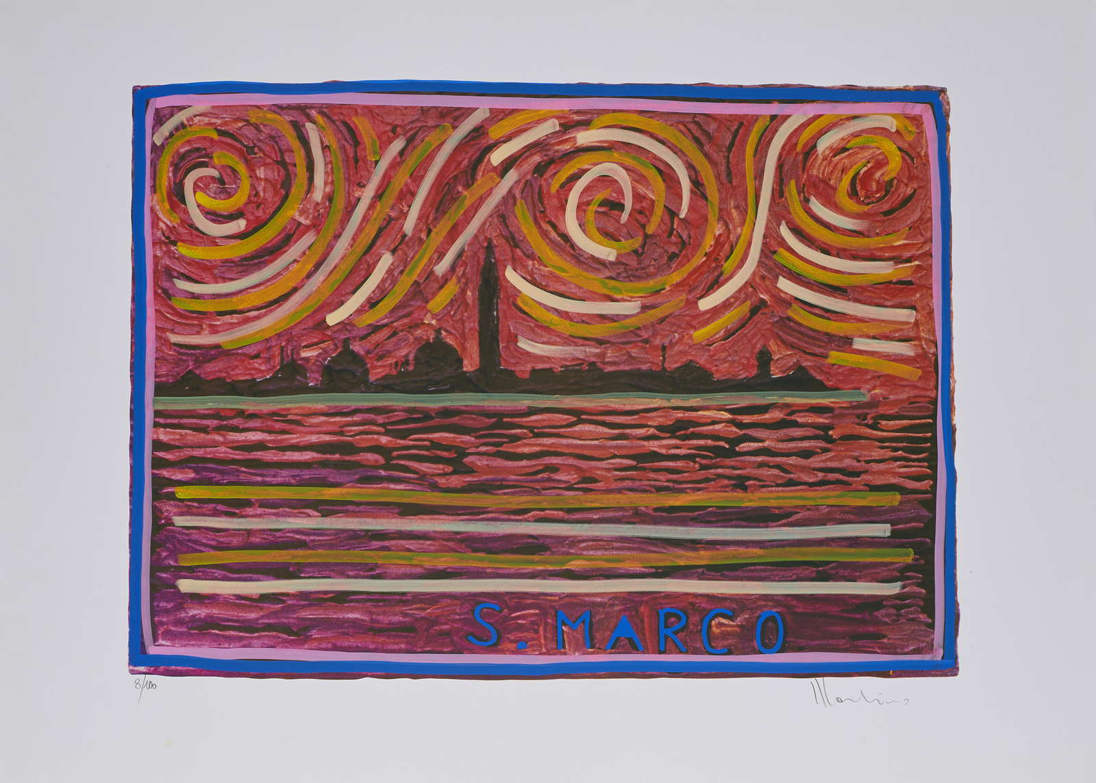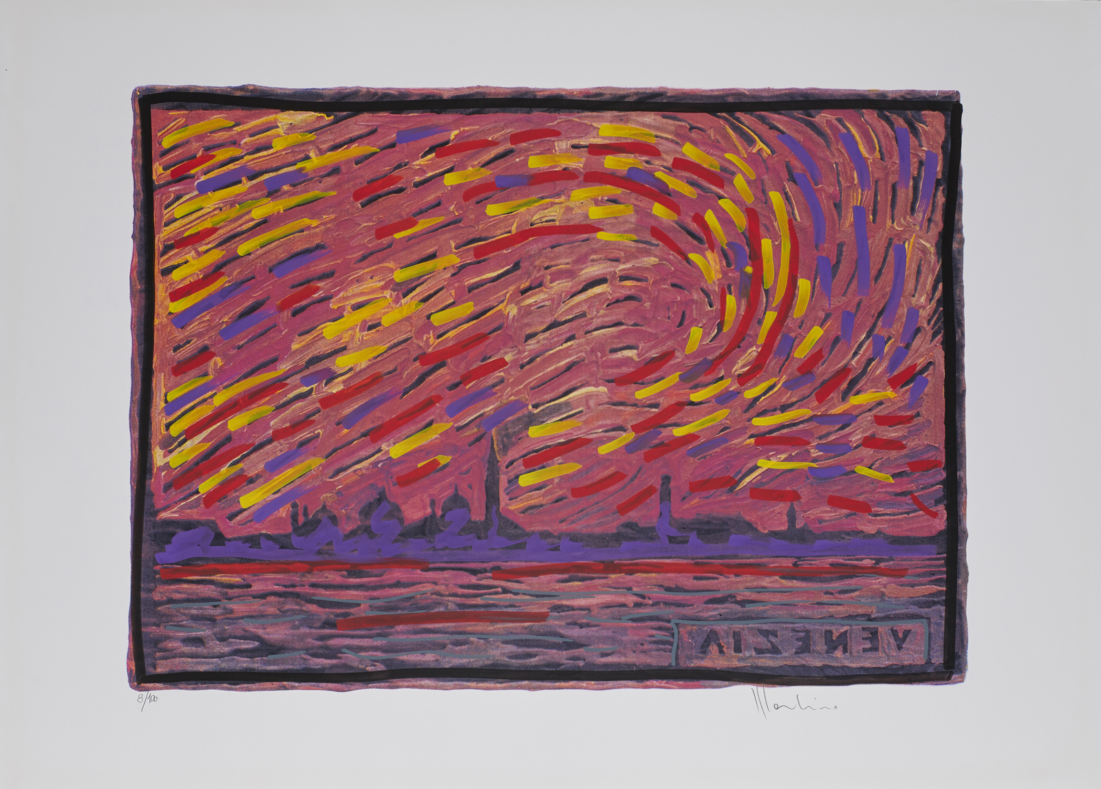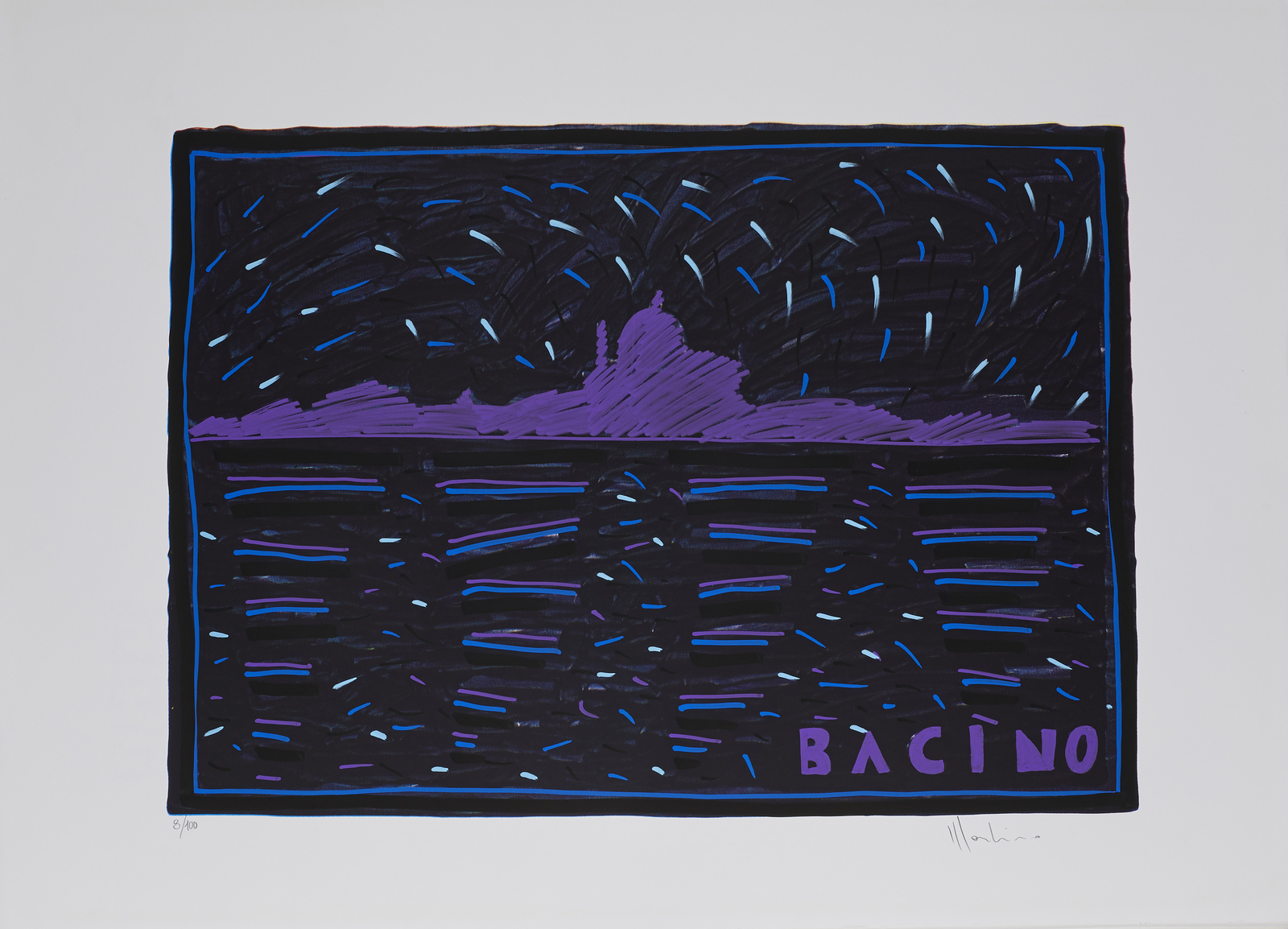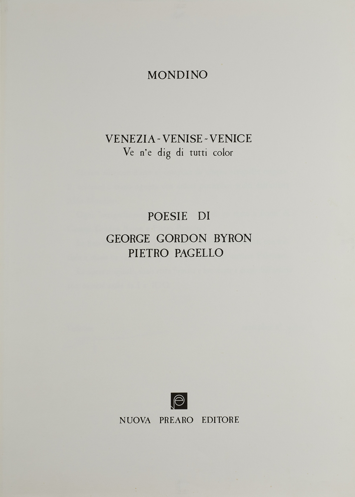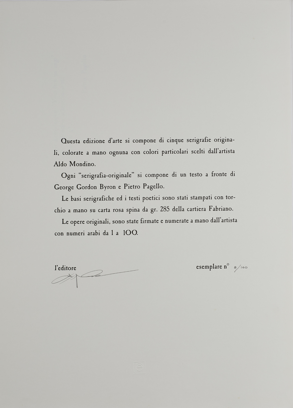 MONDINO ALDO (1938 - 2005) Cartella composta da n.5 fogli. Venezia - Venise - Venice Ve n'e dig di tutti color. 1986. Serigrafia ritoccata a mano. Cm 50,00 x 70,00. 8/100. Tiratura e firma in basso a matita su ogni grafica. Si segnala che la quarta serigrafia è numerata 9/100. Cartella composta da cinque serigrafie originali, colorate a mano ognuna con colori particolari scelti dall'artista. Ogni "serigrafia-originale" si compone di un testo a fronte di George Byron e Pietro Pagello. Le basi serigrafiche e i testi poetici sono stati stampati con torchio a mano su carta rosa spina da gr. 285 della cartiera Fabriano. Edizione totale composta da 100 esemplari contrassegnati in numeri arabi. Nuova Prearo Editore. Lievi difetti.