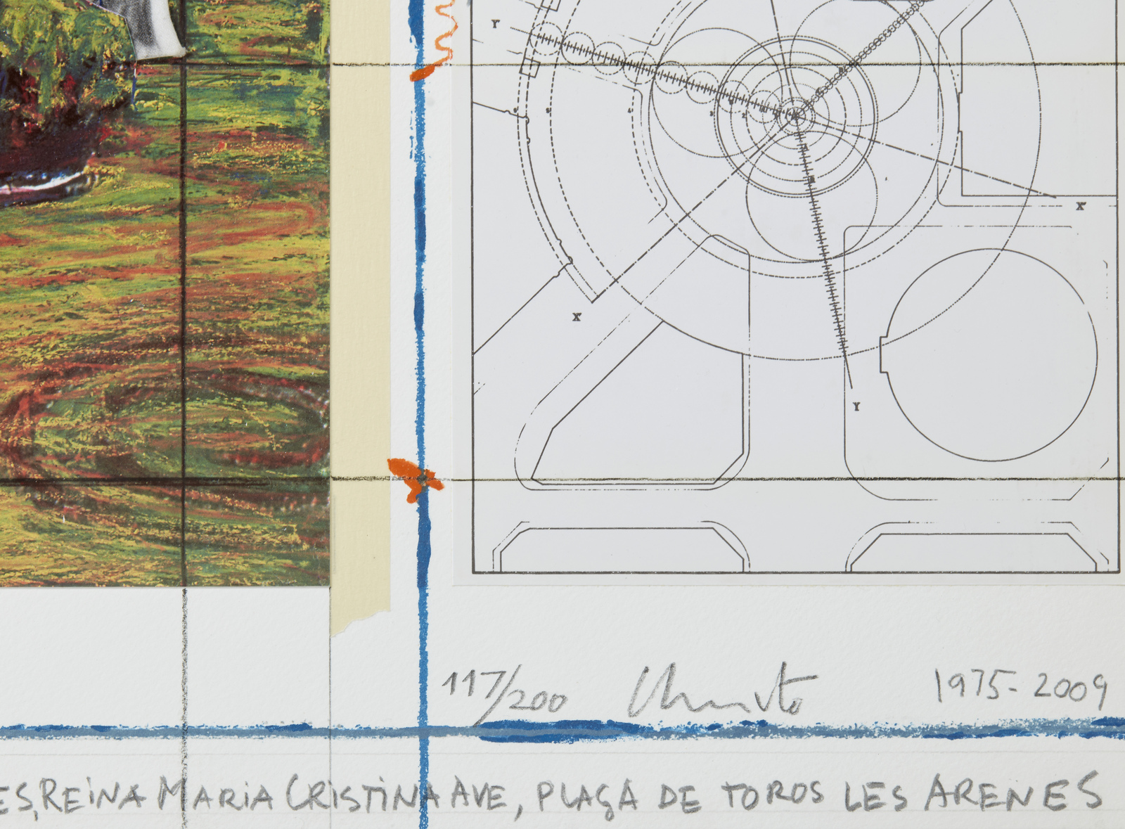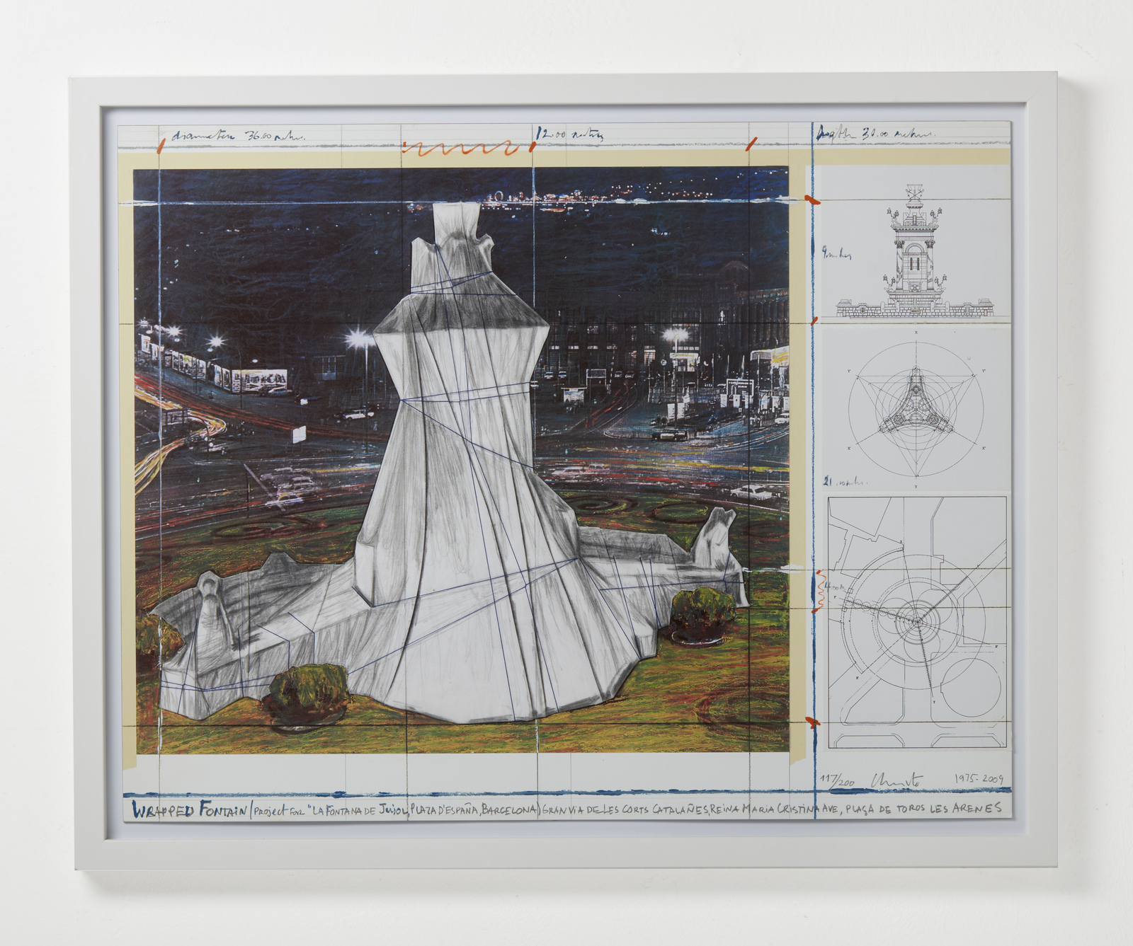 CHRISTO' (n. 1935) & JEANNE-CLAUDE (1935 - 2009) Wrapped Fontain, Project for "La Fontana de Jujol", Plaza d'España, Barcelona. Litografia e collage. Cm 71,50 x 56,00. 117/200. Tiratura, firma e anno in basso a destra a matita. Titolo in basso al centro. Edizione totale: 200 + 30 HC + XXXV AP. Carta: Somerset Velvet. Editore e stampatore: La Poligrafa, Barcelona. Pubblicazioni: Christo and Jean - Claude, prints and objects, Catalogo Ragionato, Jorg Schellmann, tav. 202, p. 231. Certificato di autenticità Poligrafa Obra Grafica, Barcelona. 1975-2009. Cornice presente