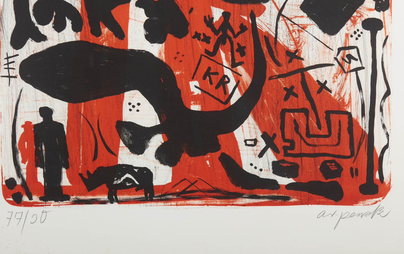 PENCK A.R. (n. 1939) Homage to Beuys. 1989. Litografia. Cm 60,00 x 80,00. 77/90. Tiratura e firma in basso a matita. Al retro timbro e cartiglio Lucio Amelio, Napoli. Edizione totale: 90+XXX esemplari. Lievi difetti. Cornice presente
